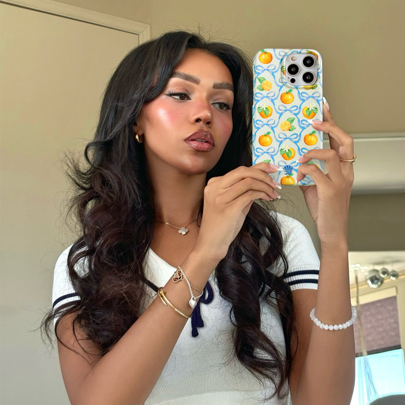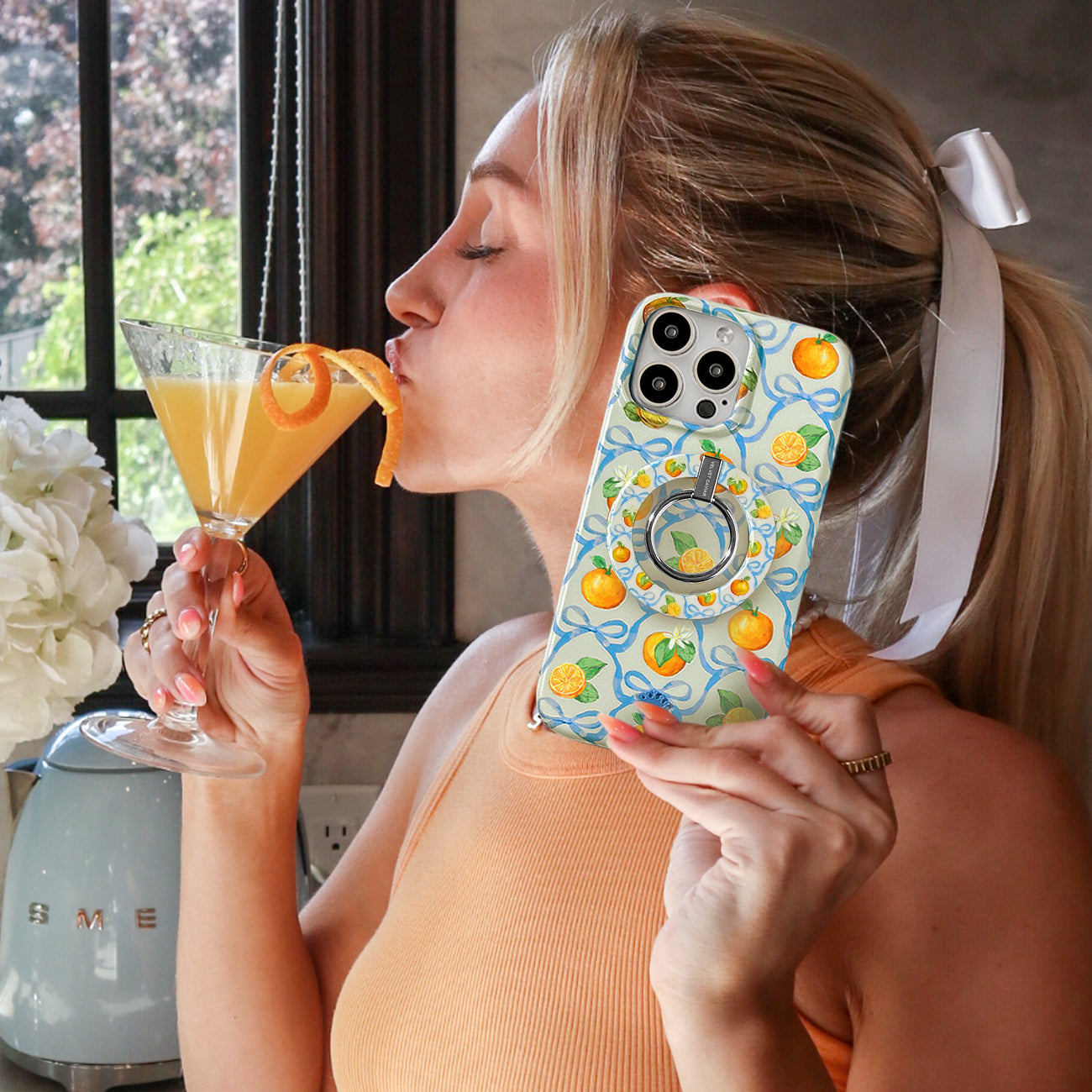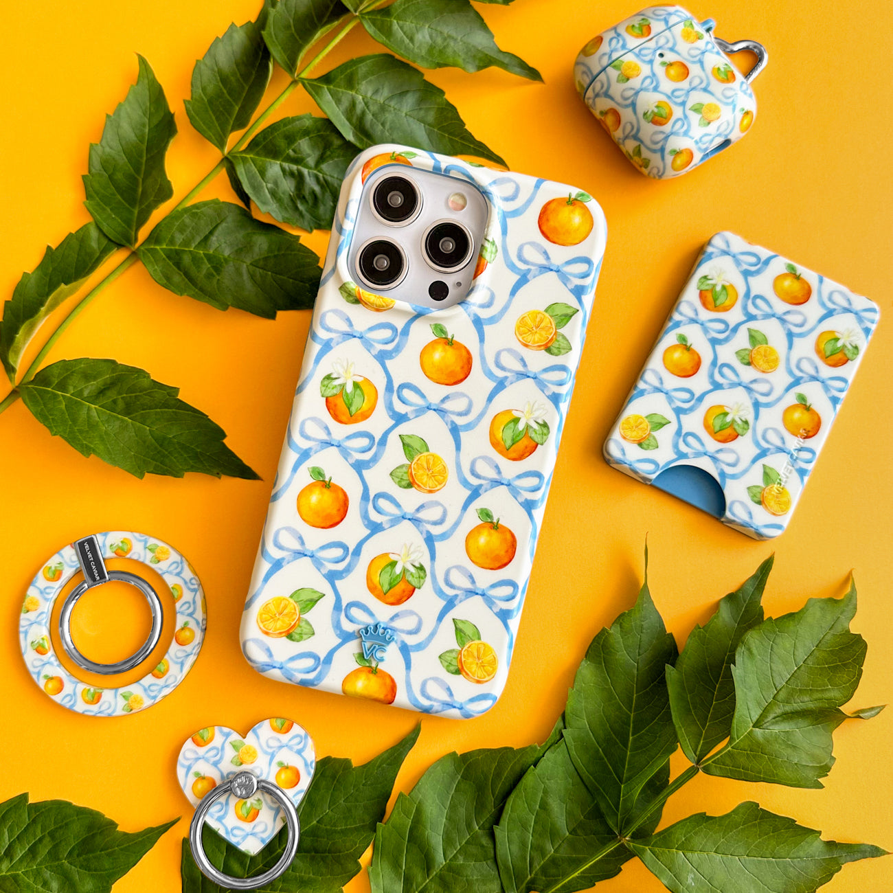 Sweet Summertime! This MagSafe phone case features juicy watercolor oranges and blue ribbon bows in a trellis pattern with a contrasting cerulean bumper.