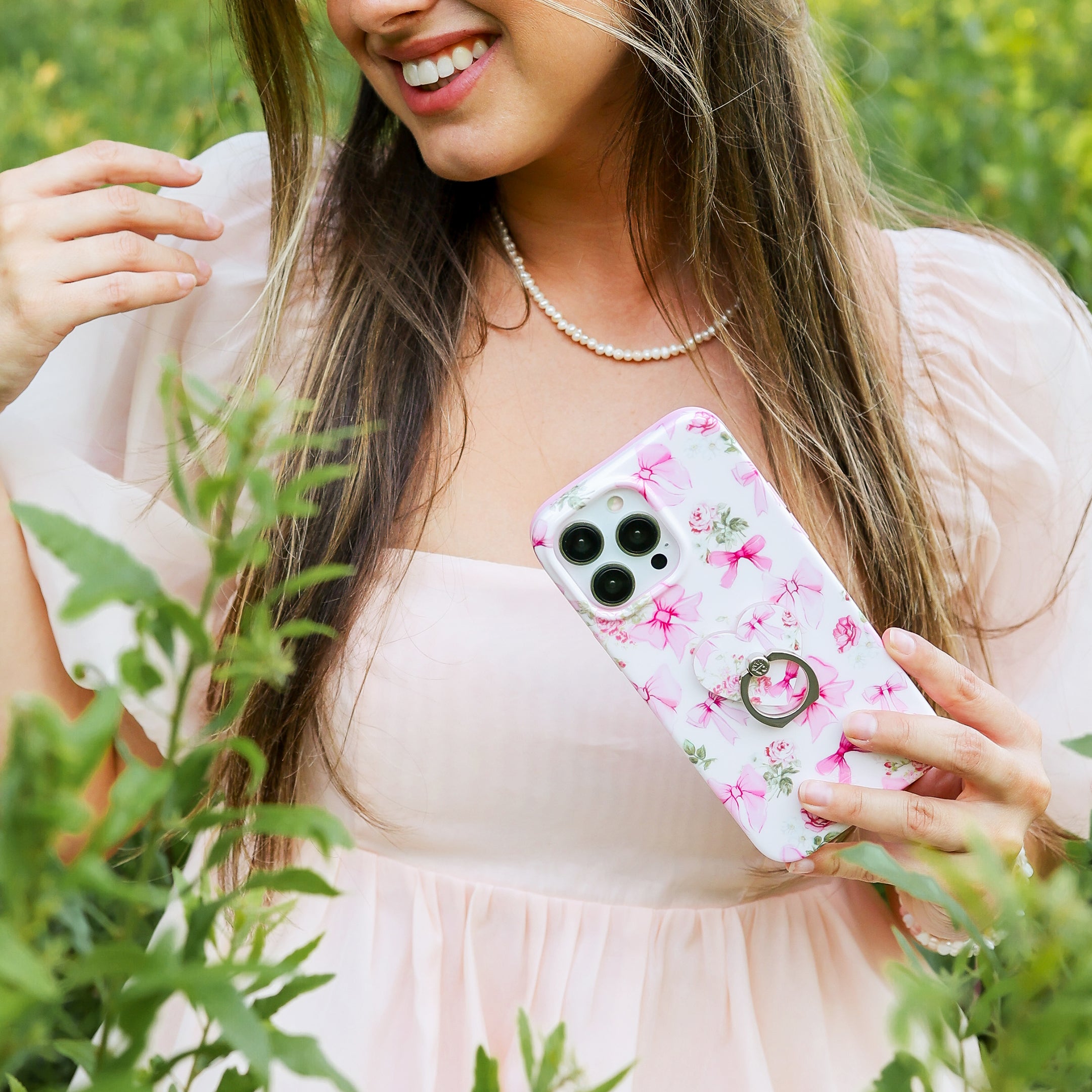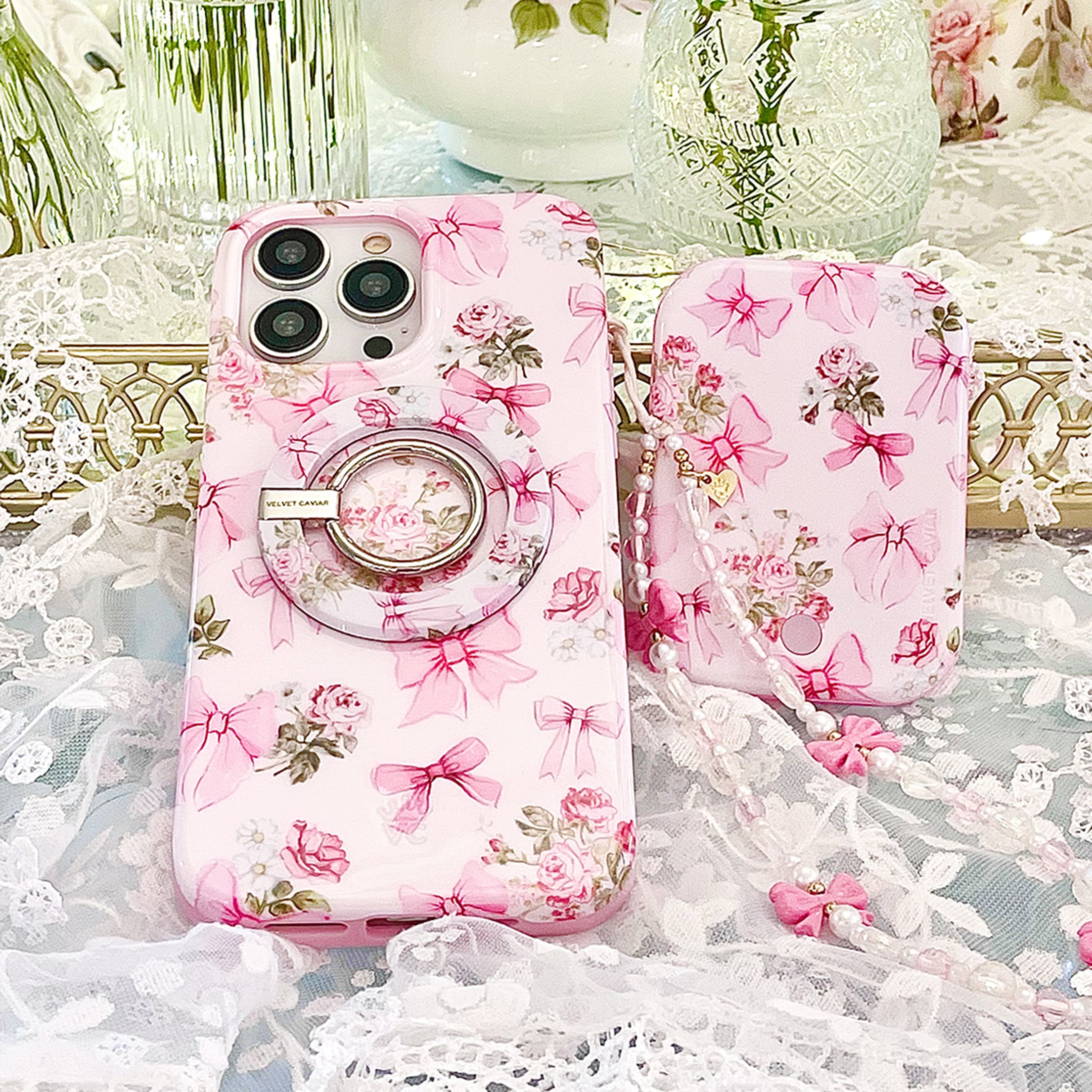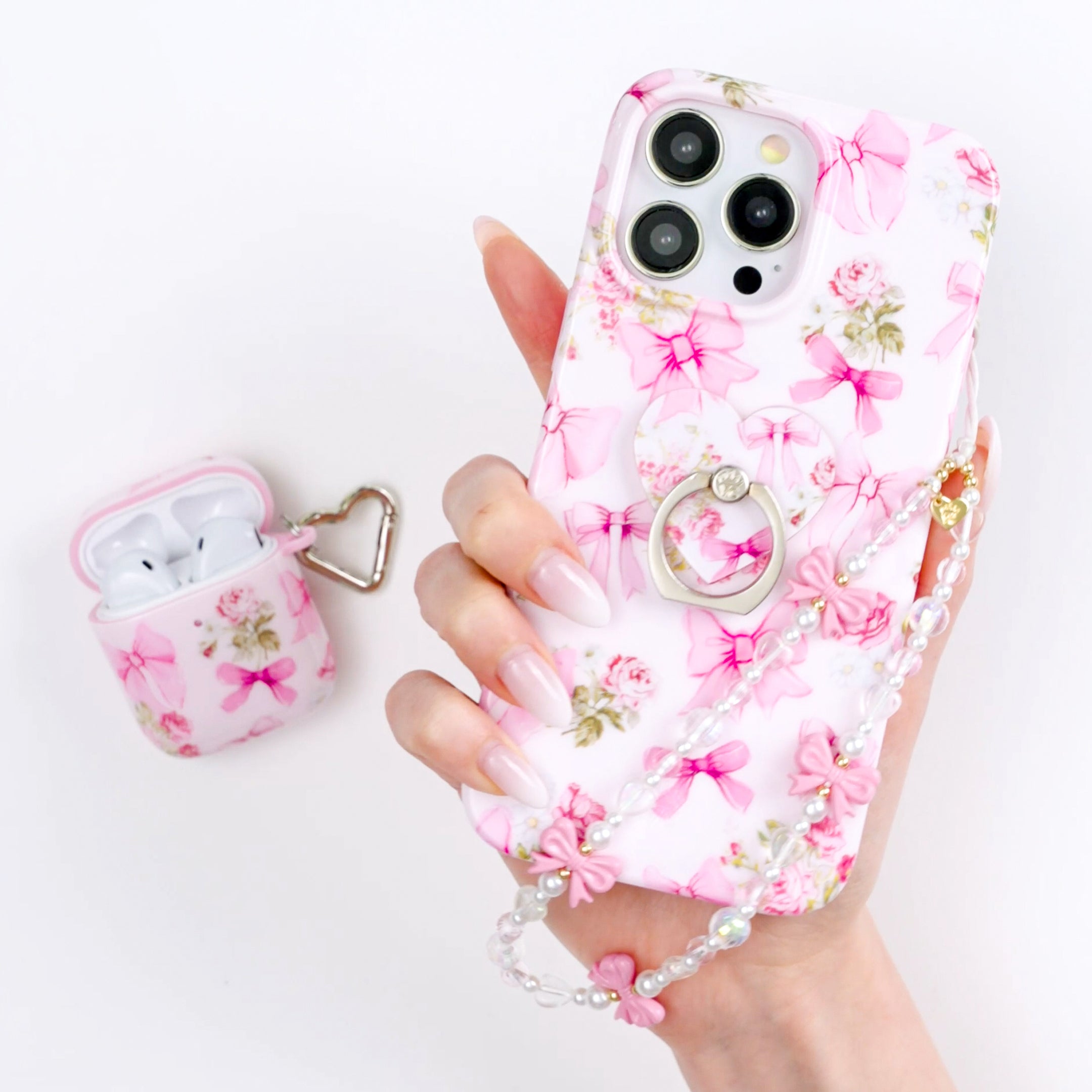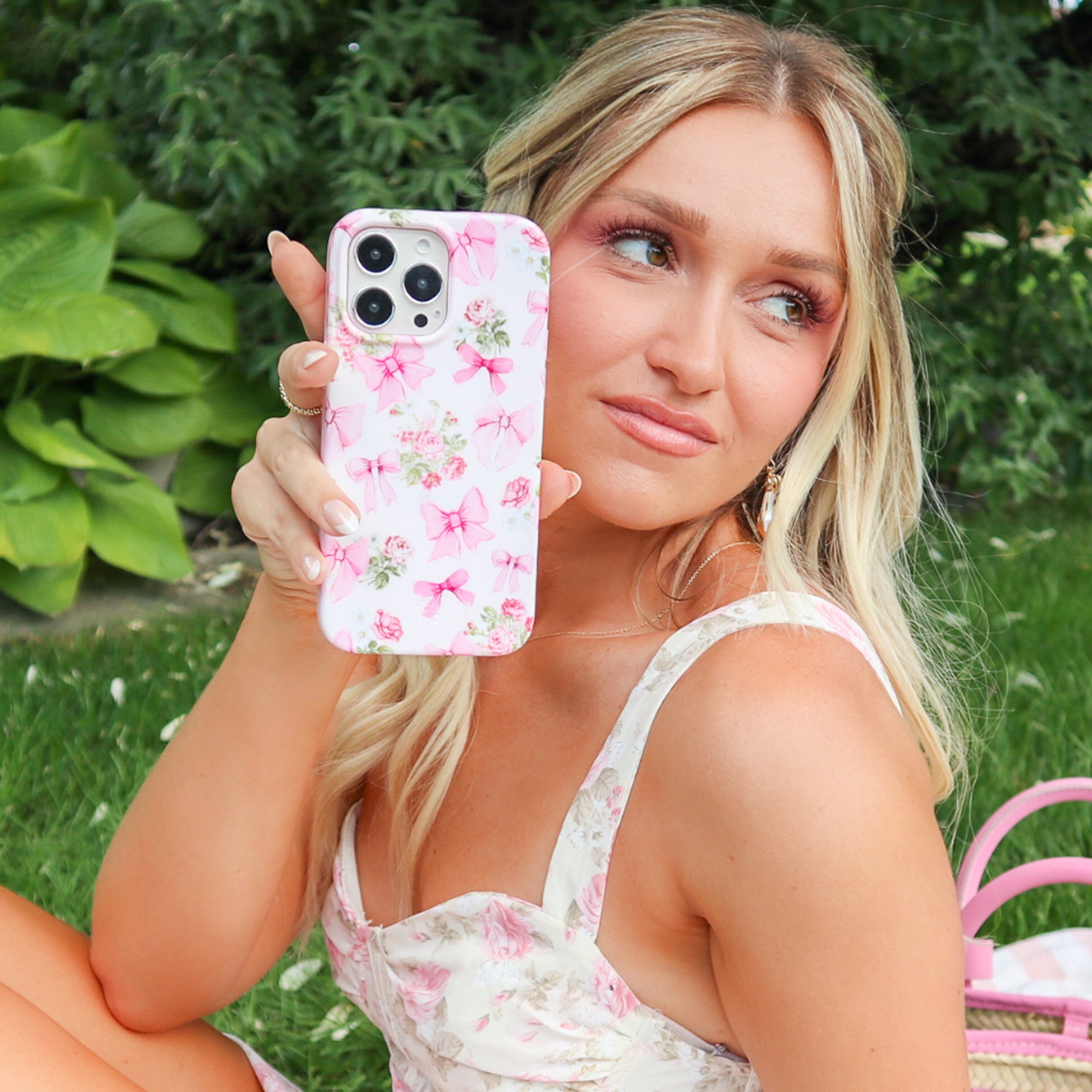 Coquette Core! This protective case features an array of romantic hand drawn bows and bouquets on a glossy pale pink base.