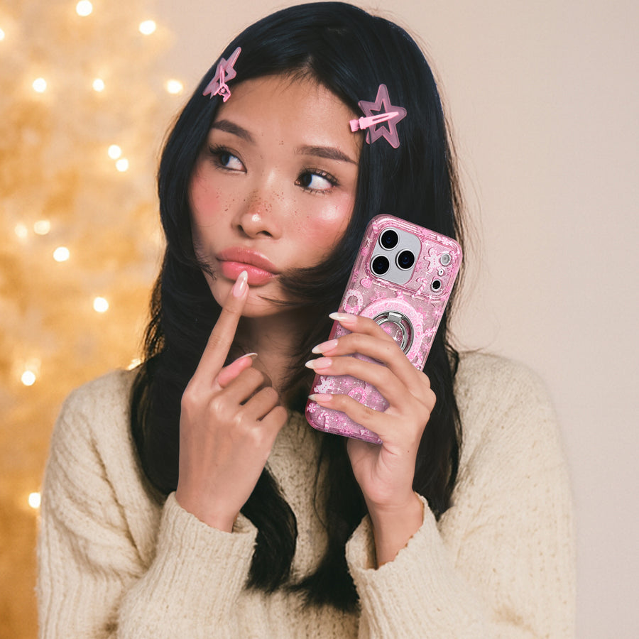 Happy Holidays! This transparent pink protective case has silver glitter sprinkled into the base and bumper and is covered in adorable holiday motifs. This case is part of our Limited Edition Holiday Dreams collection celebrating Christmas and Hanukkah.