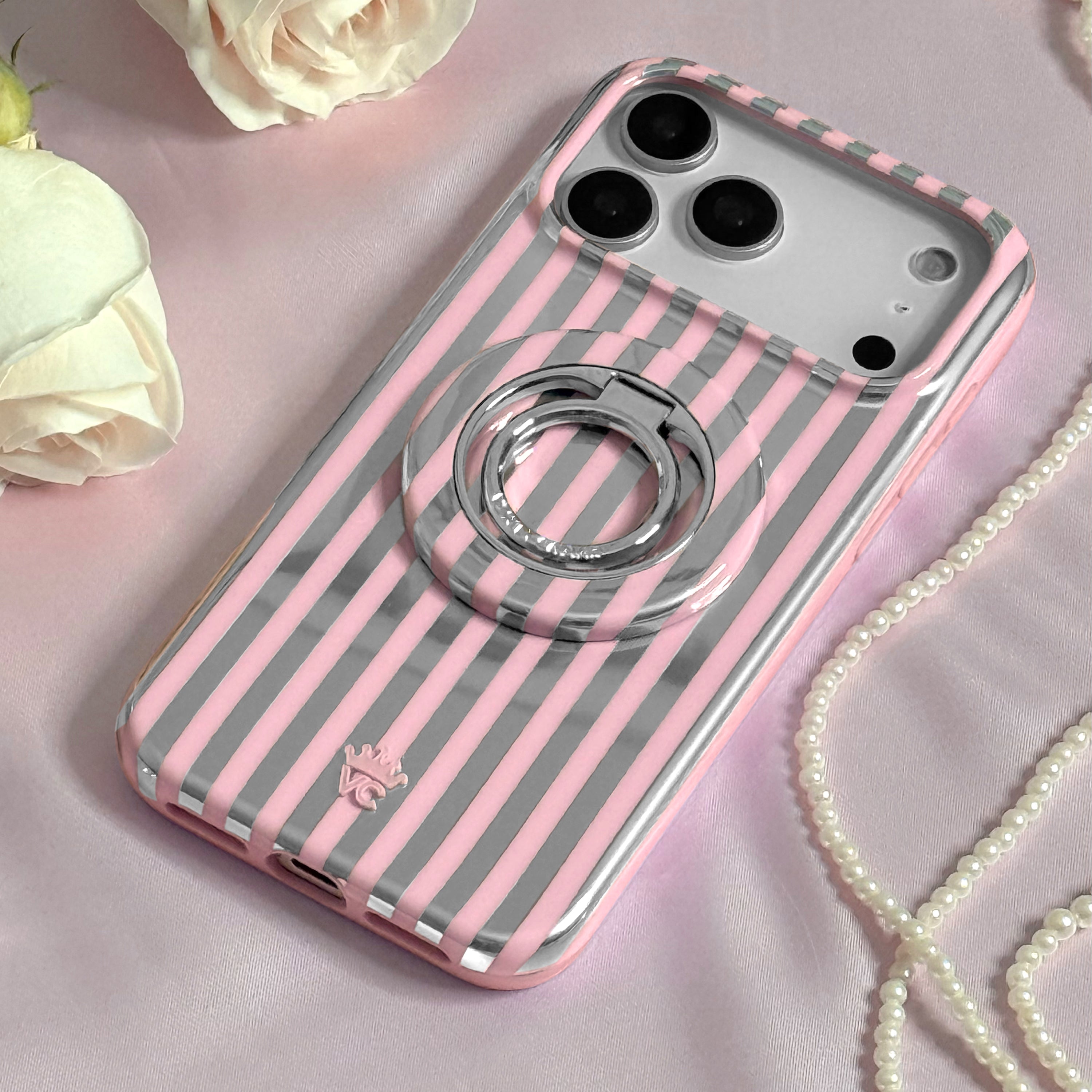 Pretty in Pink! This MagSafe case features glossy baby pink and silver chrome stripes throughout.