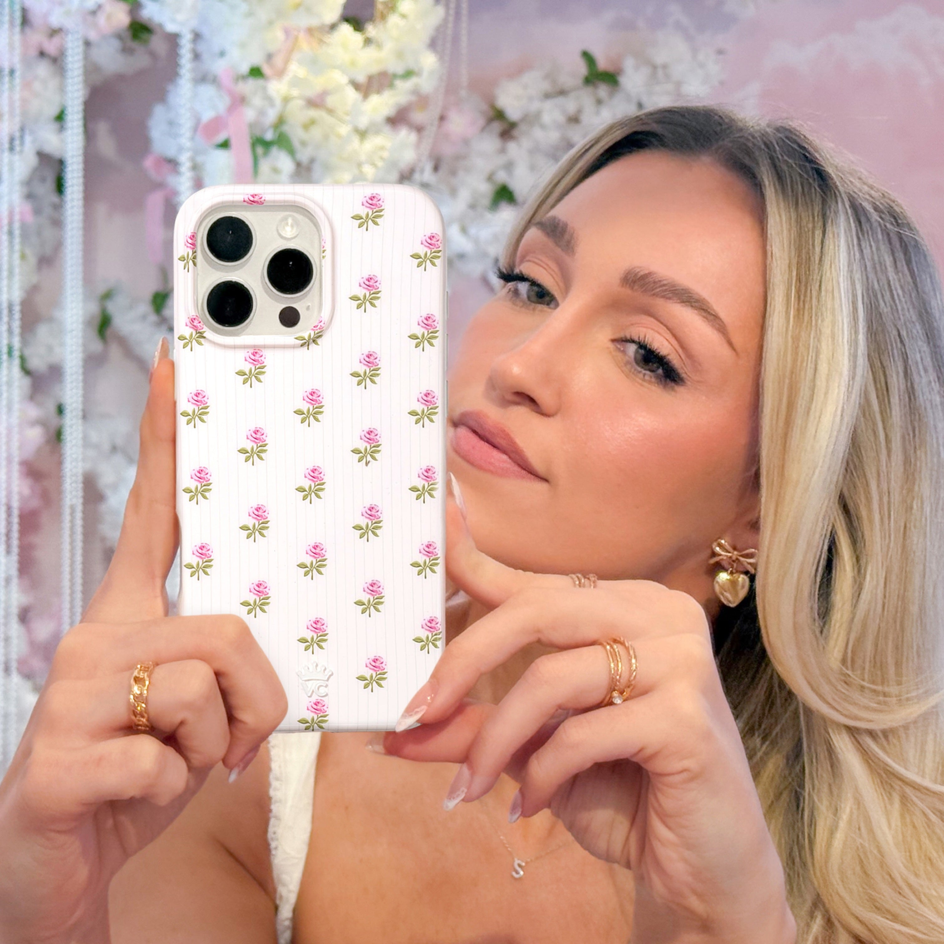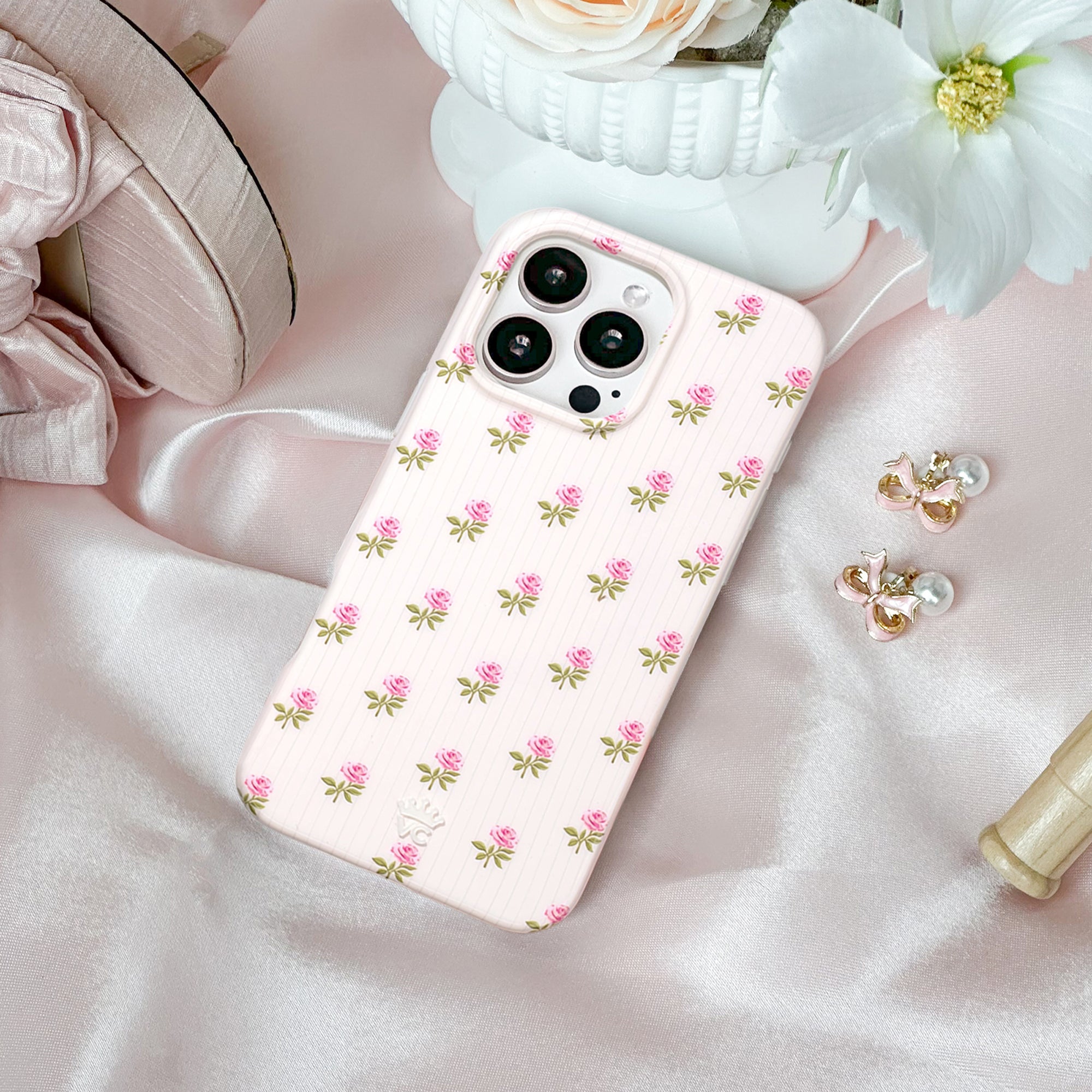 Dainty and darling! This Limited Edition MagSafe case features delicate pink florals with light vintage line details throughout all on a glossy off-white base and matching bumper.