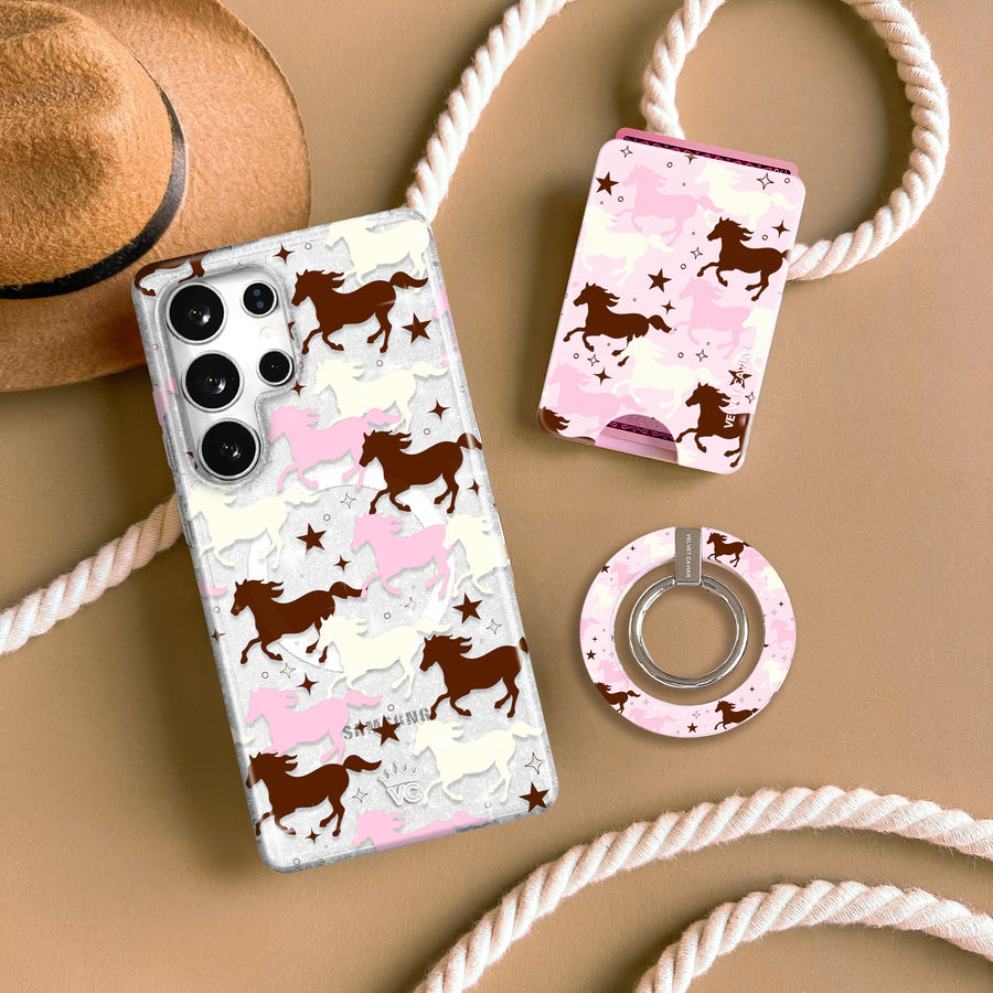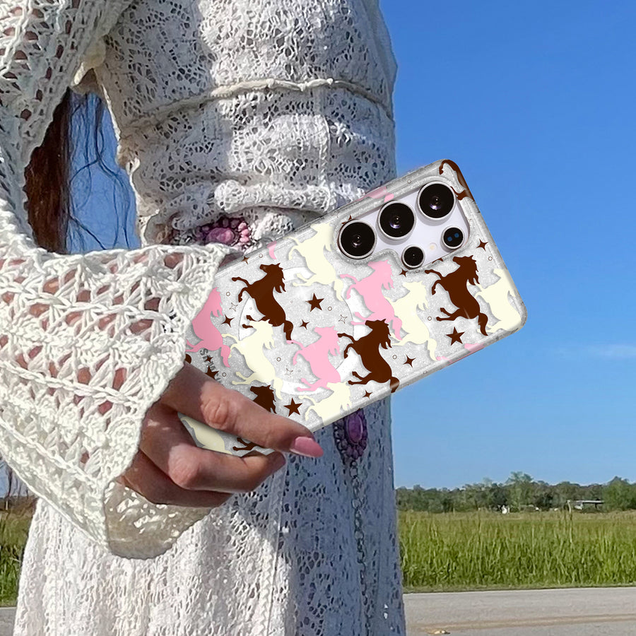 Meet us at the main stage! This festival-inspired case features pink, white, and brown horses all on a clear case with silver glitter sprinkled into the base and bumper.