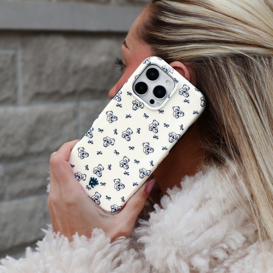 Precious and polished! This Limited Edition case features timeless navy blue teddy bears on a light cream base with vintage inspired lines throughout and a contrasting navy bumper.