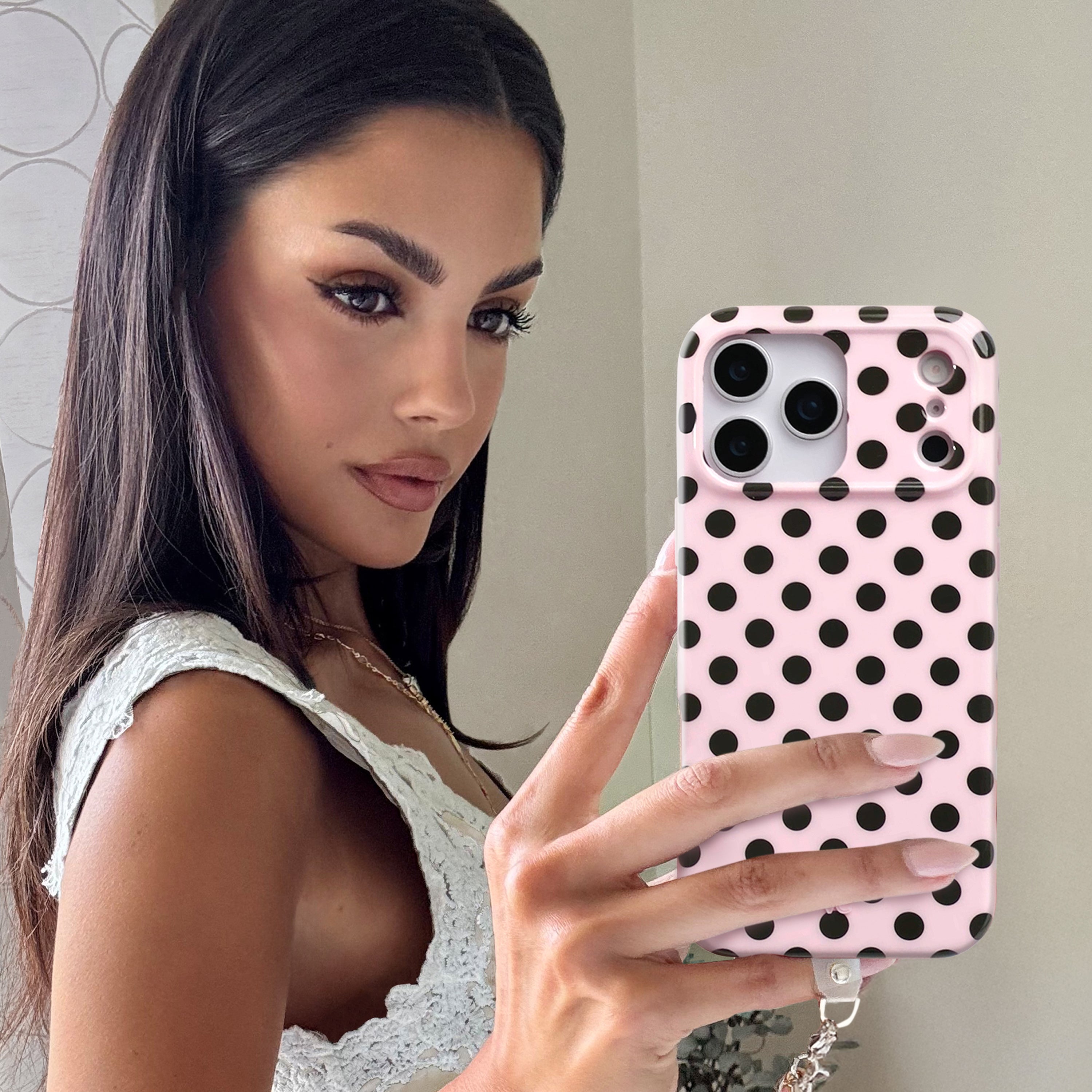 Playful and posh! This simple MagSafe case features trending black polka dots on a baby pink base.