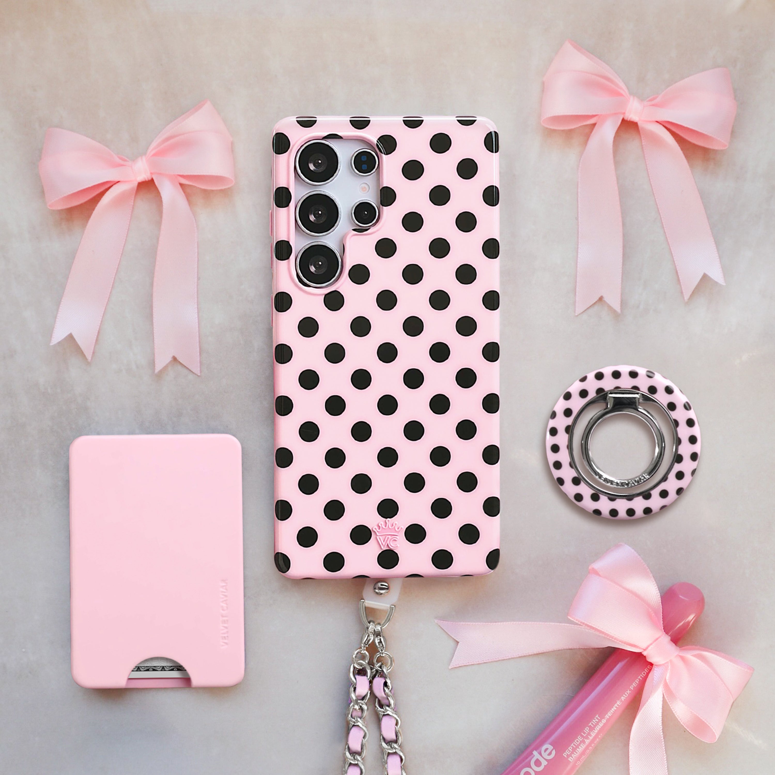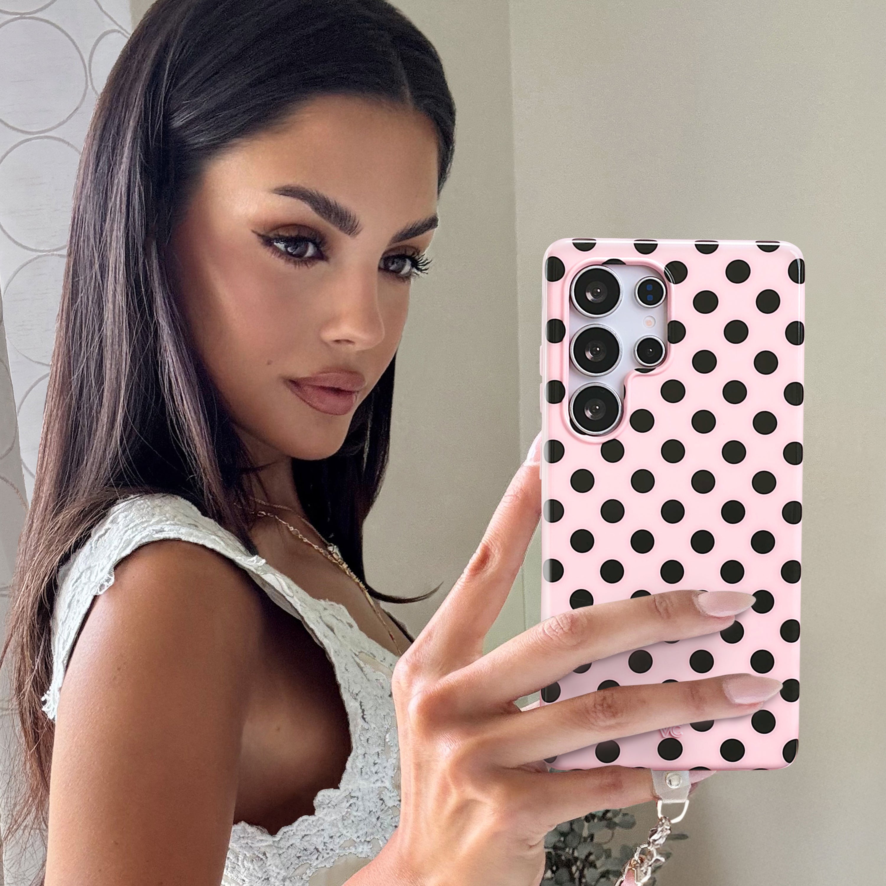 Playful and posh! This simple protective case features trending black polka dots on a baby pink base.