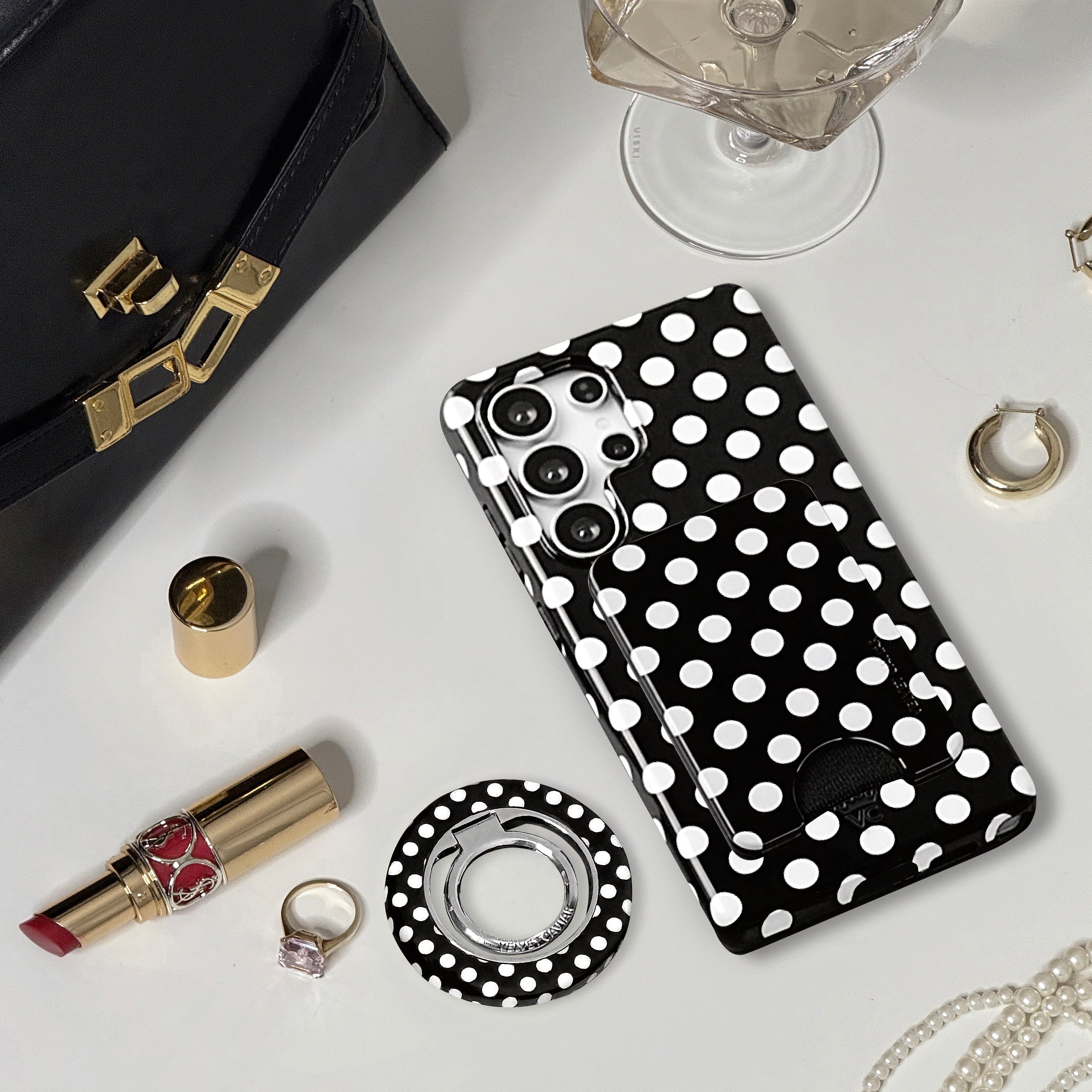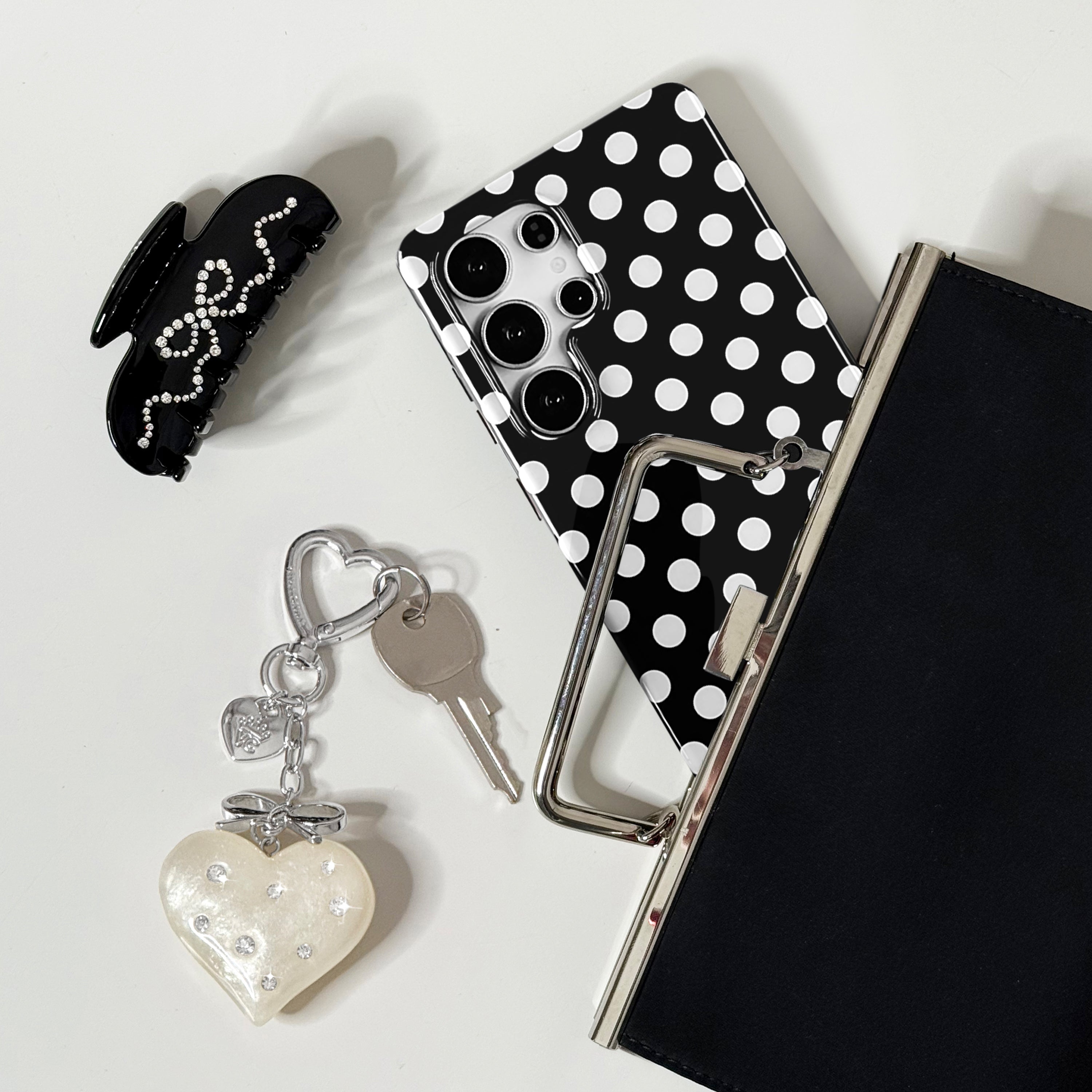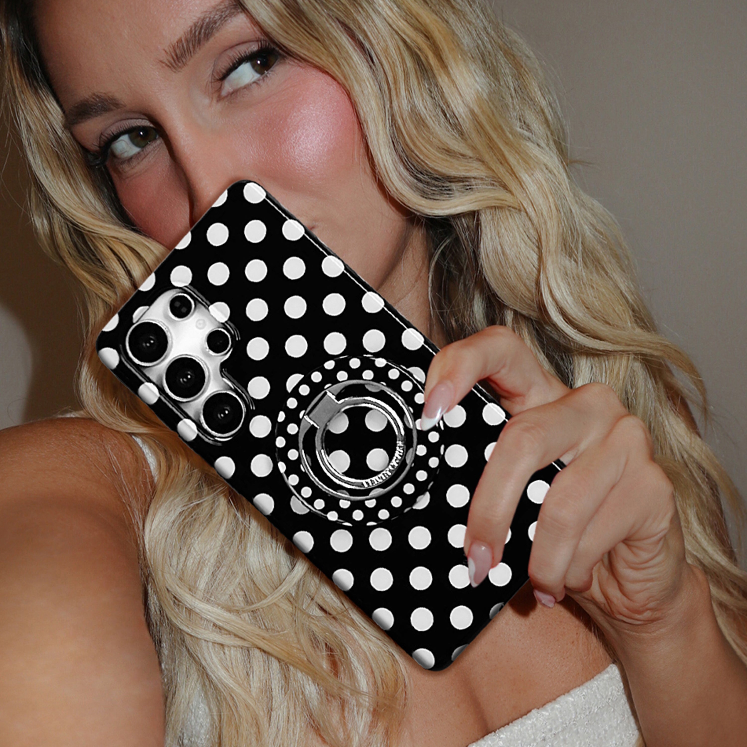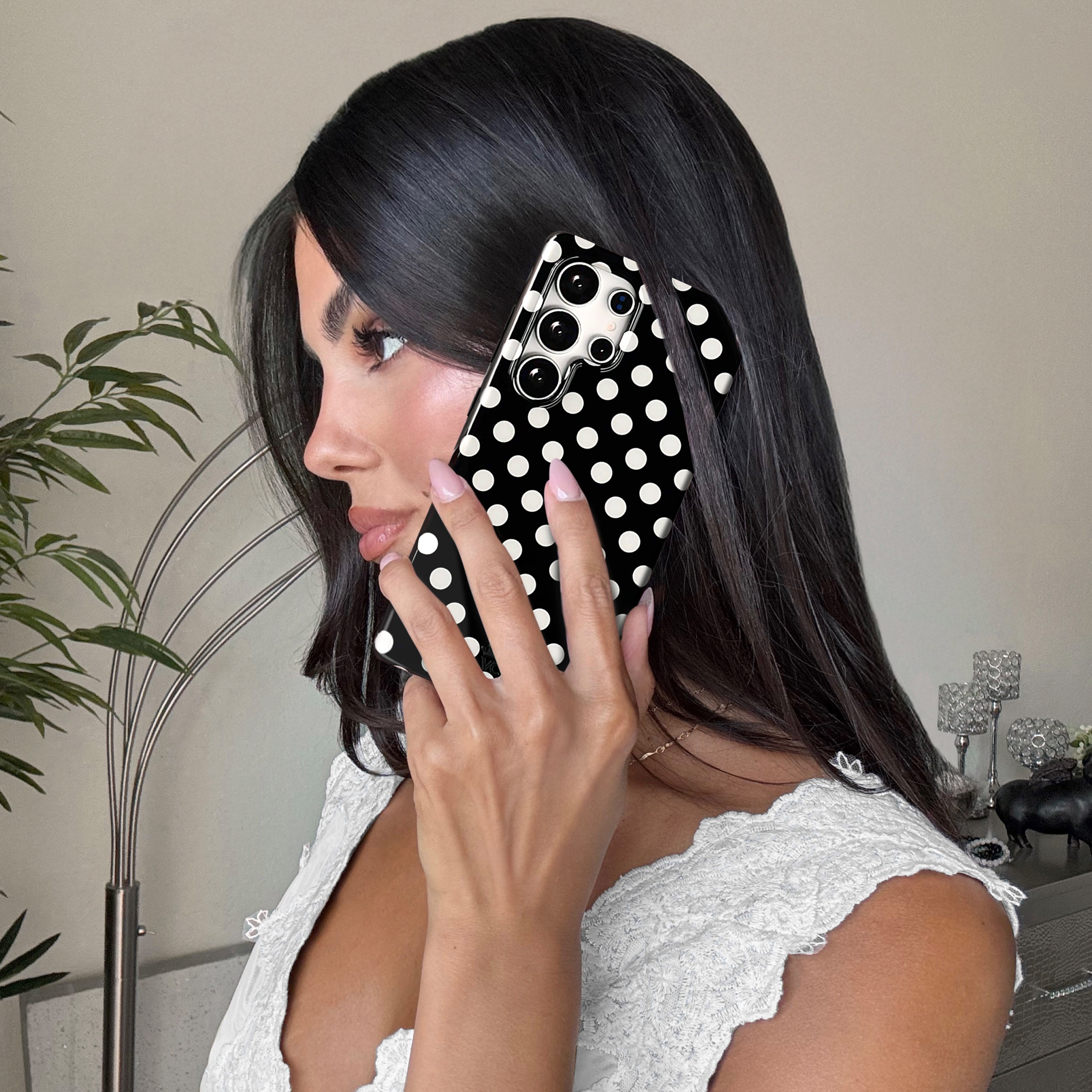 Playful and posh! This simple protective case features trending white polka dots on a glossy black base.
