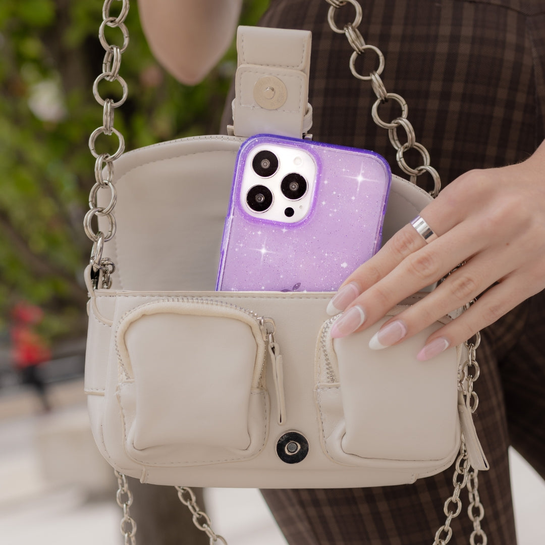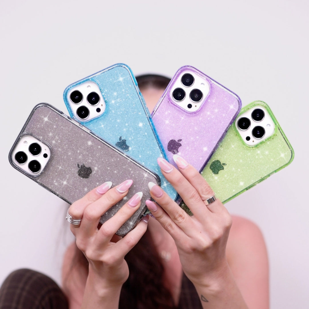 Baby you're a star! Featuring silver glitter sprinkled in a purple clear case with a gloss finish.