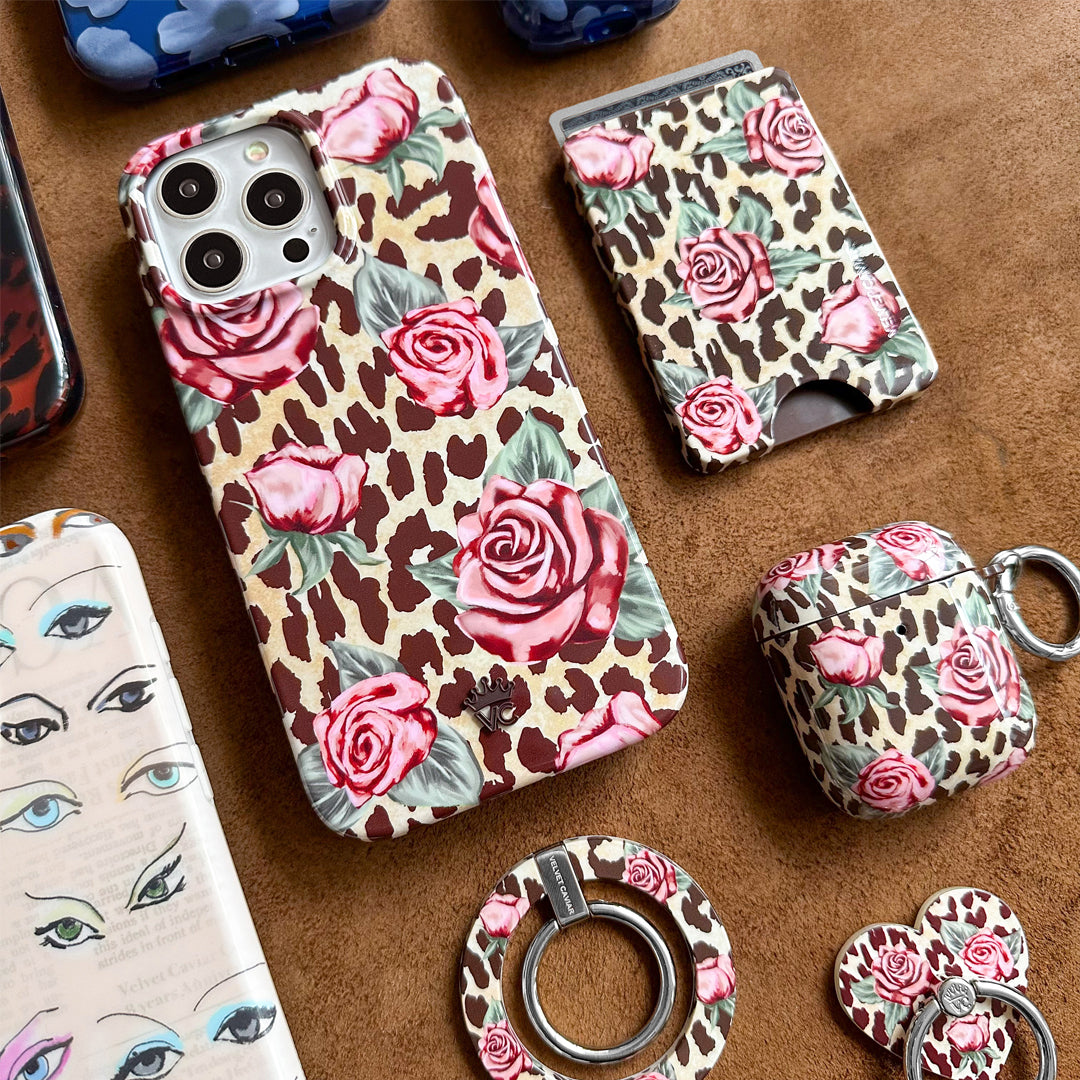 It-Girls Only! This fierce MagSafe case features expressive pink rose florals and brown leopard spots on a warm neutral base with a matching brown bumper.