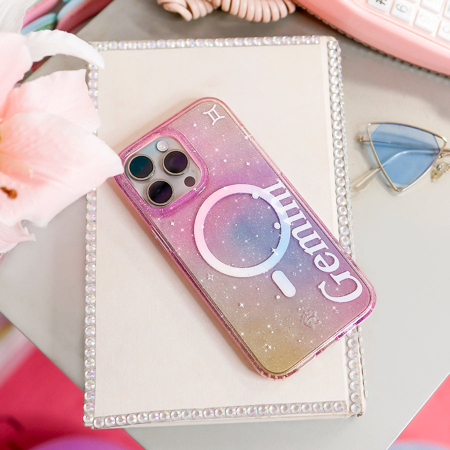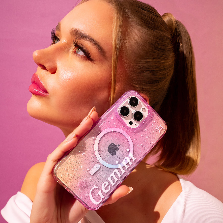 Gemini's are Charming, Clever, and Curious! This MagSafe case comes in a gorgeous airy pastel colorway inspired by the unique elements of Gemini with silver glitter sprinkled into the base and bumper. This case is part of our Zodiac Collection in collaboration with Sanctuary™