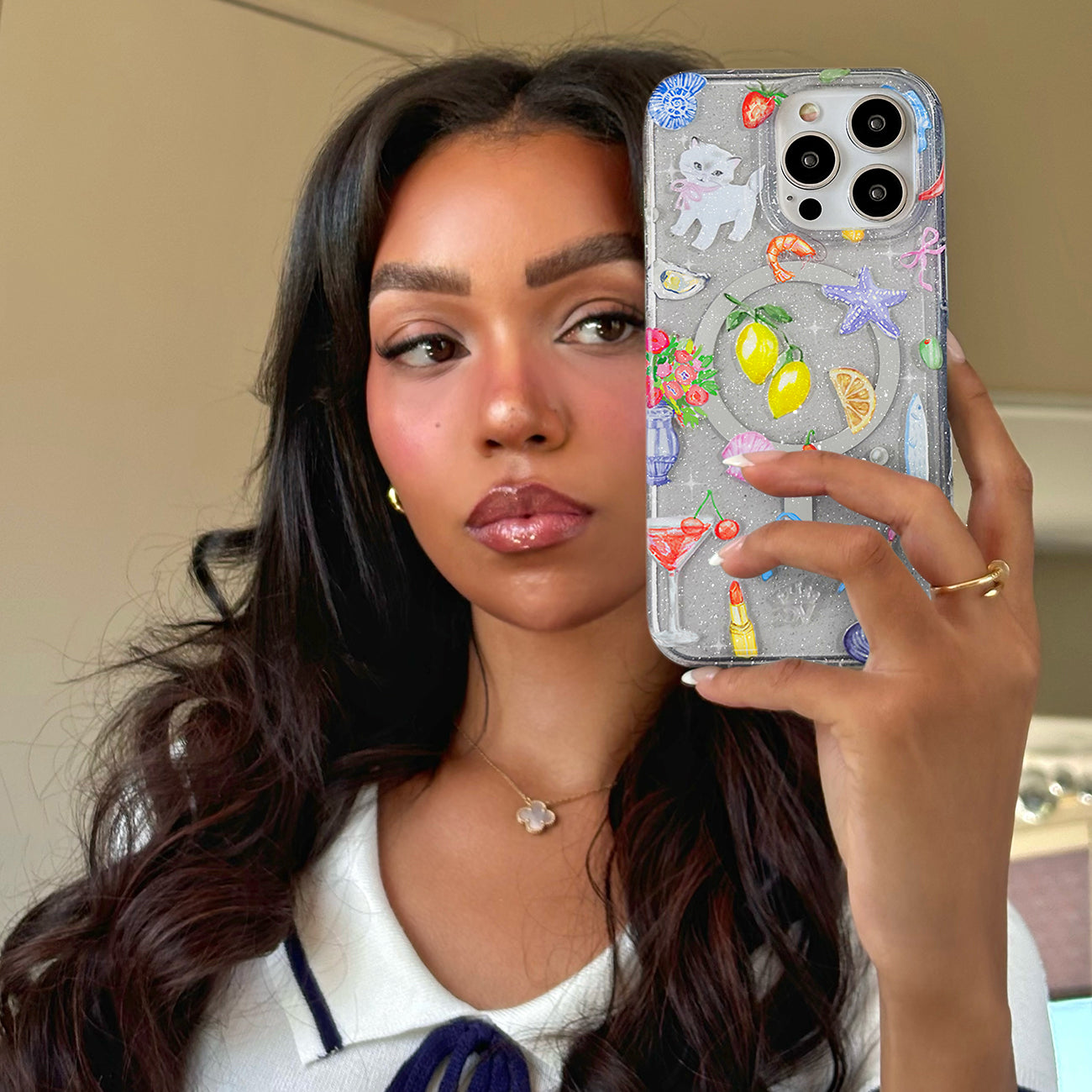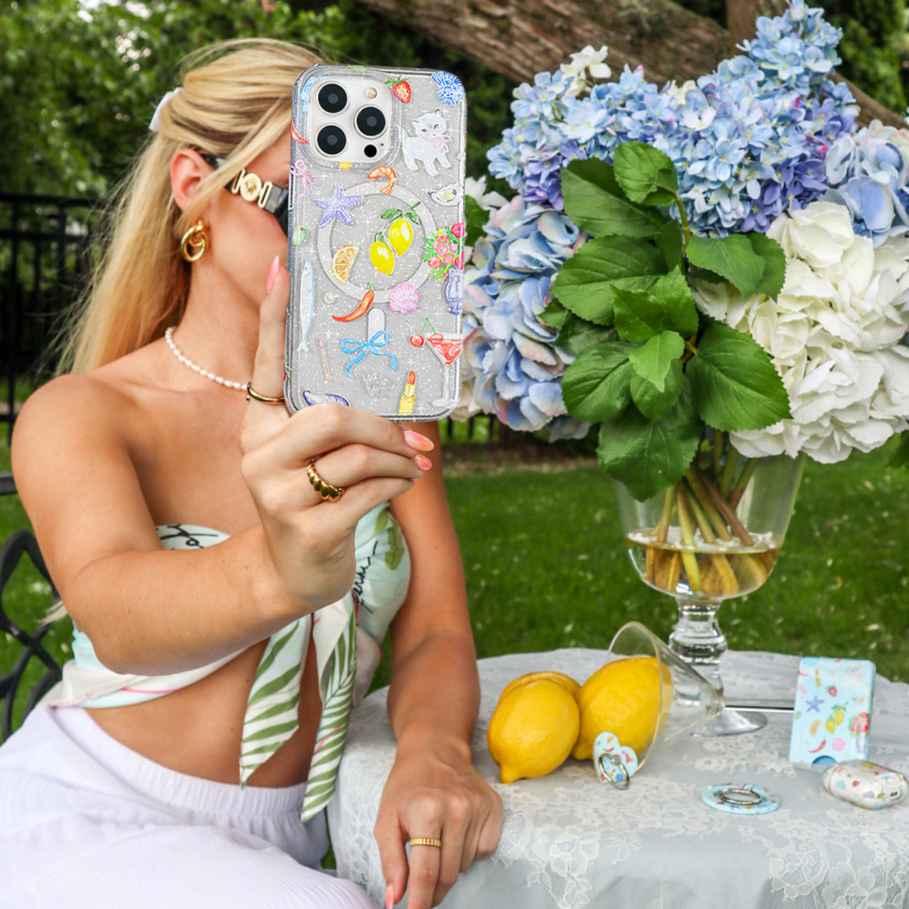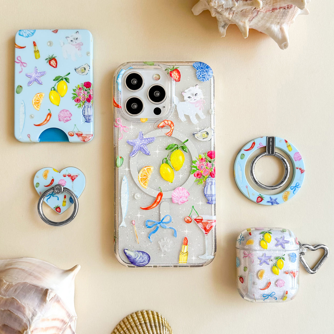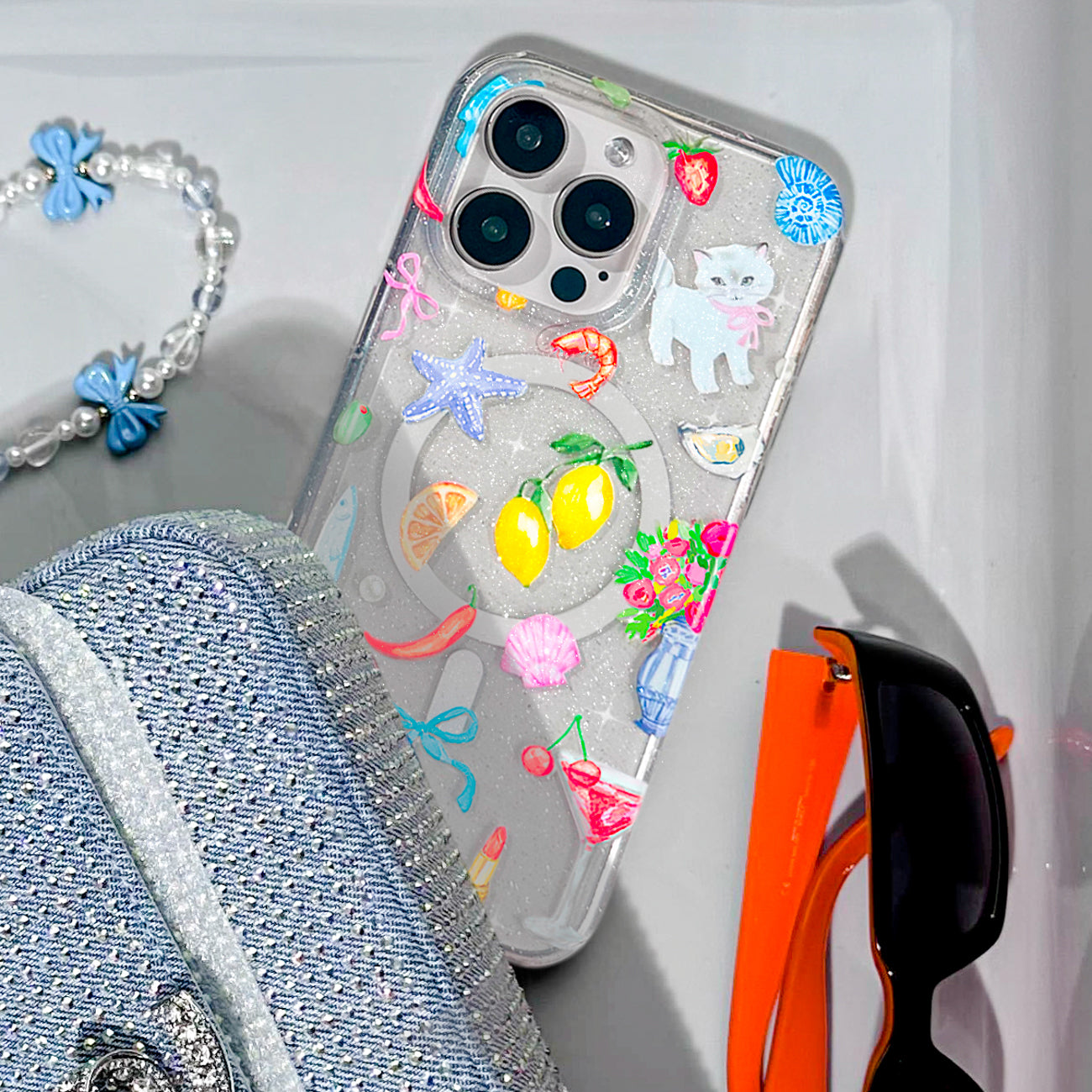 1 Ticket to Capri please! This MagSafe case features an array of essentials for the perfect coastal summer, lemons, martinis, starfish, seashells, olives, and more all on a clear case with silver glitter sprinkled into the base and bumper.