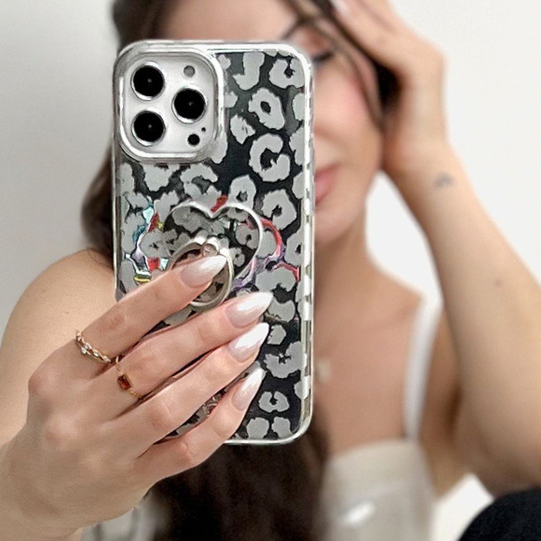 One word. FIERCE! This protective case features a metallic silver base and matte leopard spots.