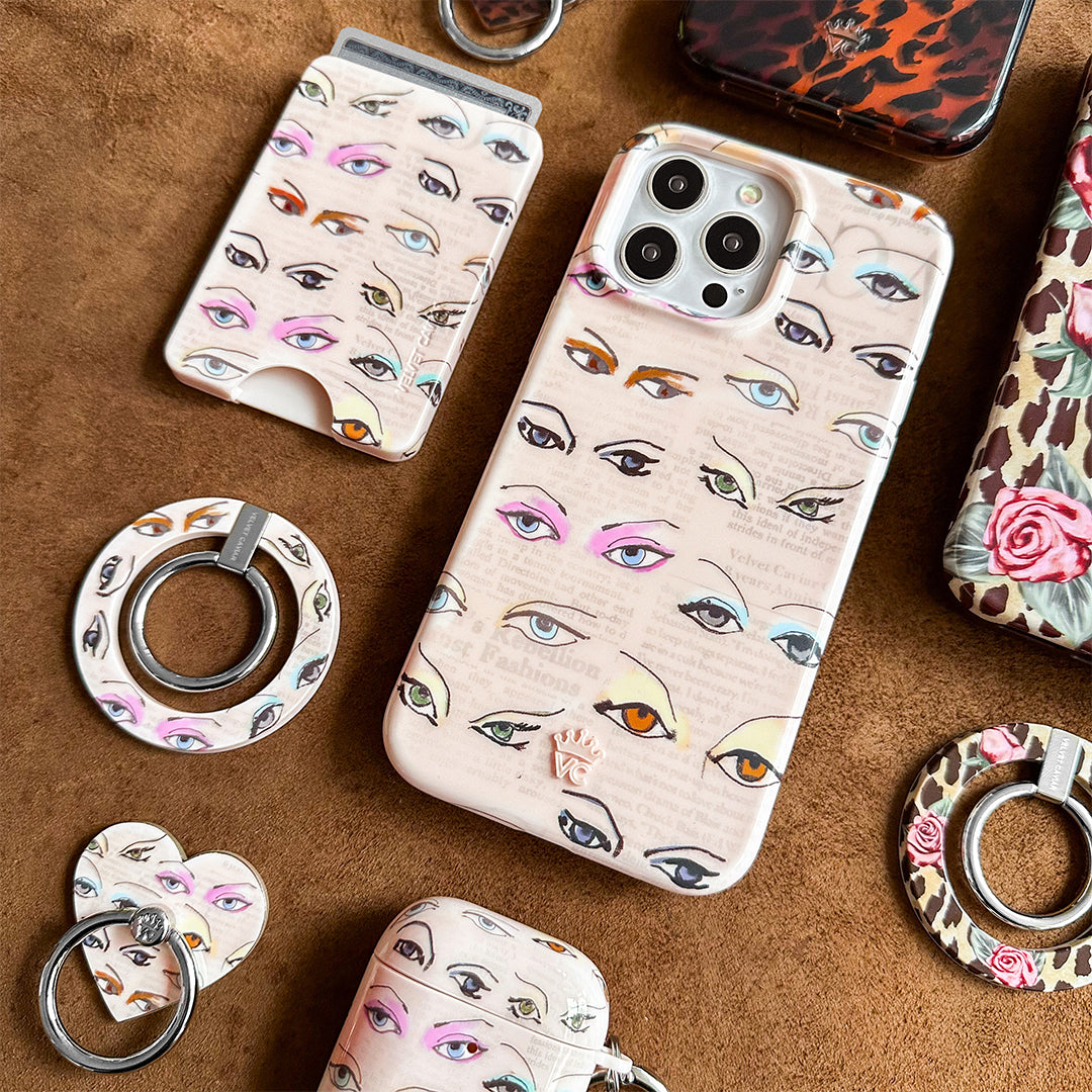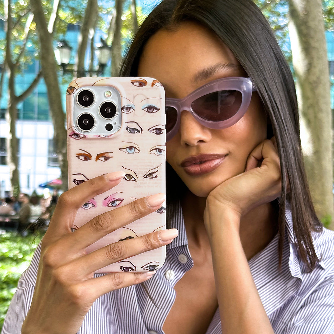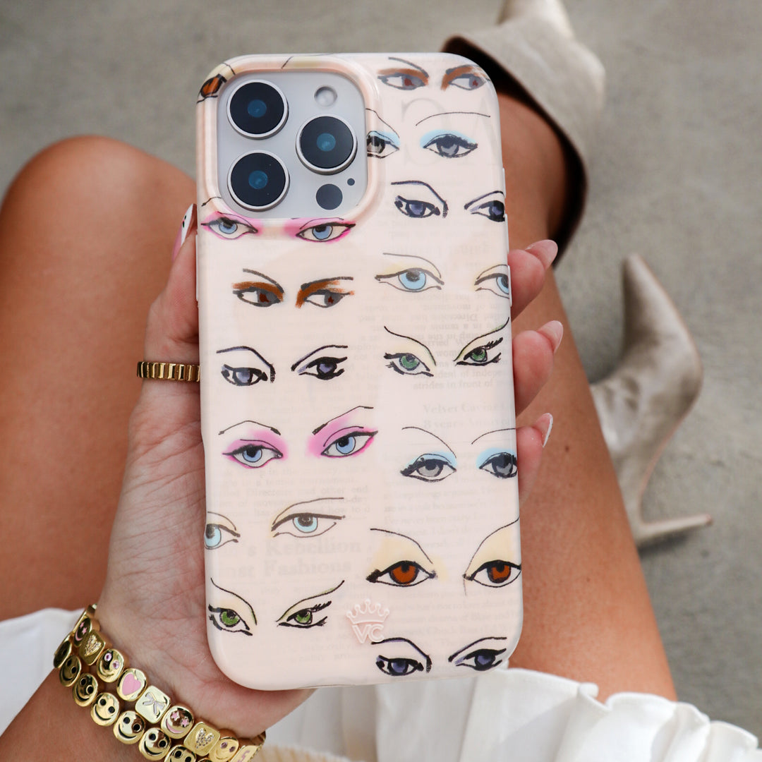 This eye-catching MagSafe case features a high fashion siren eye print on a light beige base with whispers of vintage news paper text throughout.