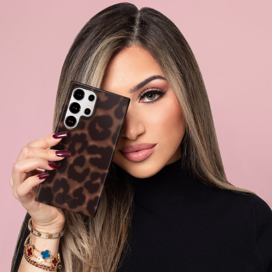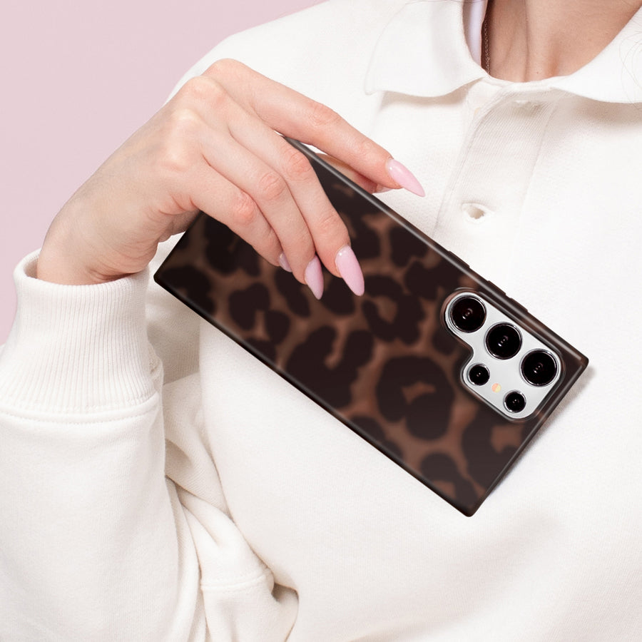 Instant It Girl! Turn heads in this glossy protective case featuring deep brown leopard spots on a dimensional chocolate brown base.