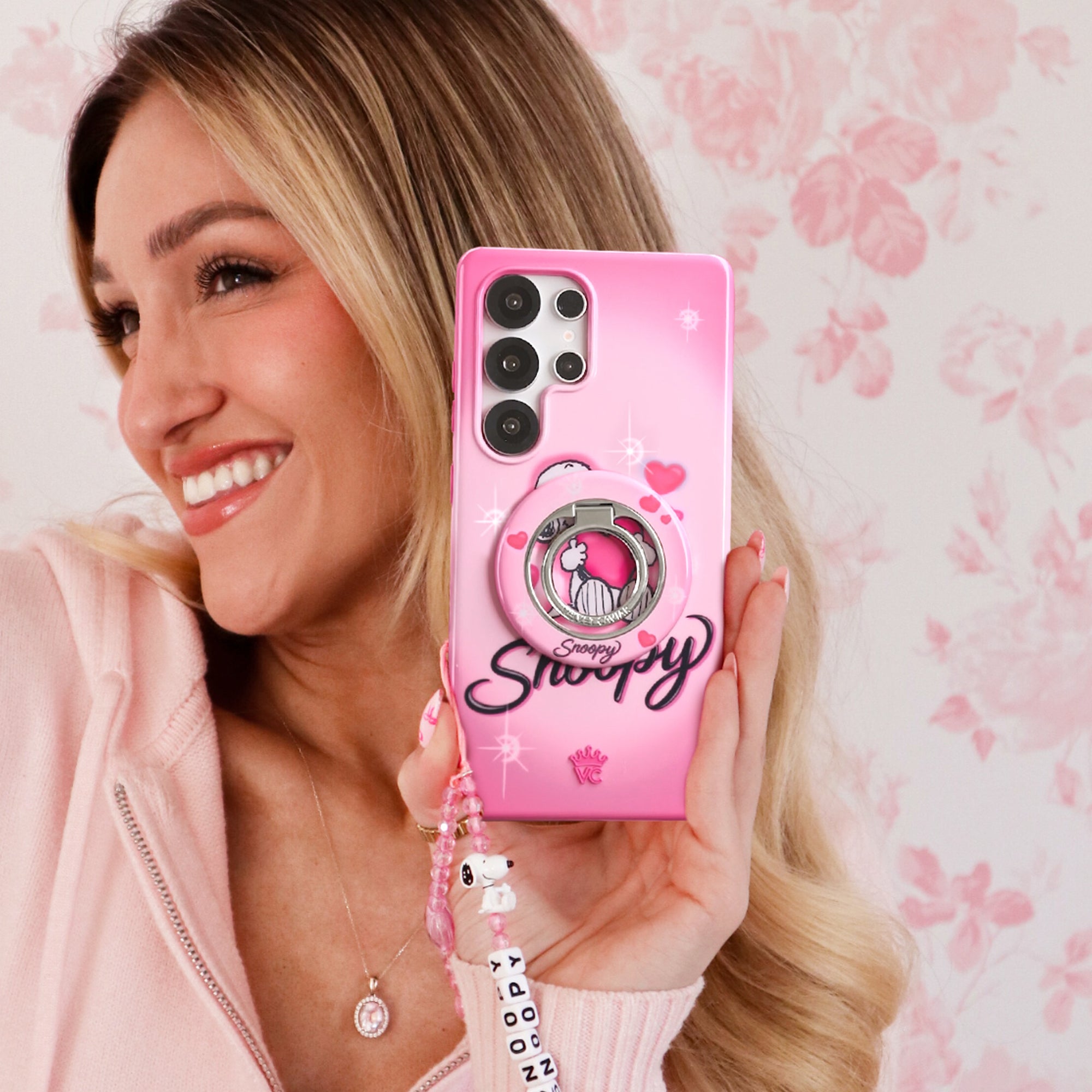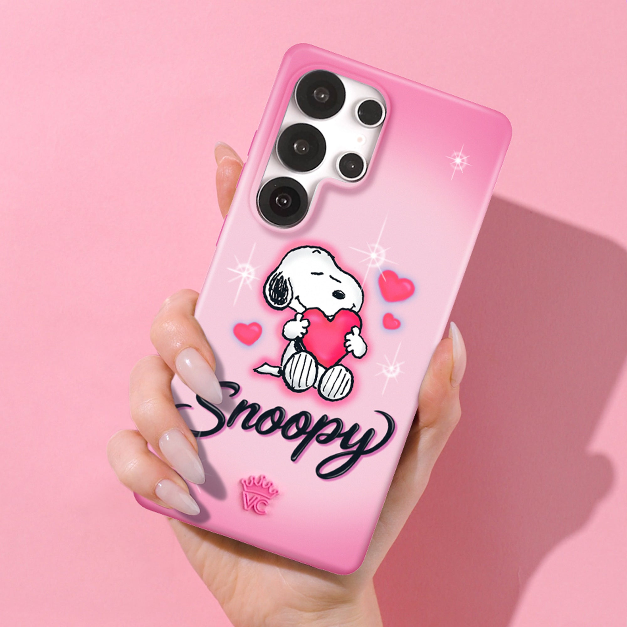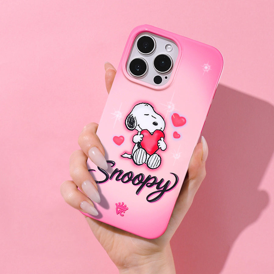 Good Grief! This protective case features Snoopy holding a bright pink heart front and center with airbrush inspired details throughout all on a gradient pink base. In collaboration with Peanuts™