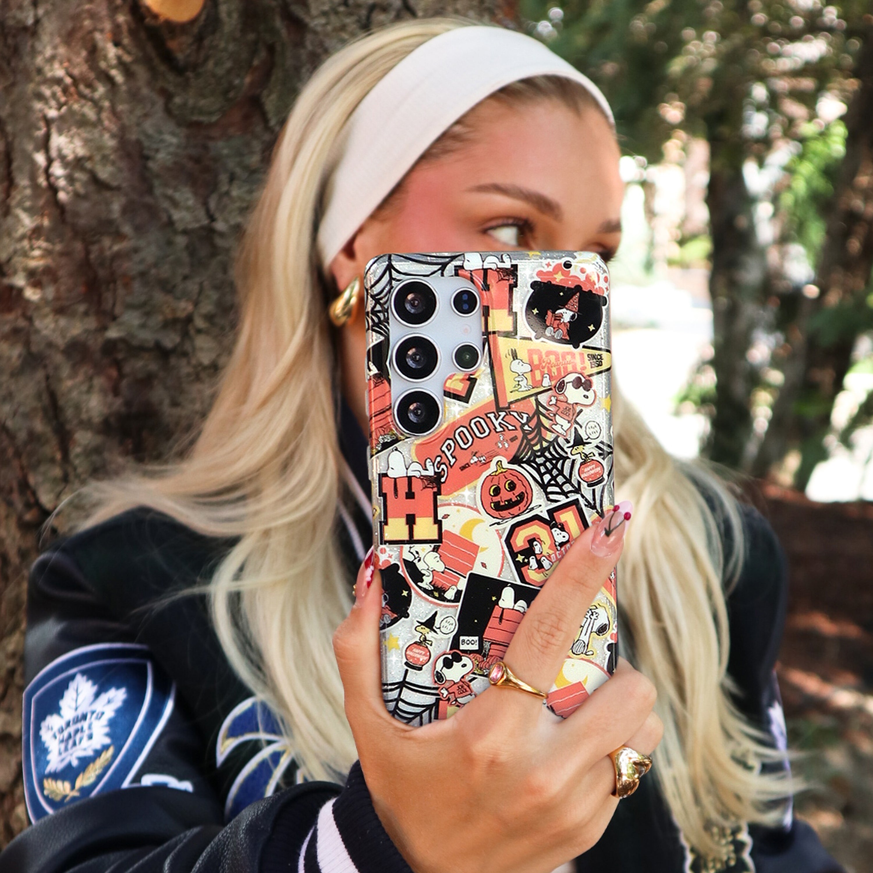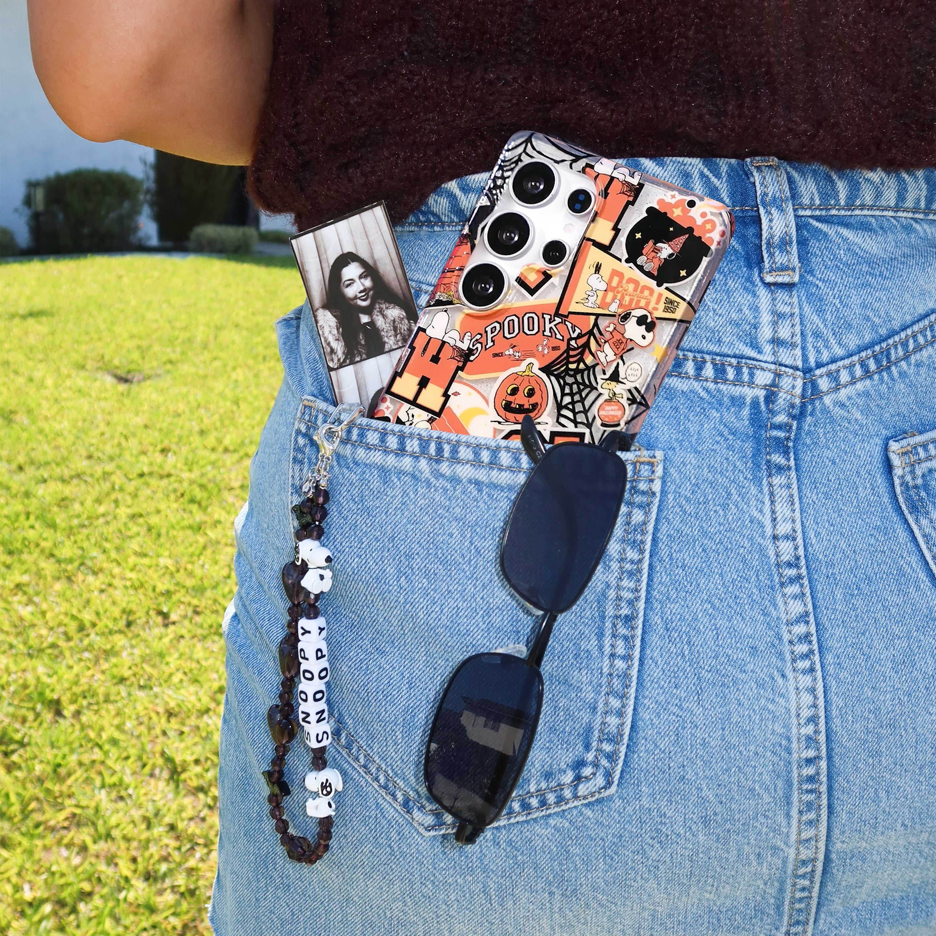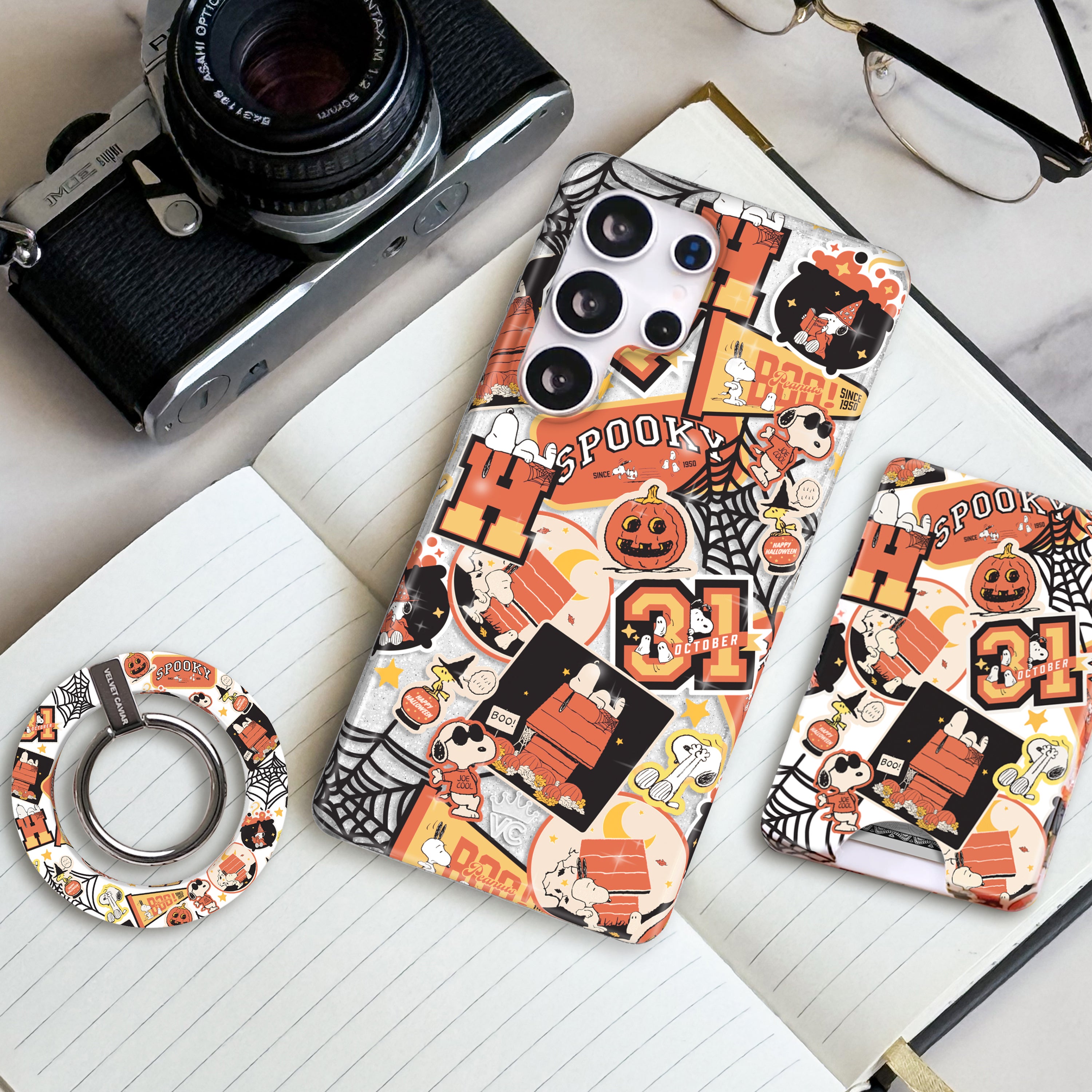 VC loves Snoopy! This protective case features Snoopy all over in a varsity inspired Halloween patchwork design on a clear case with silver glitter sprinkled into the base and bumper.