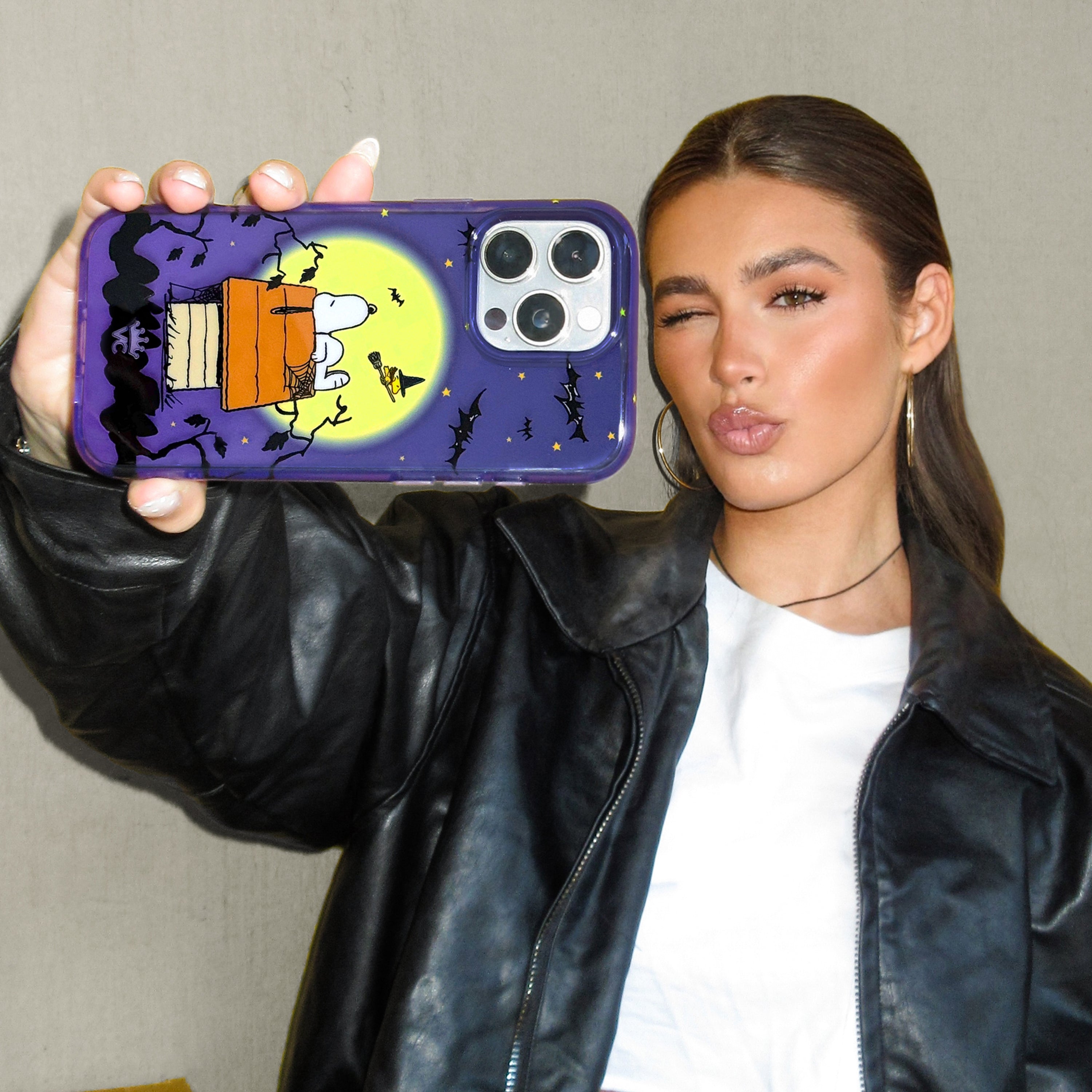 VC loves Snoopy! This transparent purple MagSafe case features Snoopy resting on his dog house beneath a full moon with Woodstock in a witch's hat flying overhead.