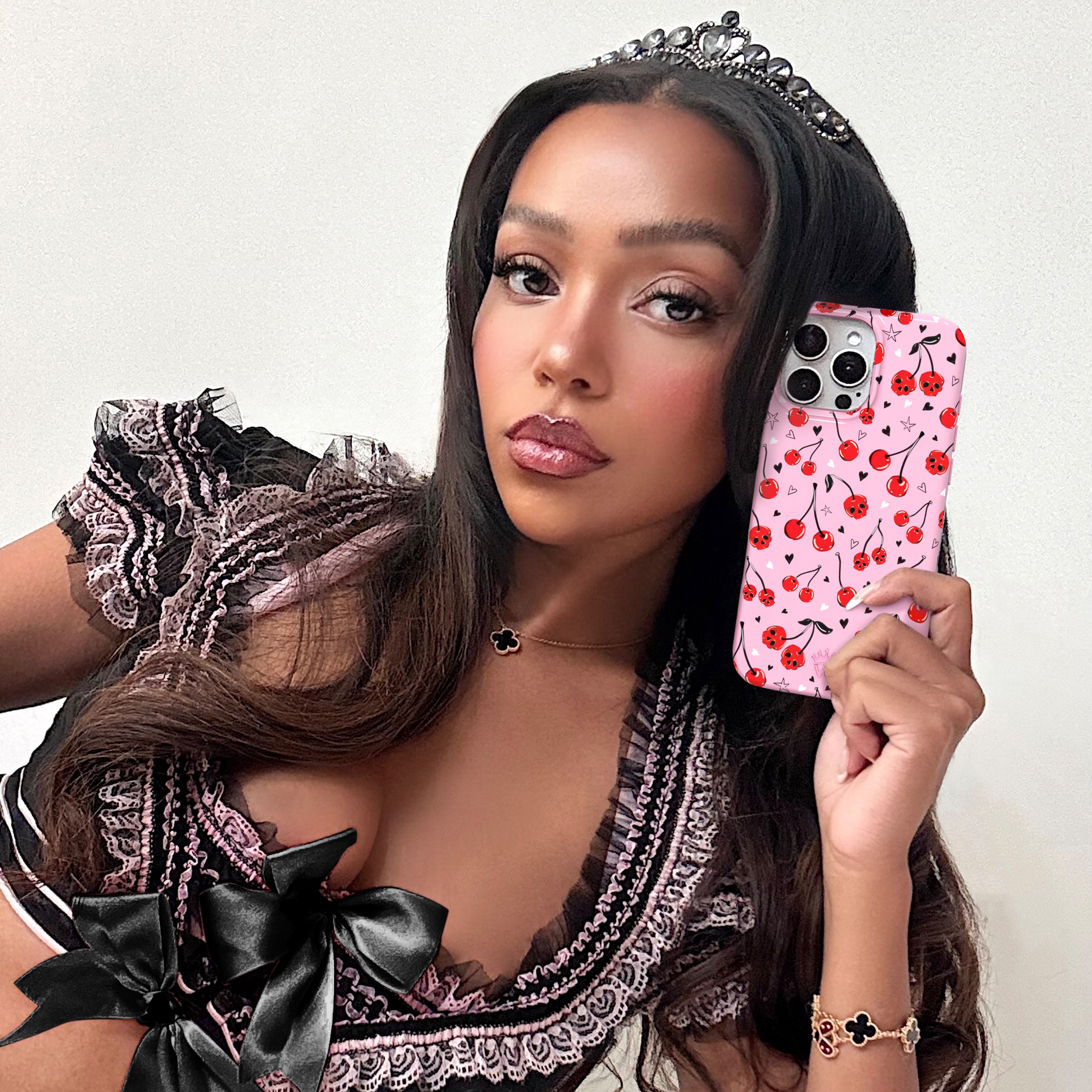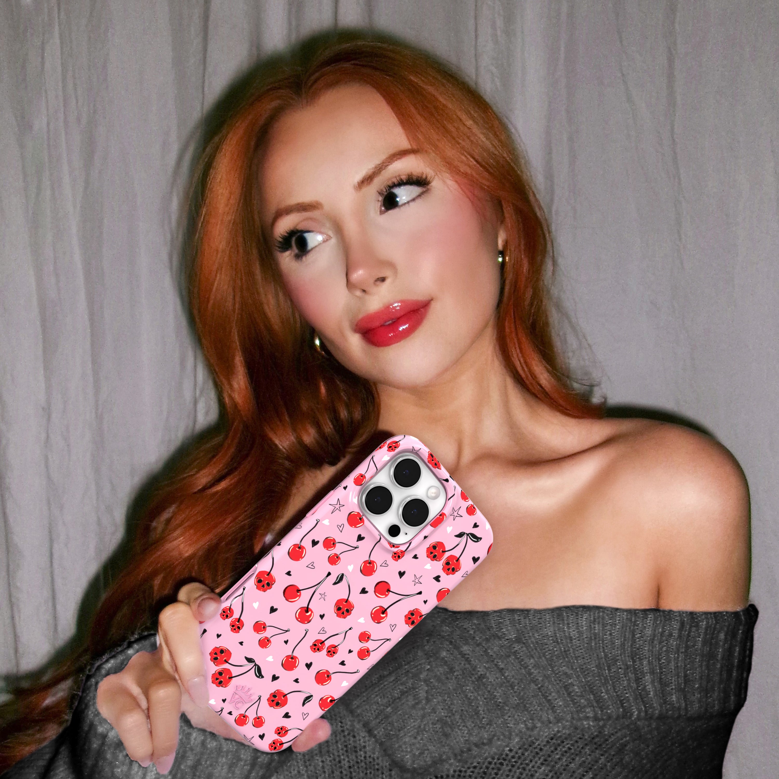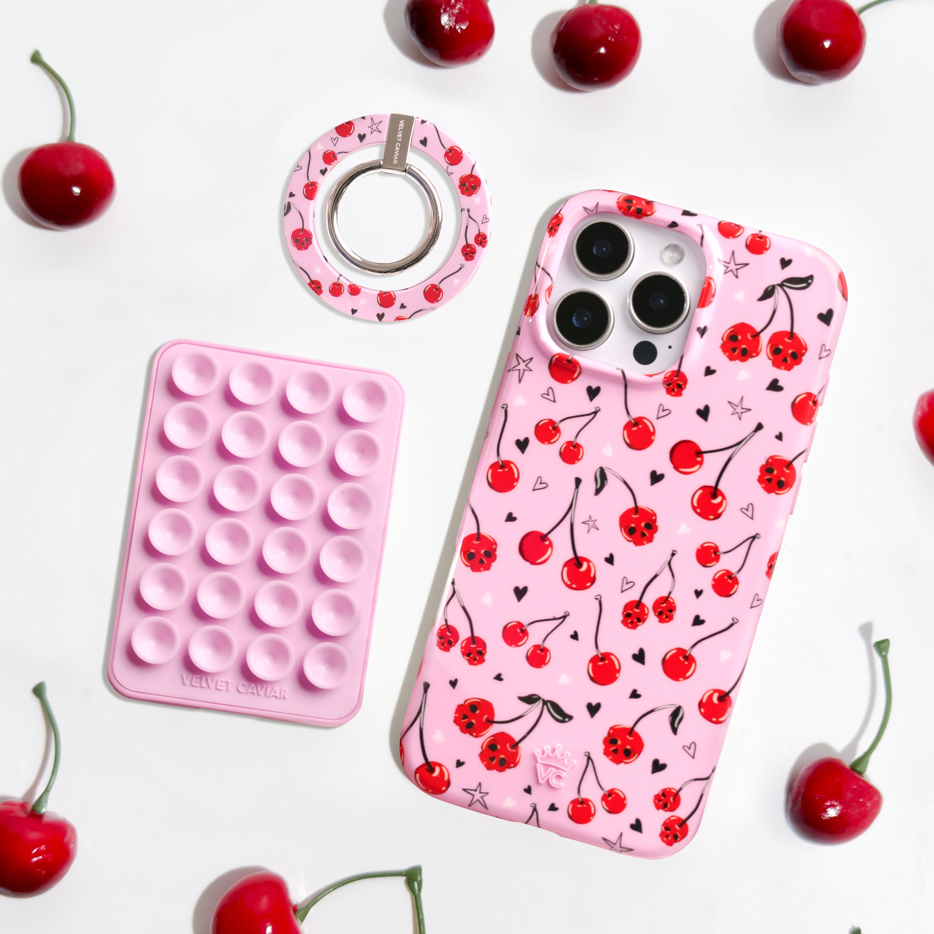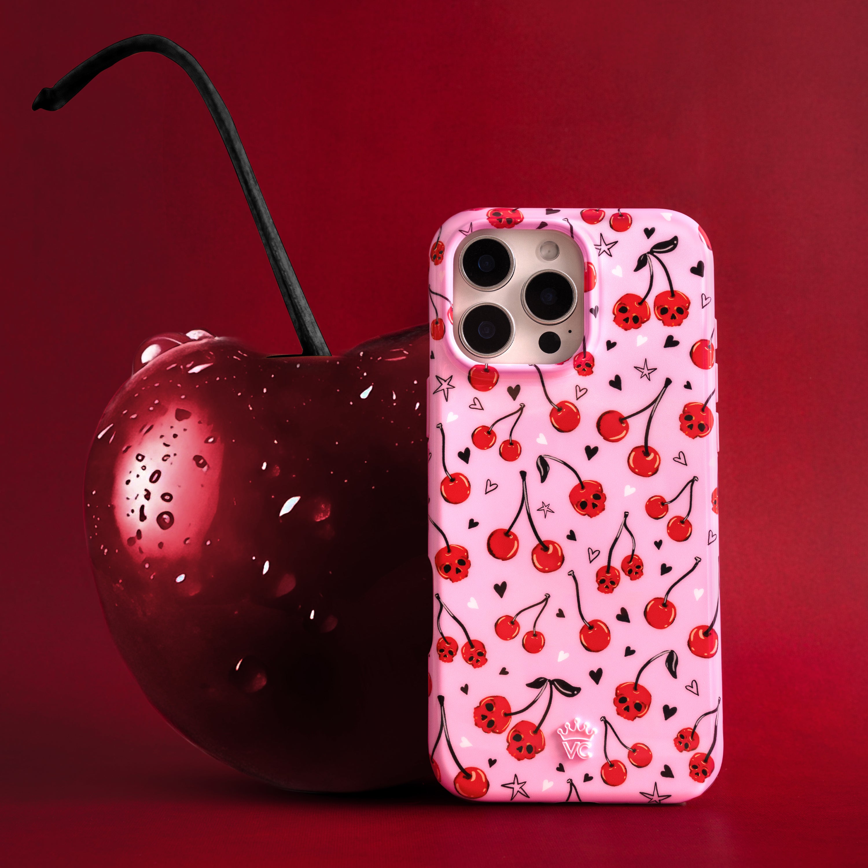 Happy Halloween! This MagSafe case features red cherry skulls with hand drawn stars and hearts on a glossy light pink base.
