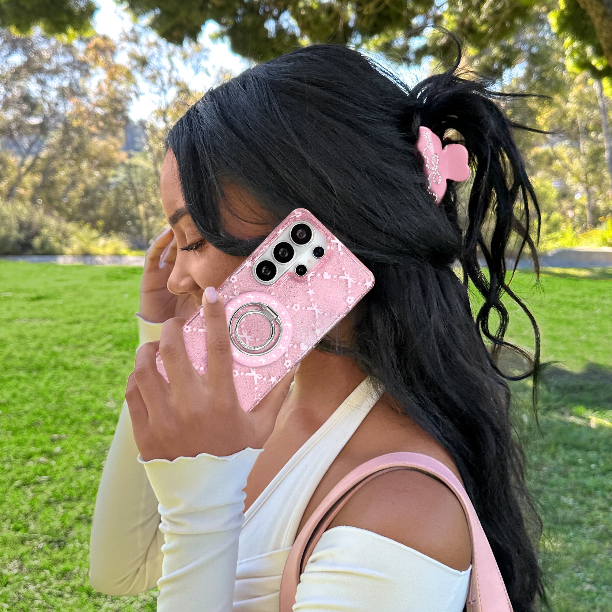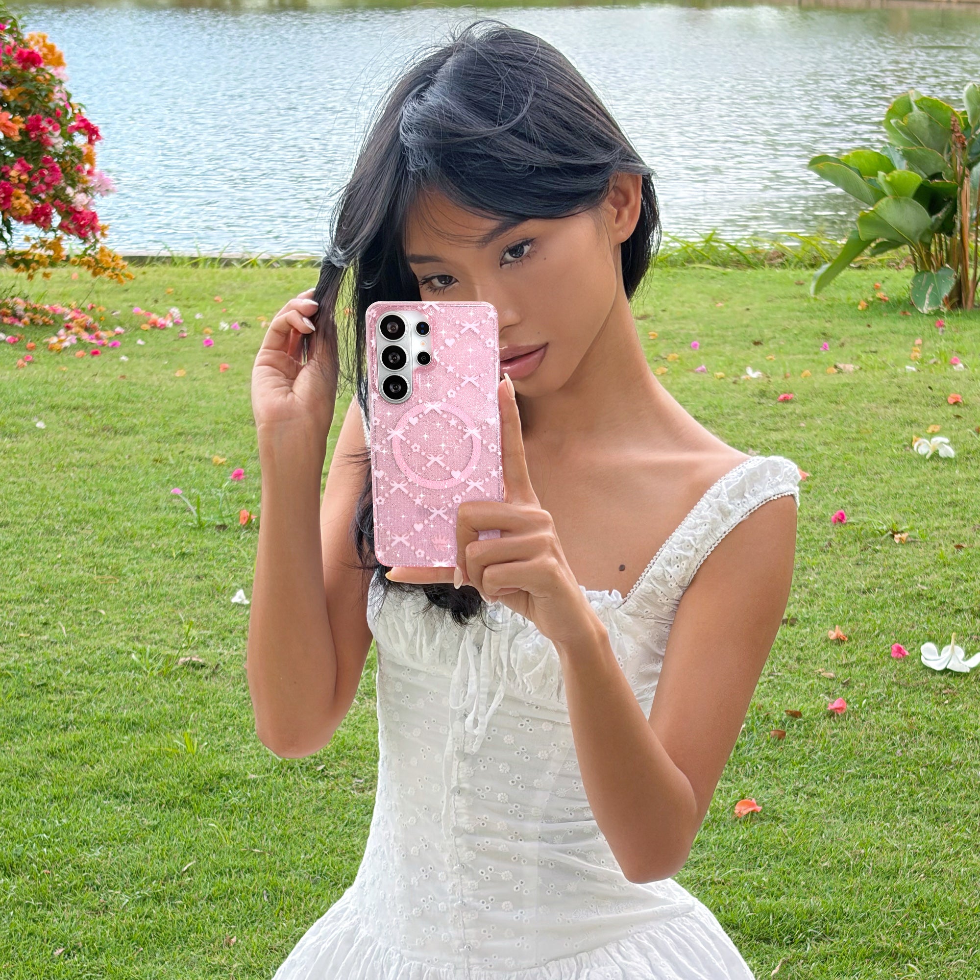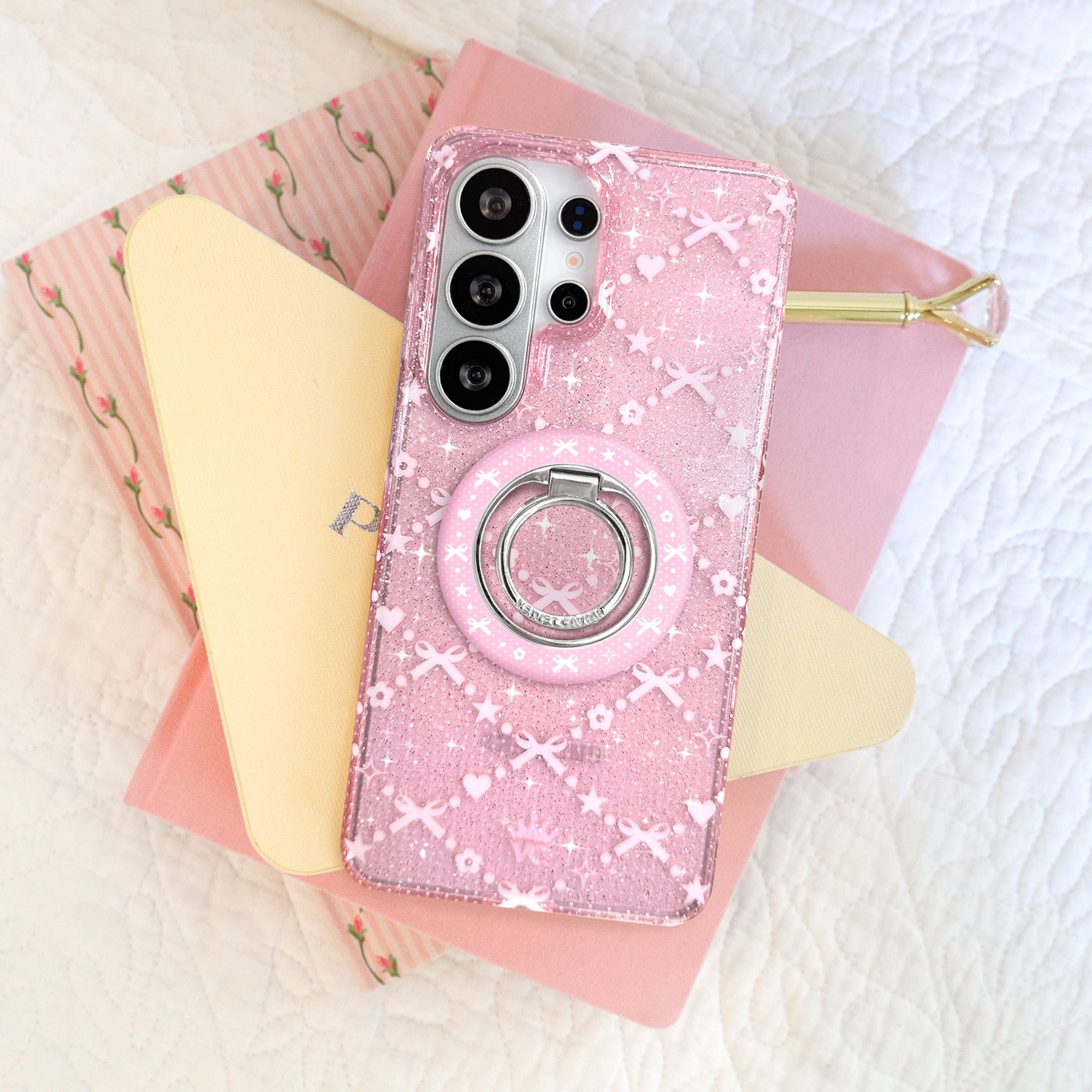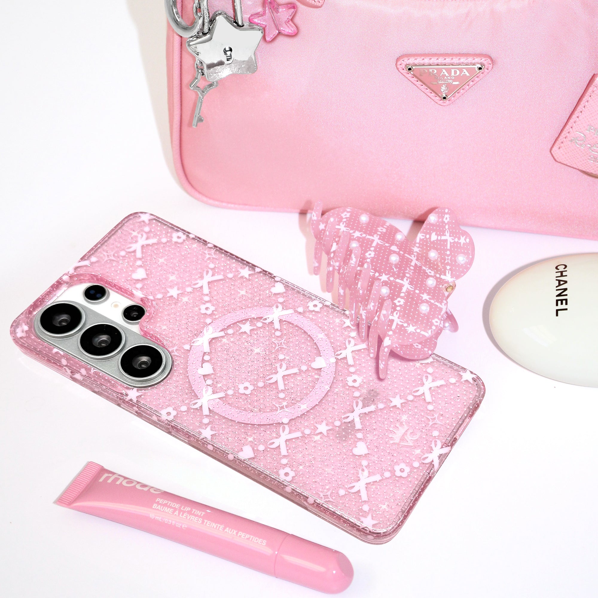 Sweet as can be! This protective case features white bows, stars, hearts and blossom flowers on a pink clear case with silver glitter sprinkled into the base and bumper.