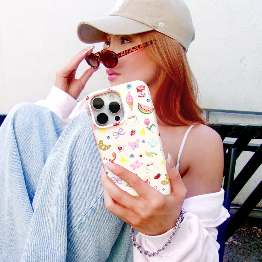 Girls just wanna have sun! This glossy MagSafe phone case is inspired by the perfect summer from the beach to the boardwalk and back again with a neutral base and pink bumper!