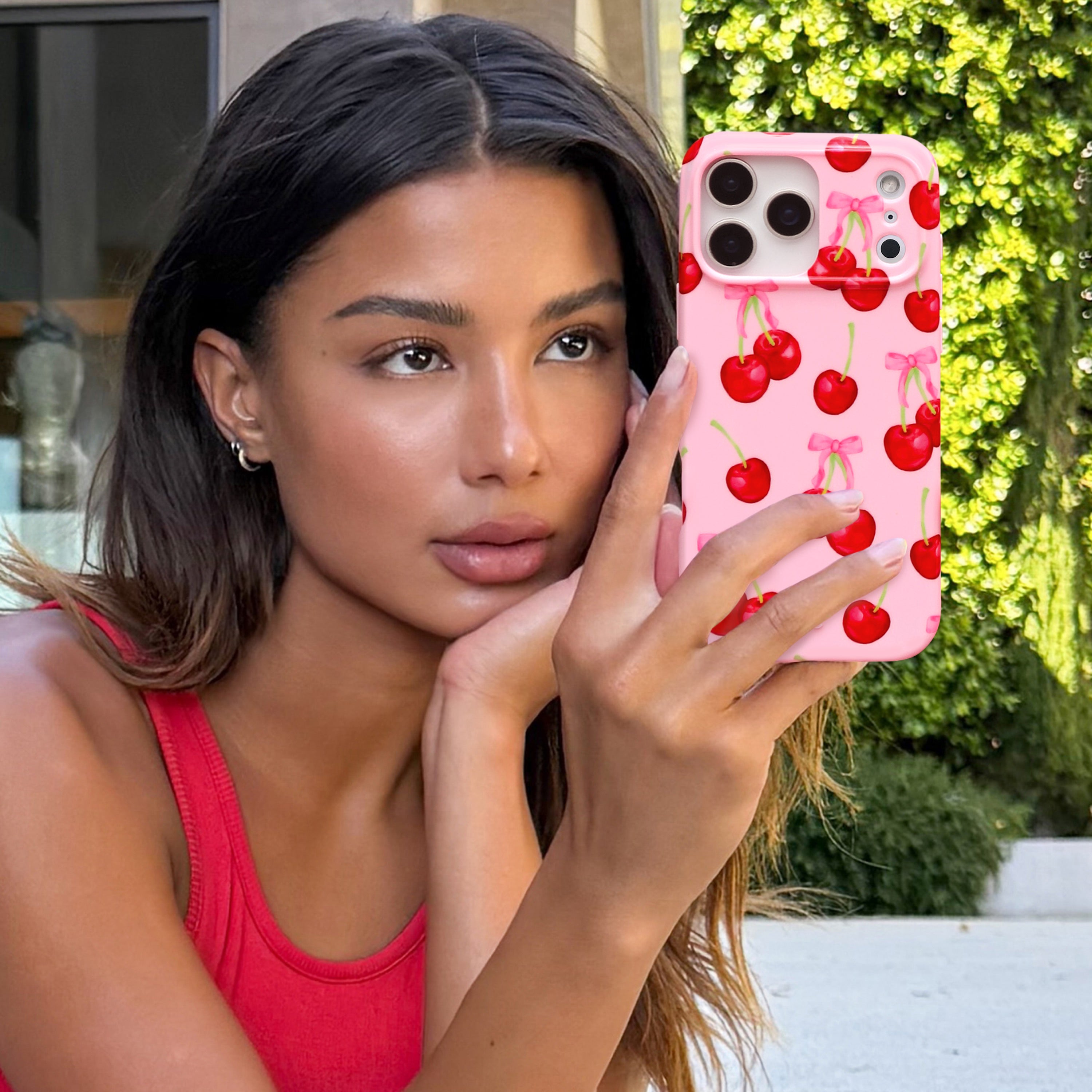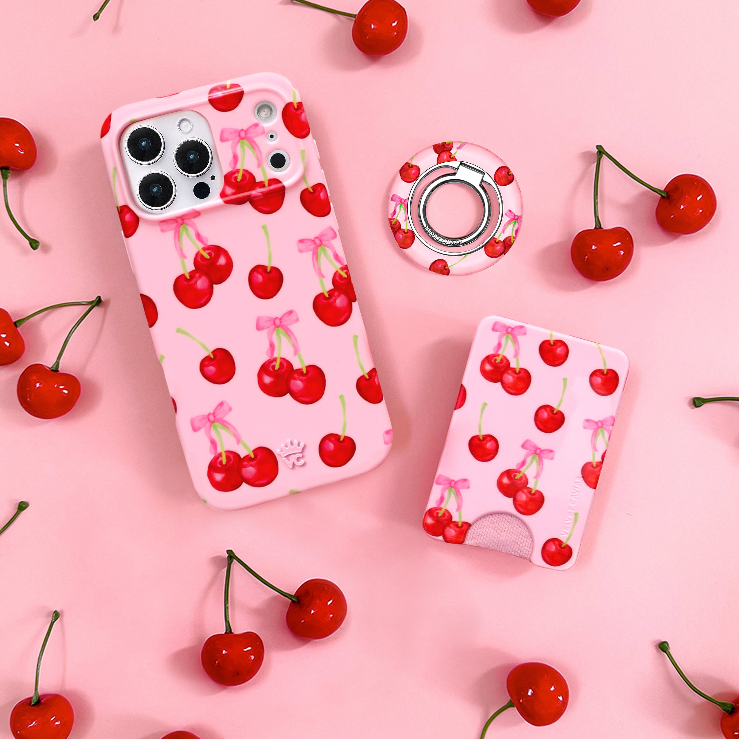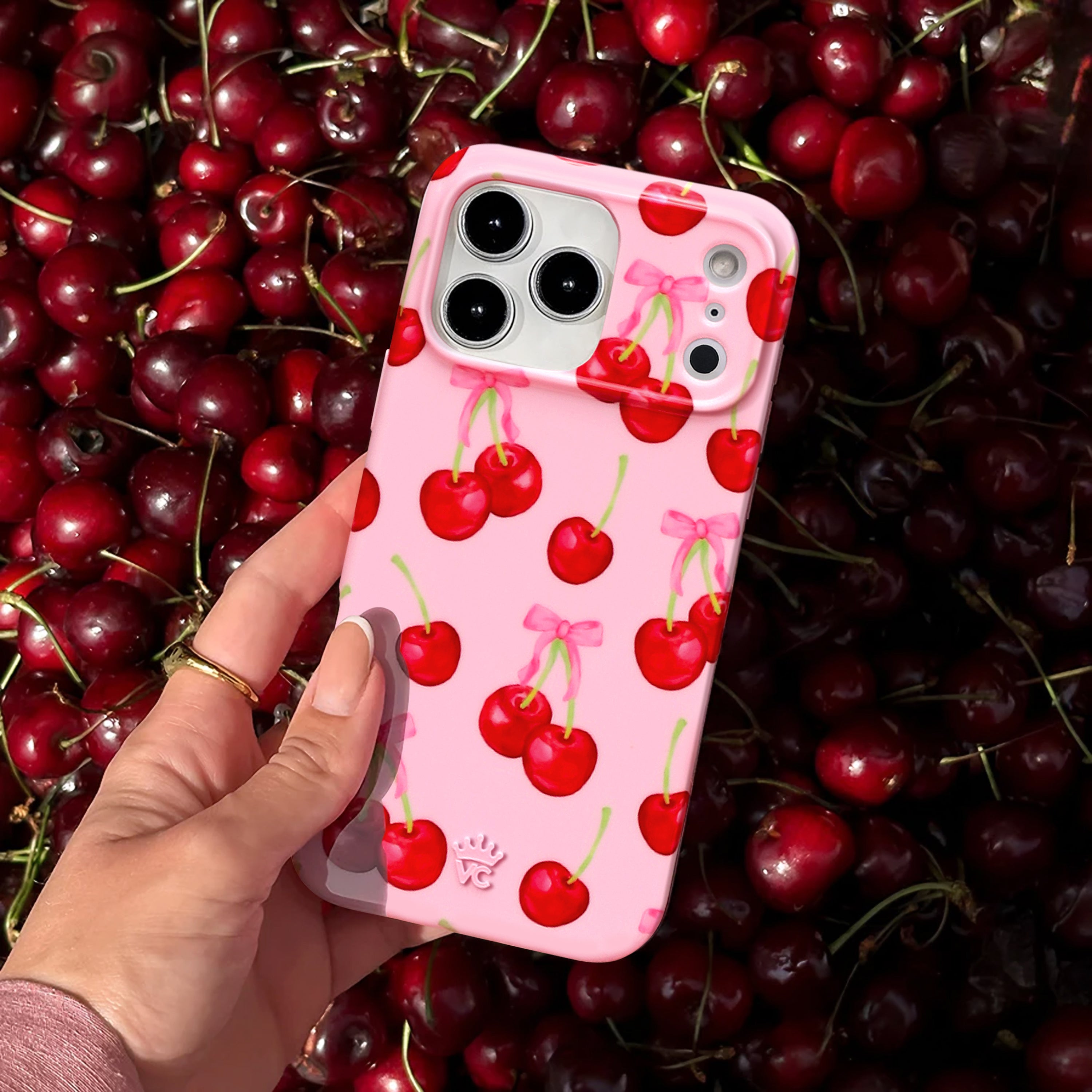 Oh so sweet! This Limited Edition MagSafe case features red watercolor cherries and pink bows on a glossy bubblegum pink base.