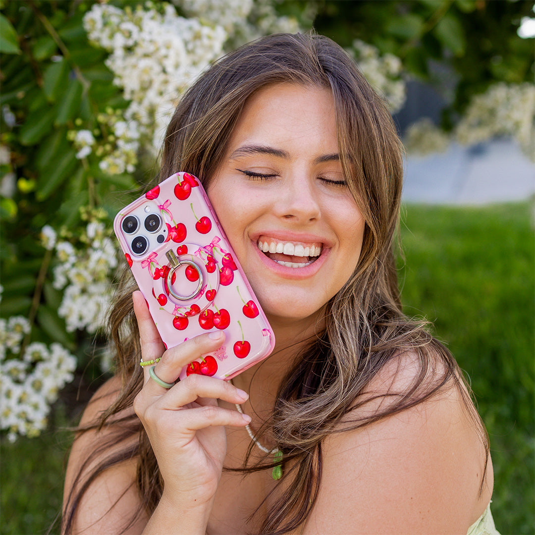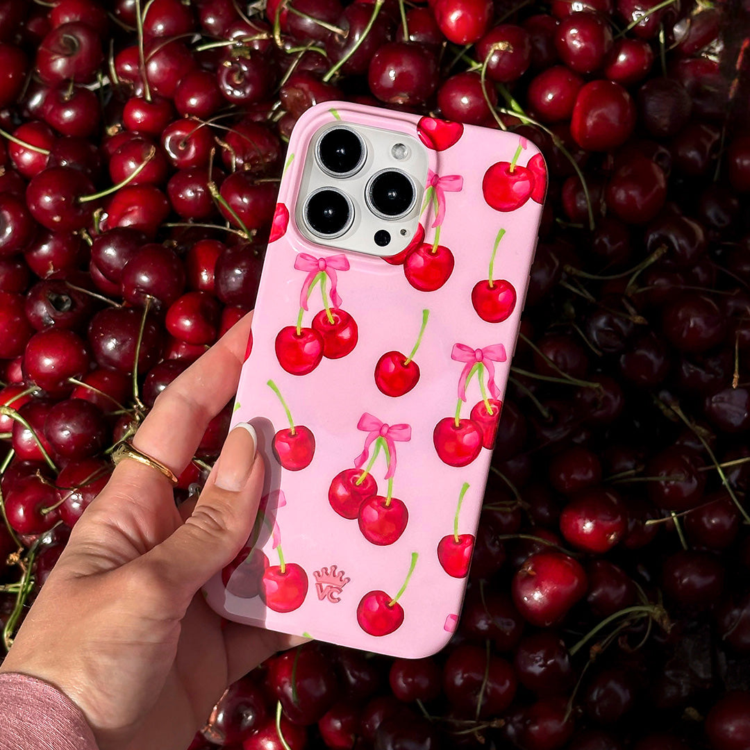 Oh so sweet! This Limited Edition case features red watercolor cherries and pink bows on a glossy bubblegum pink base.