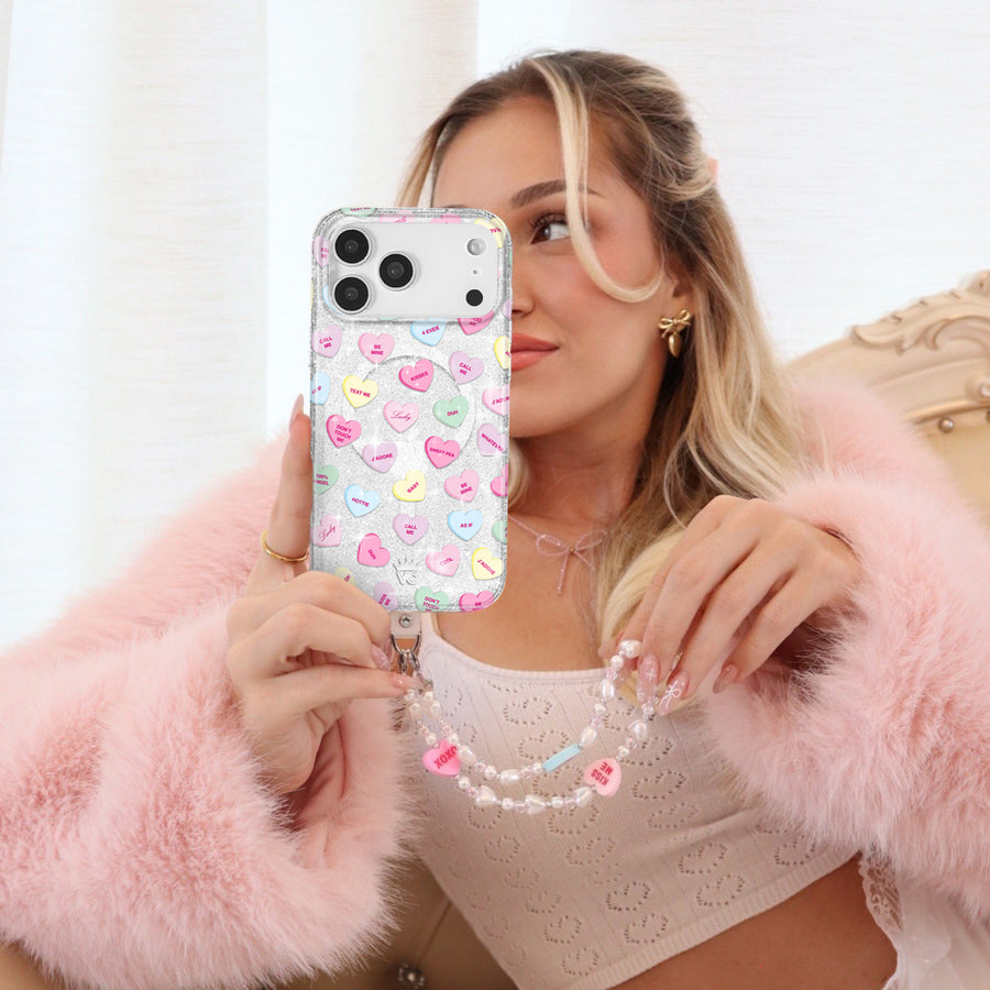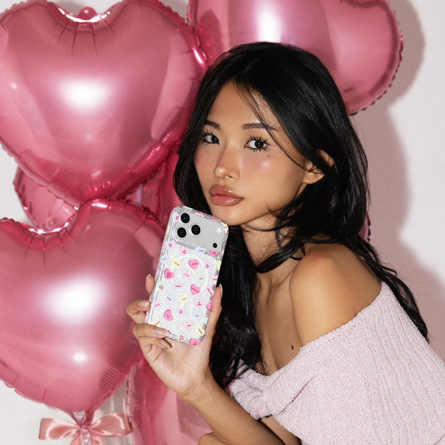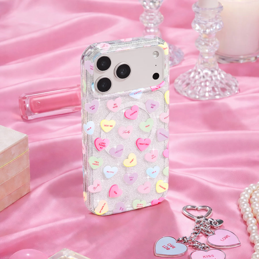 Sweet like candy! This Limited Edition MagSafe case features candy-inspired conversation hearts on a clear base with silver glitter sprinkled into the base and bumper.
