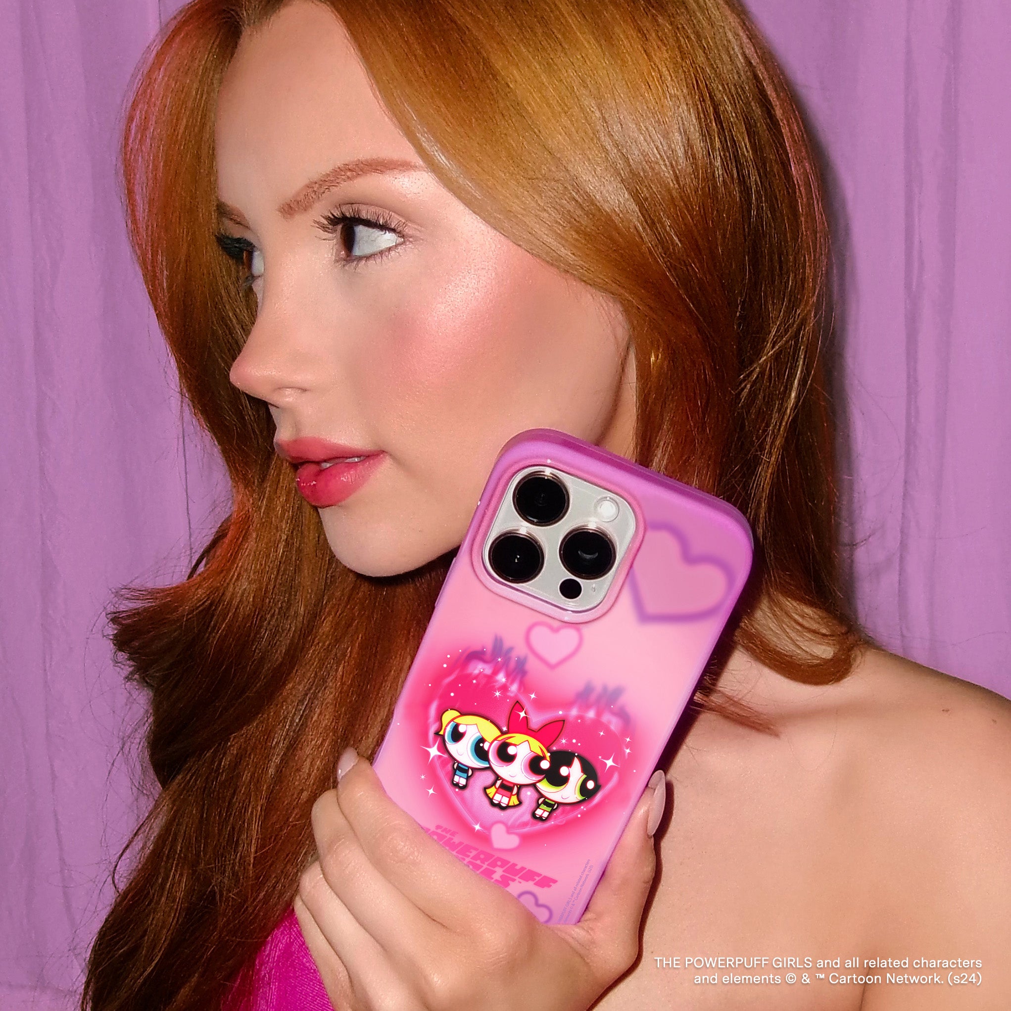 Sugar, Spice, and Everything Nice! This MagSafe case features Blossom, Bubbles, and Buttercup front and center with an array of airbrush hearts on a glossy pink and purple ombre base.