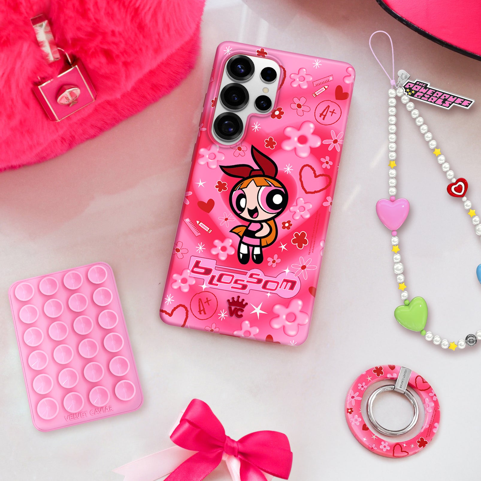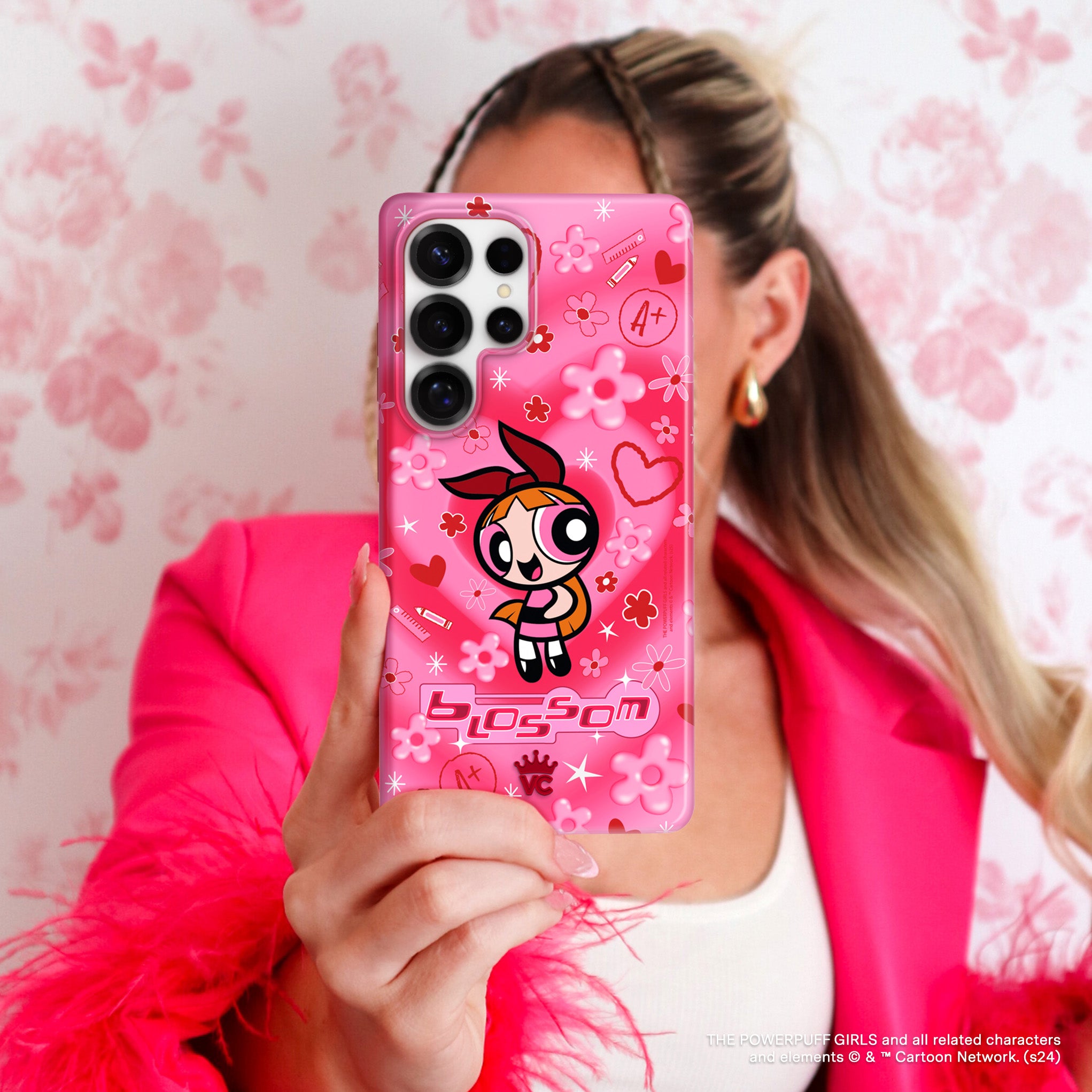It's Blossom! This glossy protective case features Blossom front and center with flowers and hearts sprinkled throughout all on a radiating pink and red heart background.