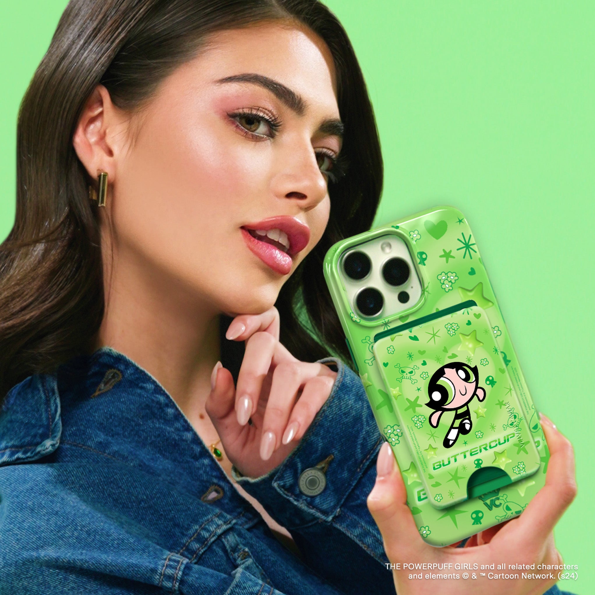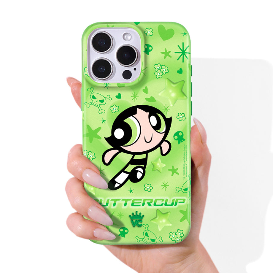 It's Buttercup! This glossy MagSafe case features Buttercup front and center with stars, skulls, and hearts sprinkled throughout all on a radiating heart background in various shades of green.