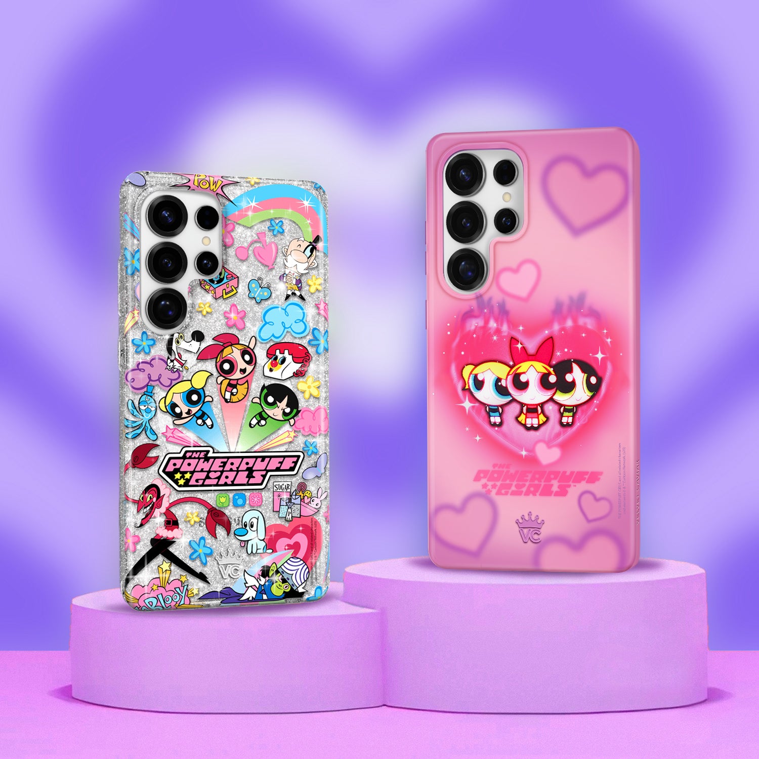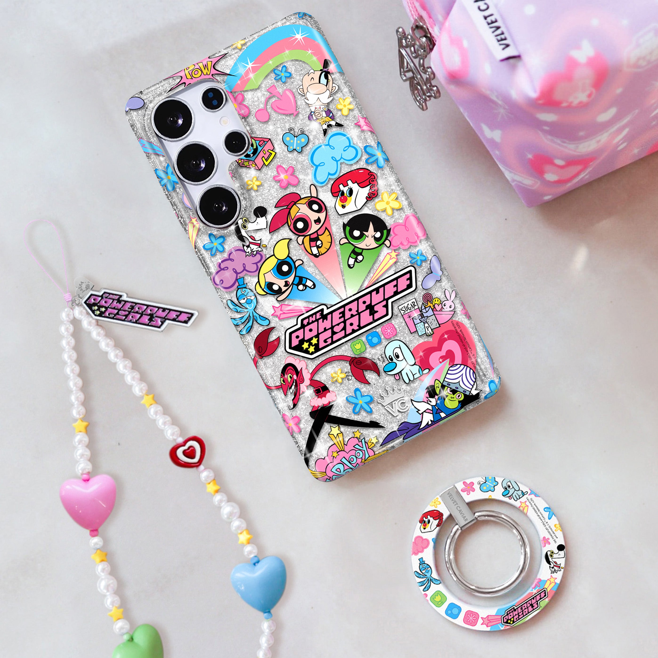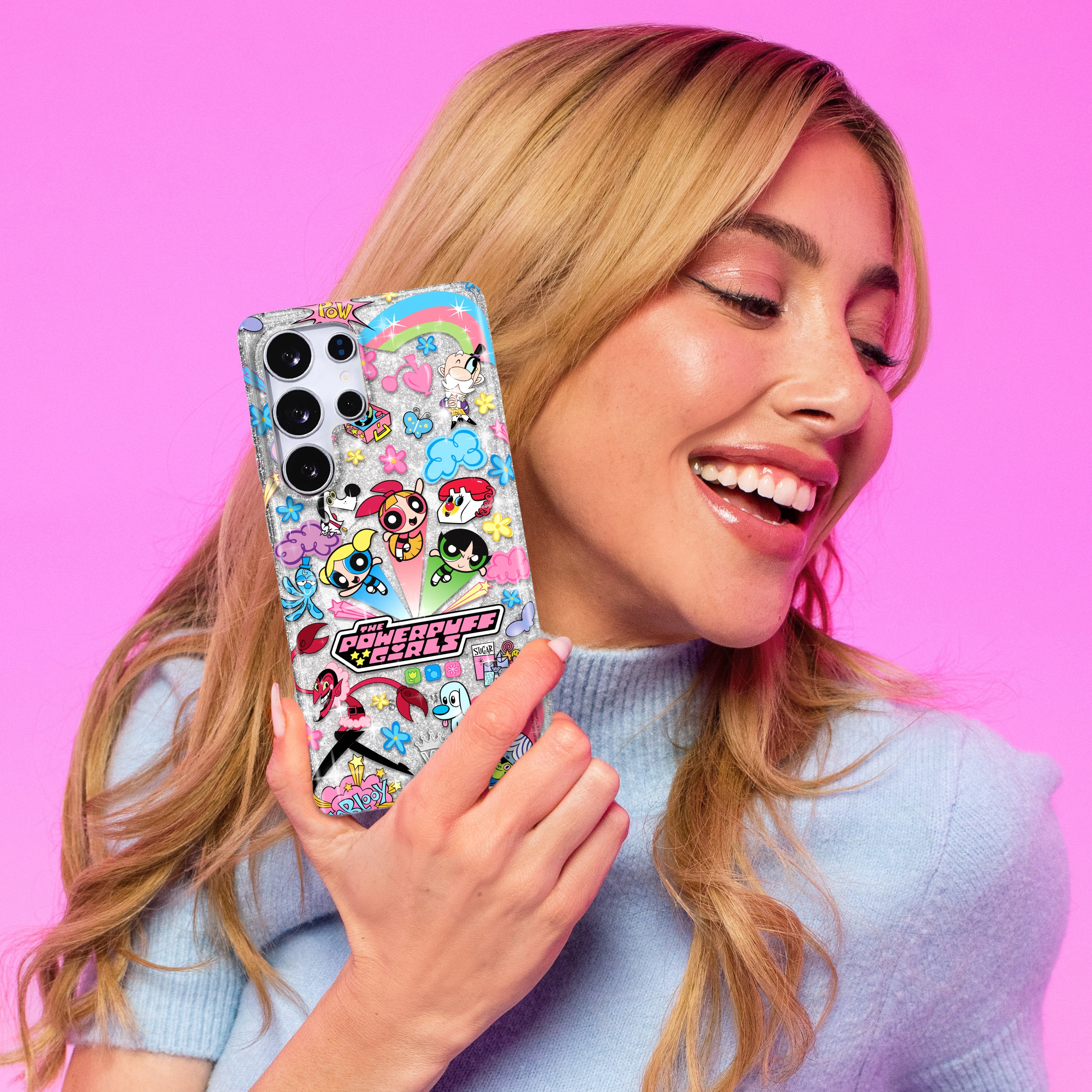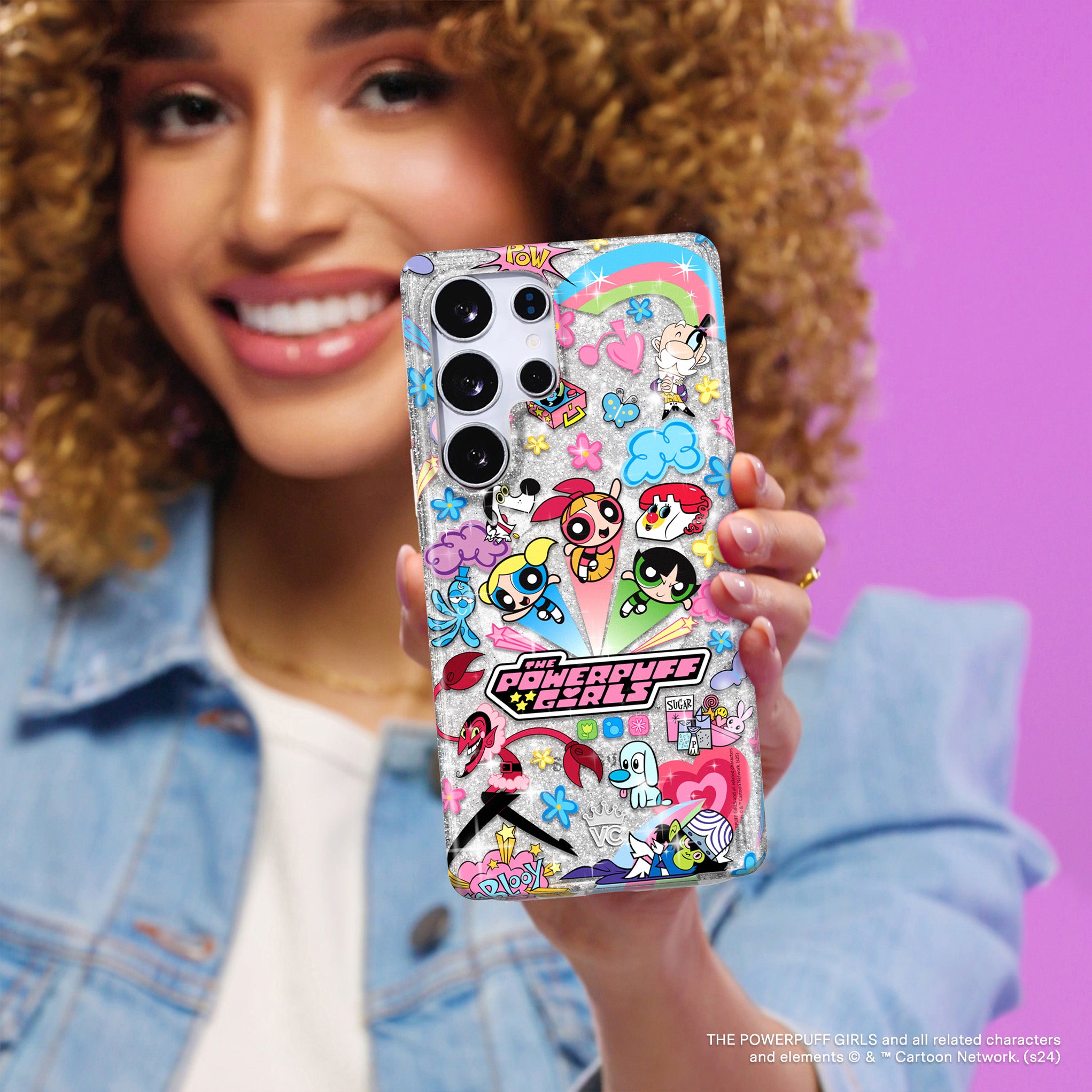 This protective case features Blossom, Bubbles, and Buttercup with an array of nostalgic nods to The Powerpuff Girls all on a clear case with silver glitter sprinkled into the base and bumper.