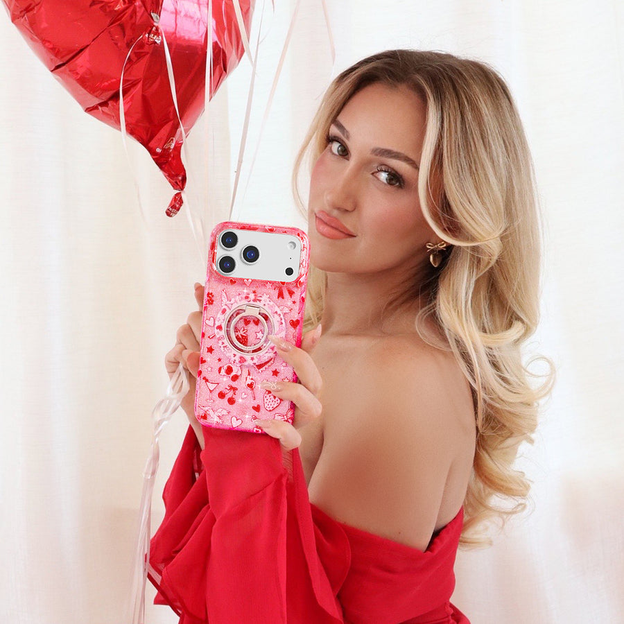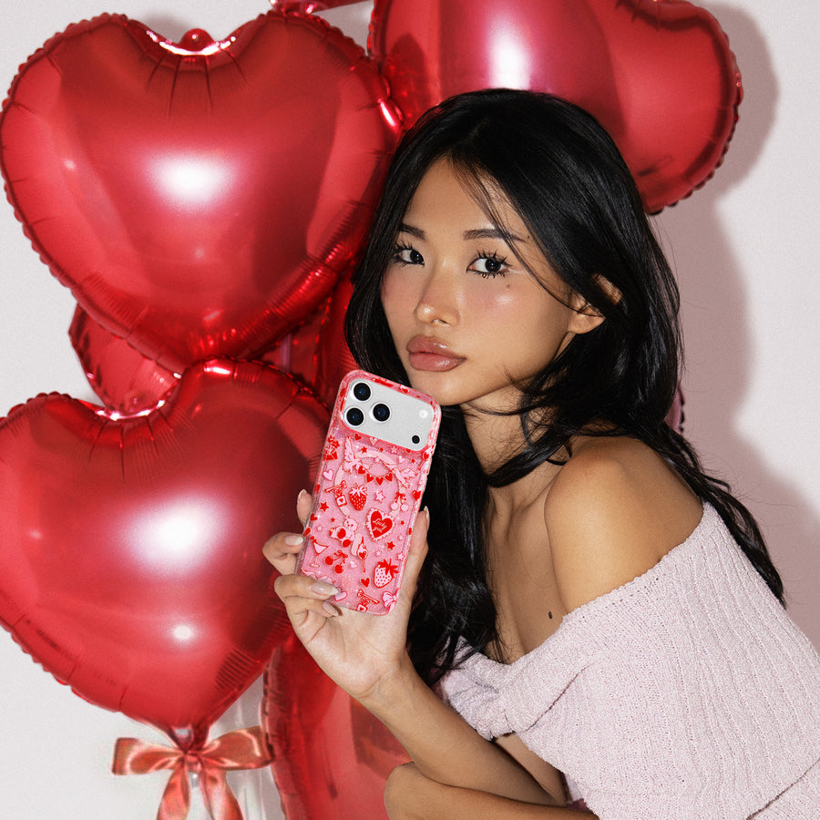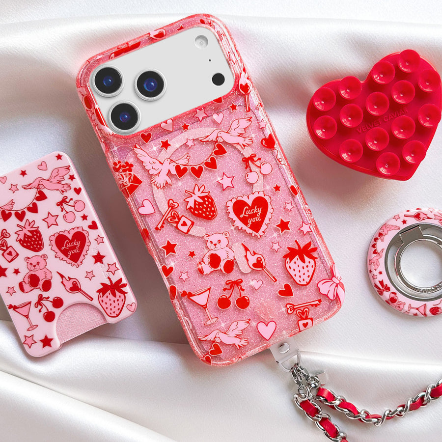 Be Our Valentine! This Limited Edition MagSafe case features a clear pink base with romantic red and pink touches throughout and silver glitter sprinkled into the base and bumper.