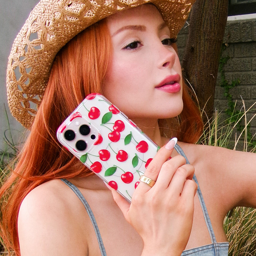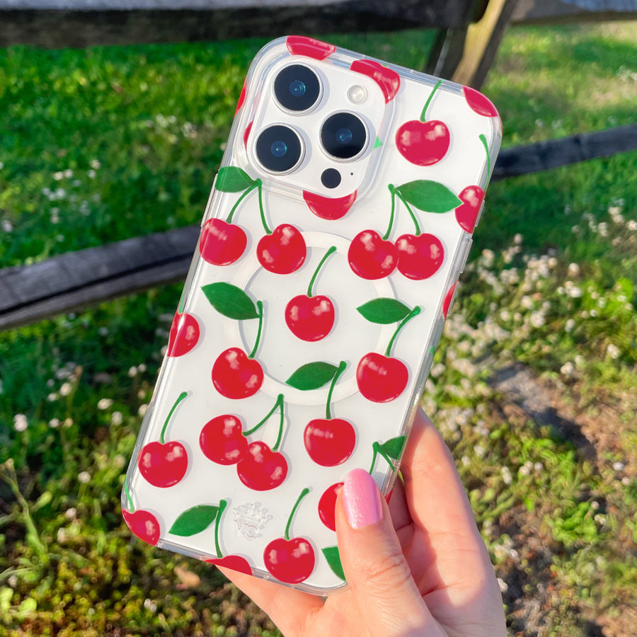 She's cherry cute! This Limited Edition MagSafe case features classic red cherries with green stems on a clear case.
