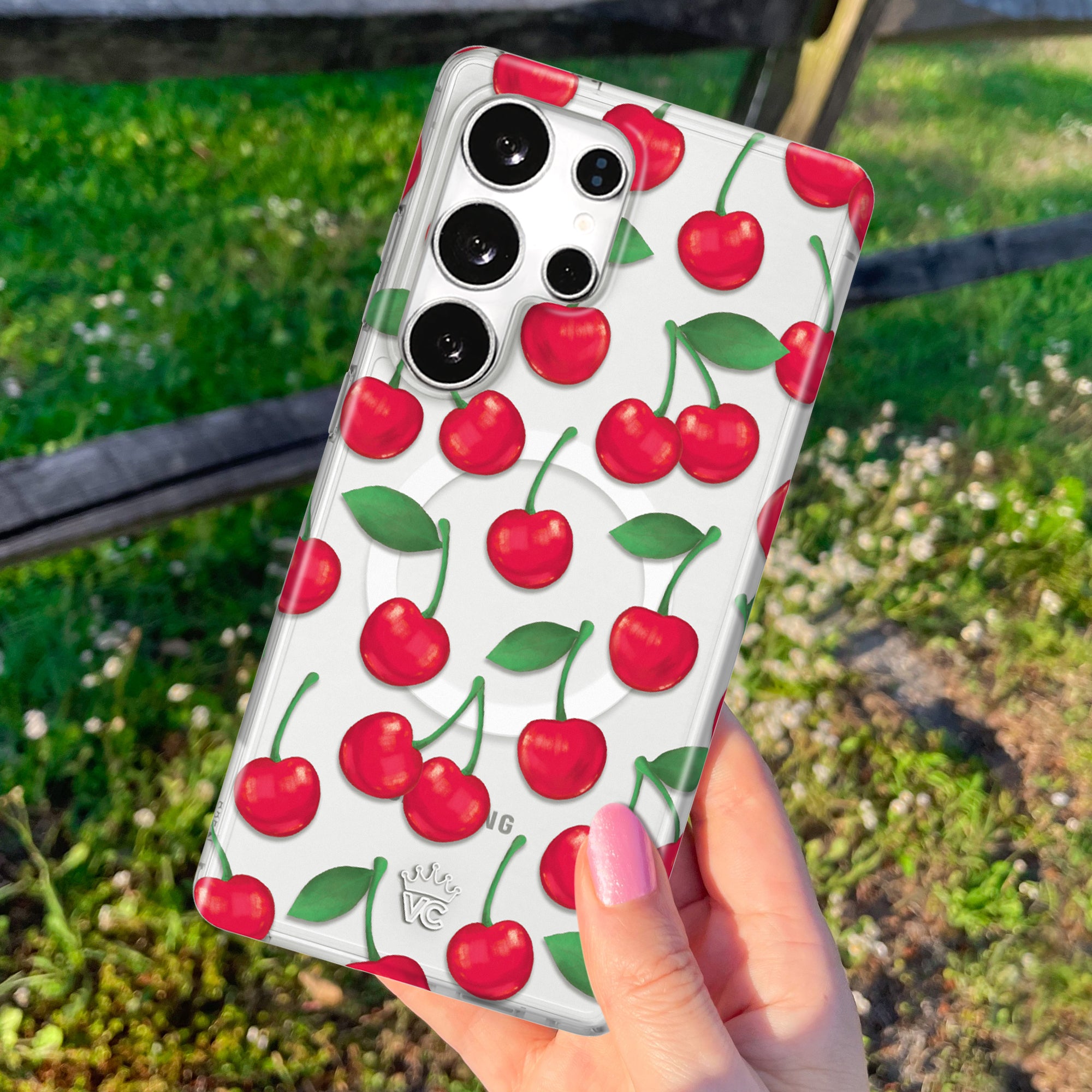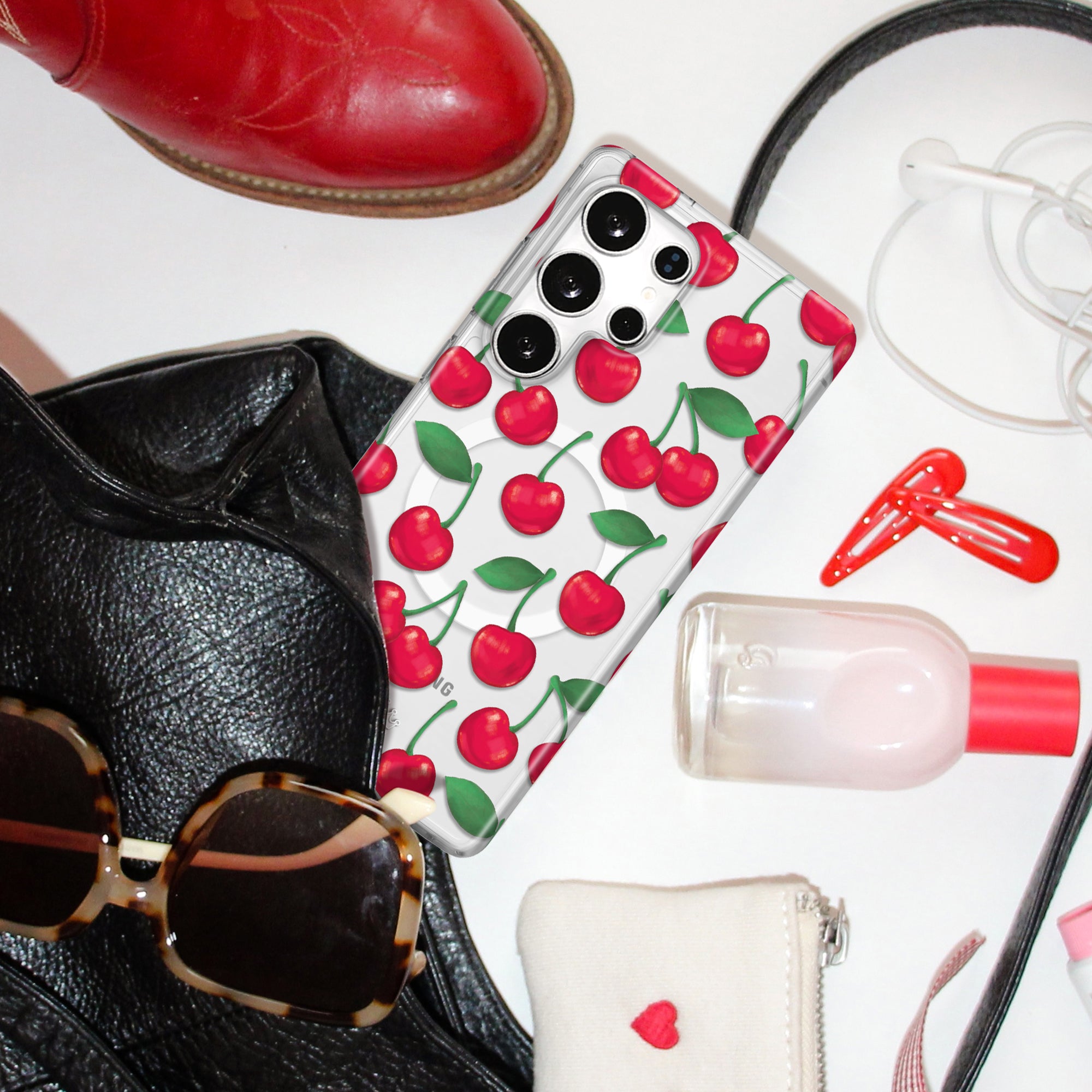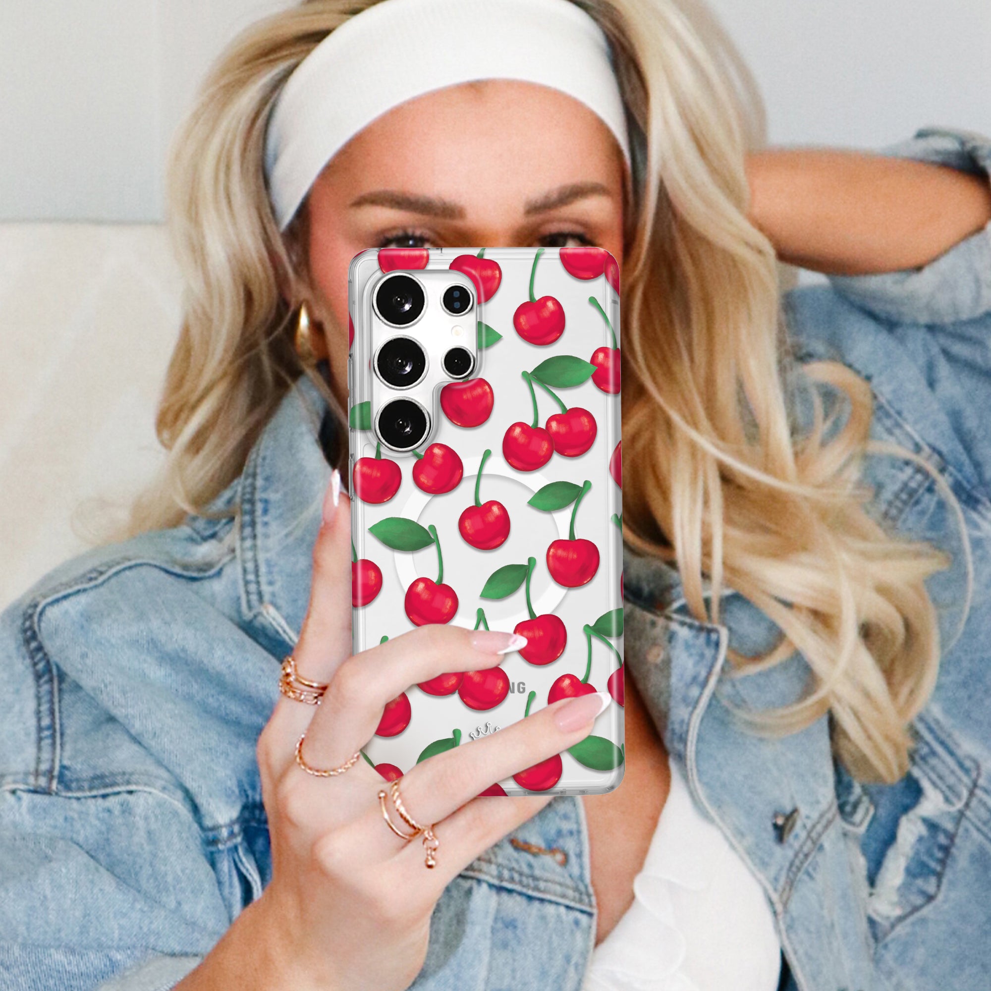 She's cherry cute! This Limited Edition phone case features classic red cherries with green stems on a clear case.