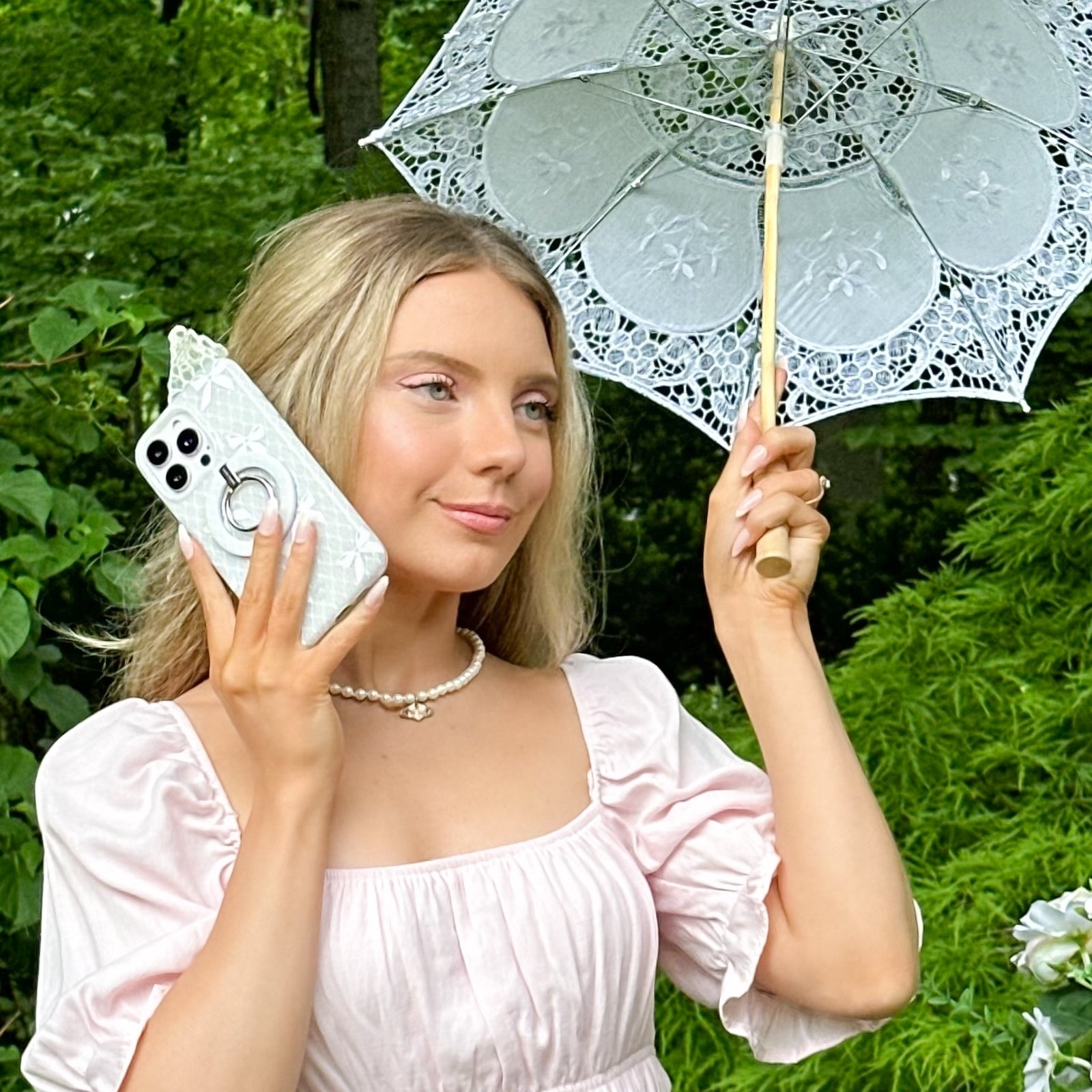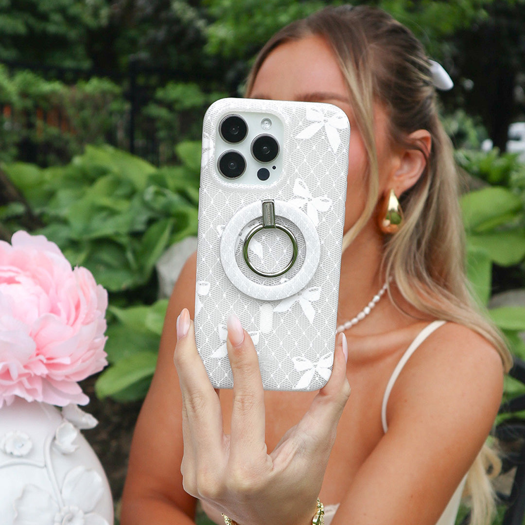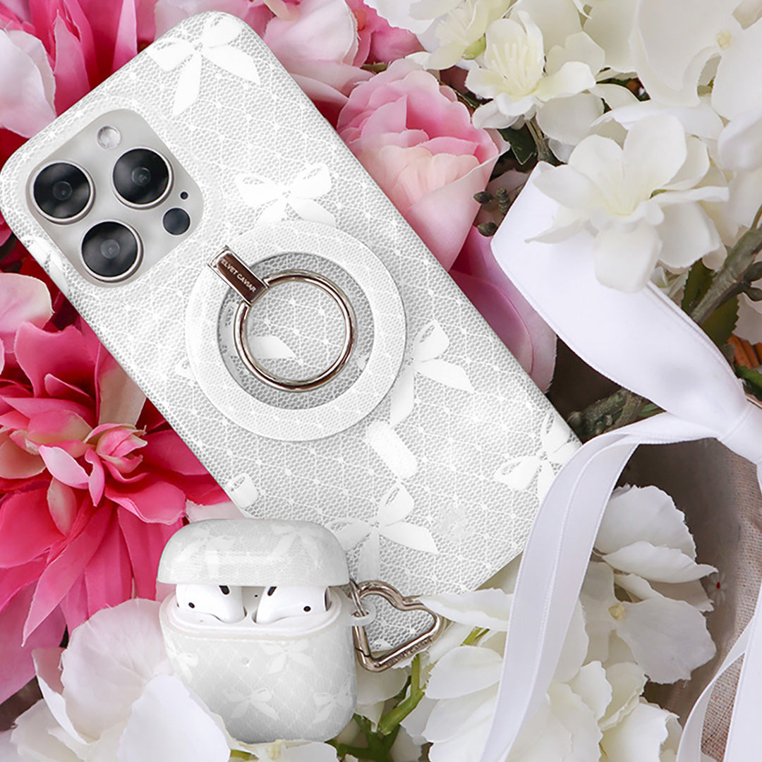 Coquette Core! This Limited Edition MagSafe case was designed with a bride in mind but can be worn by anyone! With a milky clear base and glossy lace and bow detailing this case is sure to turn heads.