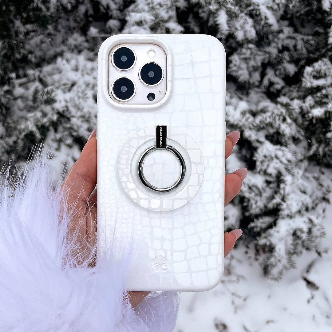 Classic and Luxe. This ultra-protective case features a glossy embossed crocodile pattern on a monochromatic matte white base.