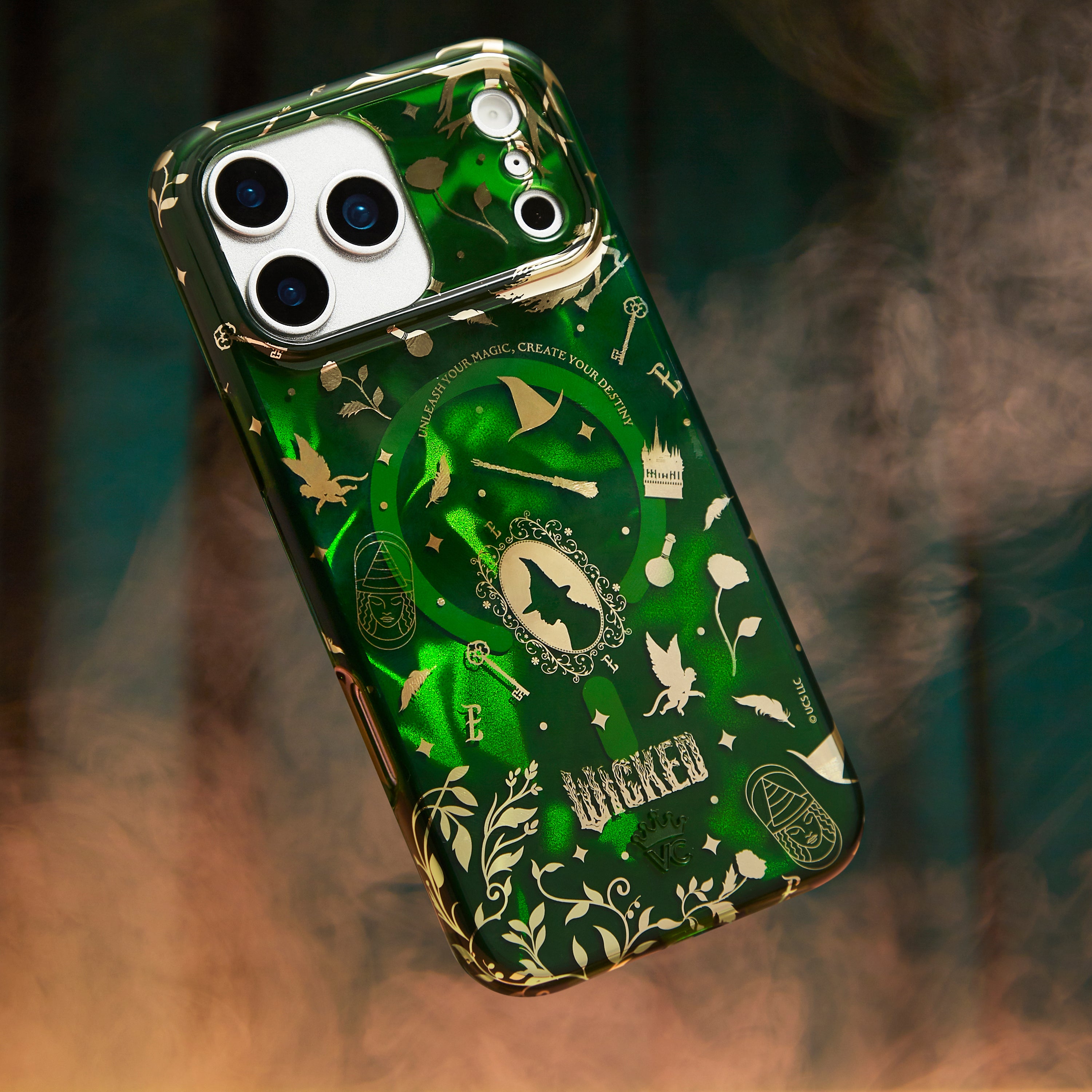WICKED x Velvet Caviar! This holo MagSafe case features Elphaba all over with gold chrome flying monkeys, brooms, and hats throughout all on a holographic green base.