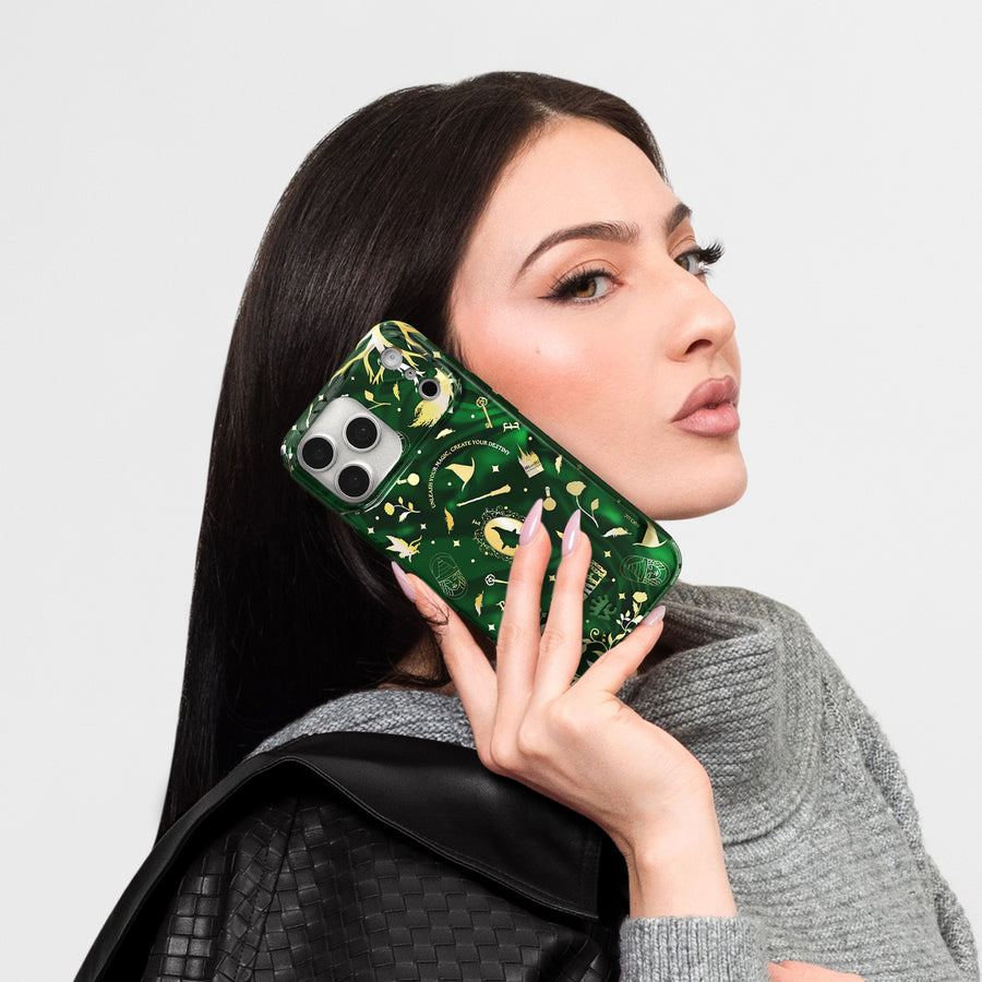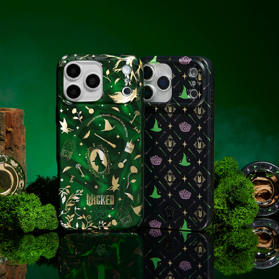 WICKED x Velvet Caviar! This holo MagSafe case features Elphaba all over with gold chrome flying monkeys, brooms, and hats throughout all on a holographic green base.