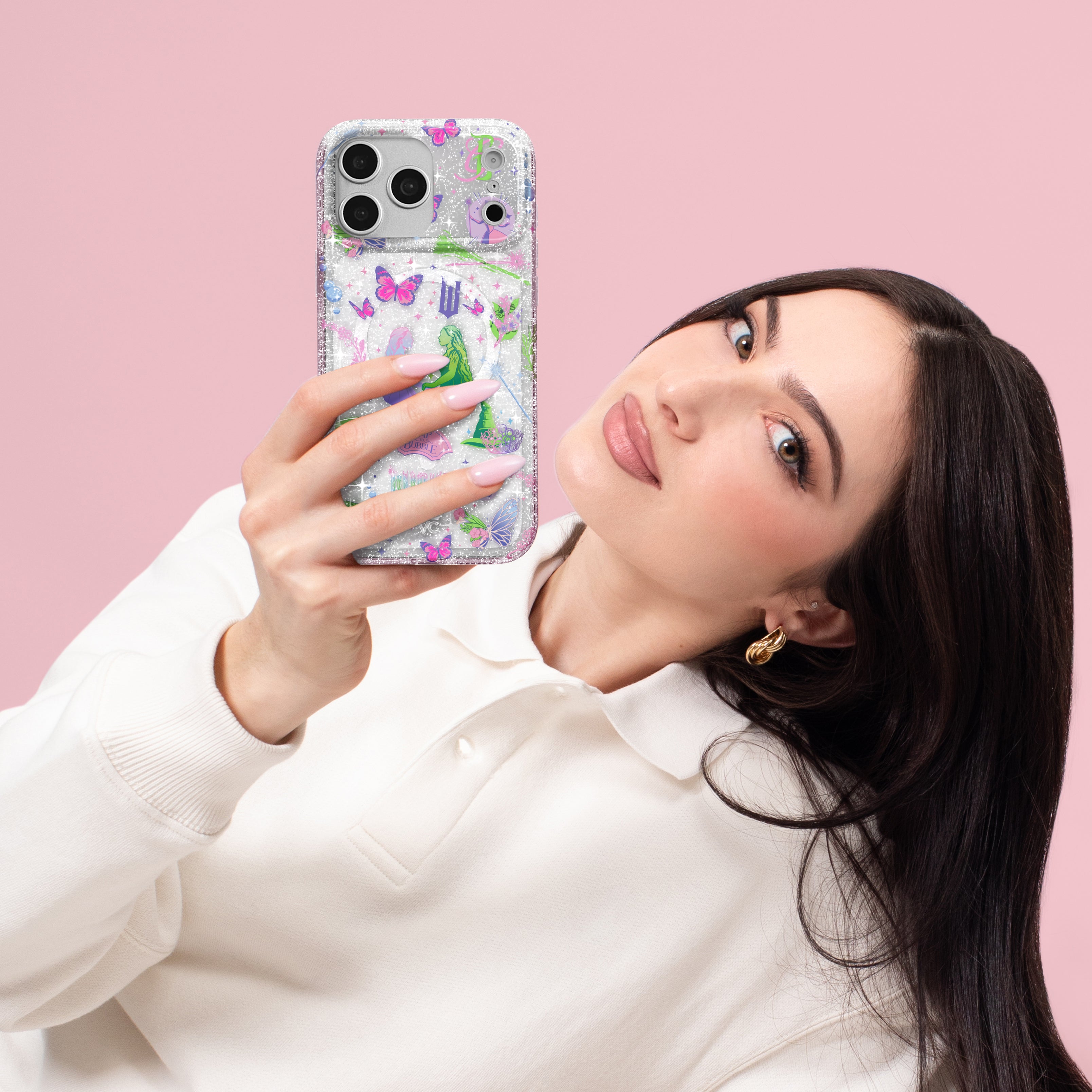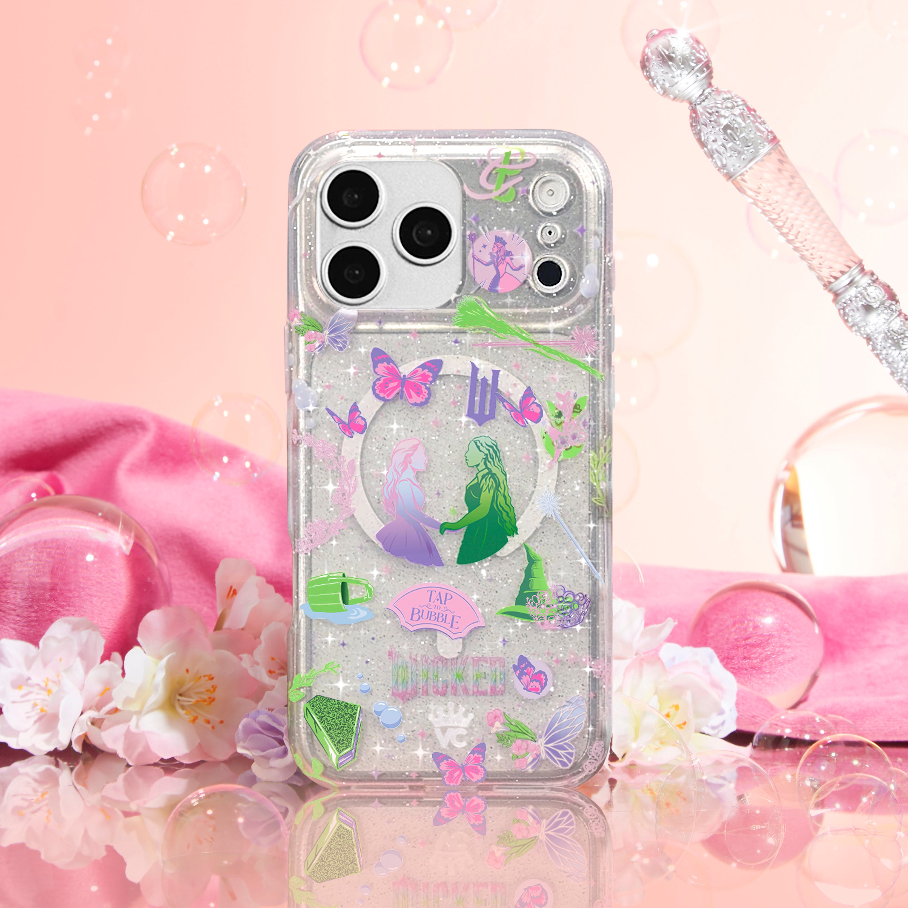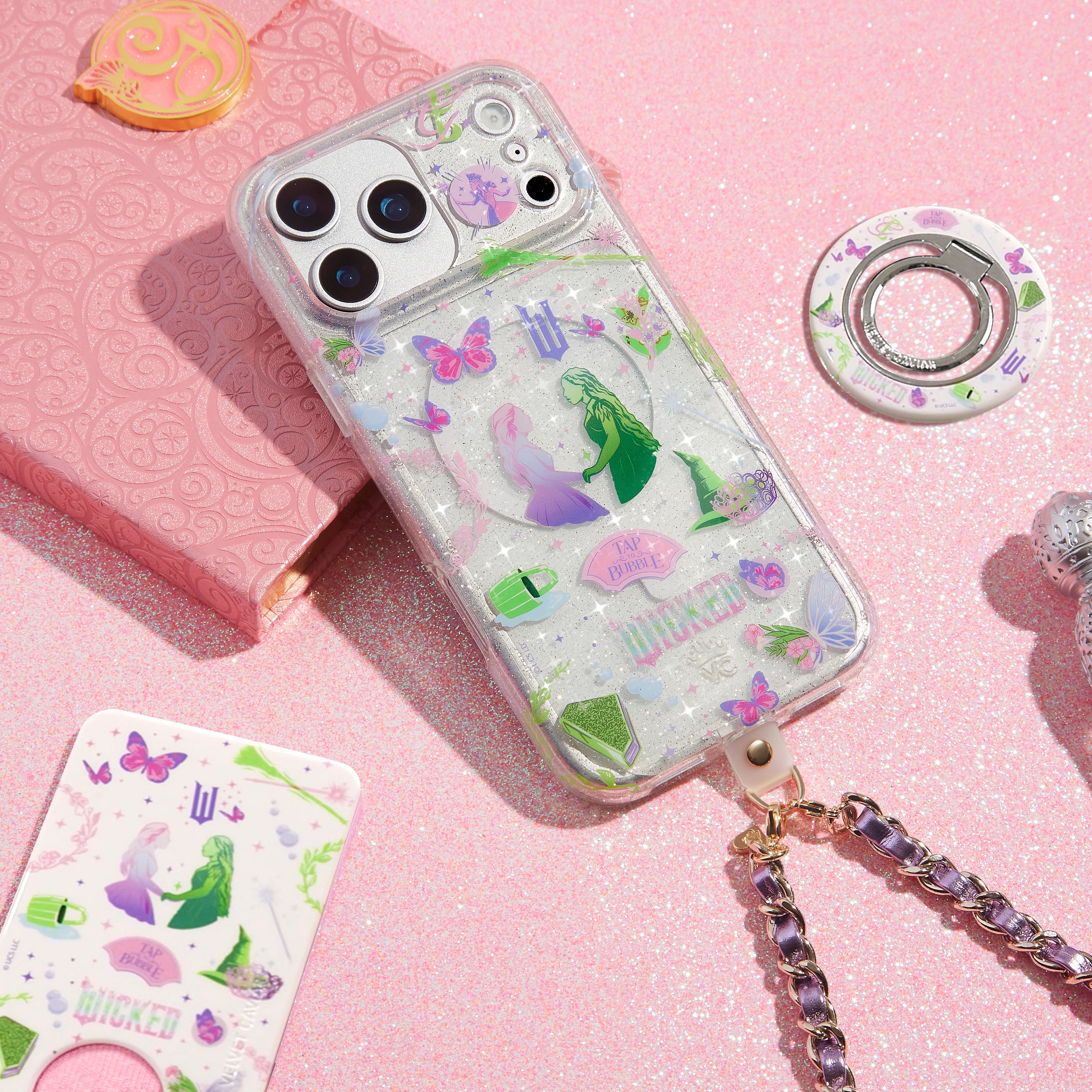 WICKED x Velvet Caviar! This glittering MagSafe case features Elphaba and Glinda front and center with iconic WICKED references in tonal shades of pink, green, purple, and blue throughout.