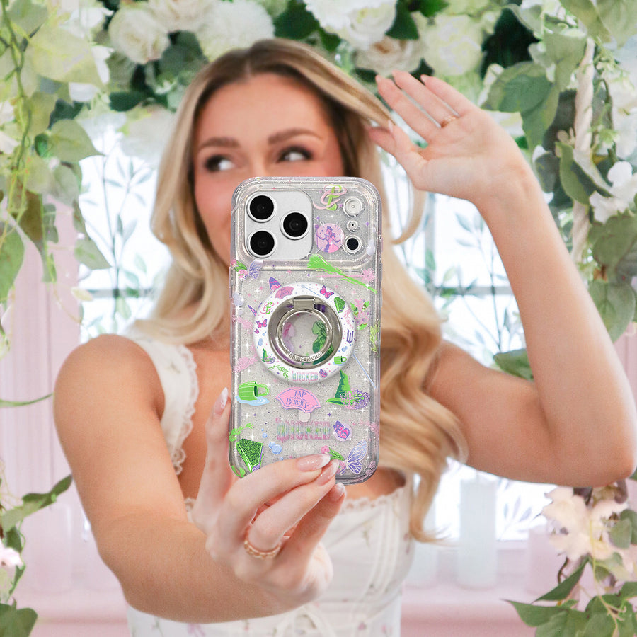 WICKED x Velvet Caviar! This glittering MagSafe case features Elphaba and Glinda front and center with iconic WICKED references in tonal shades of pink, green, purple, and blue throughout.