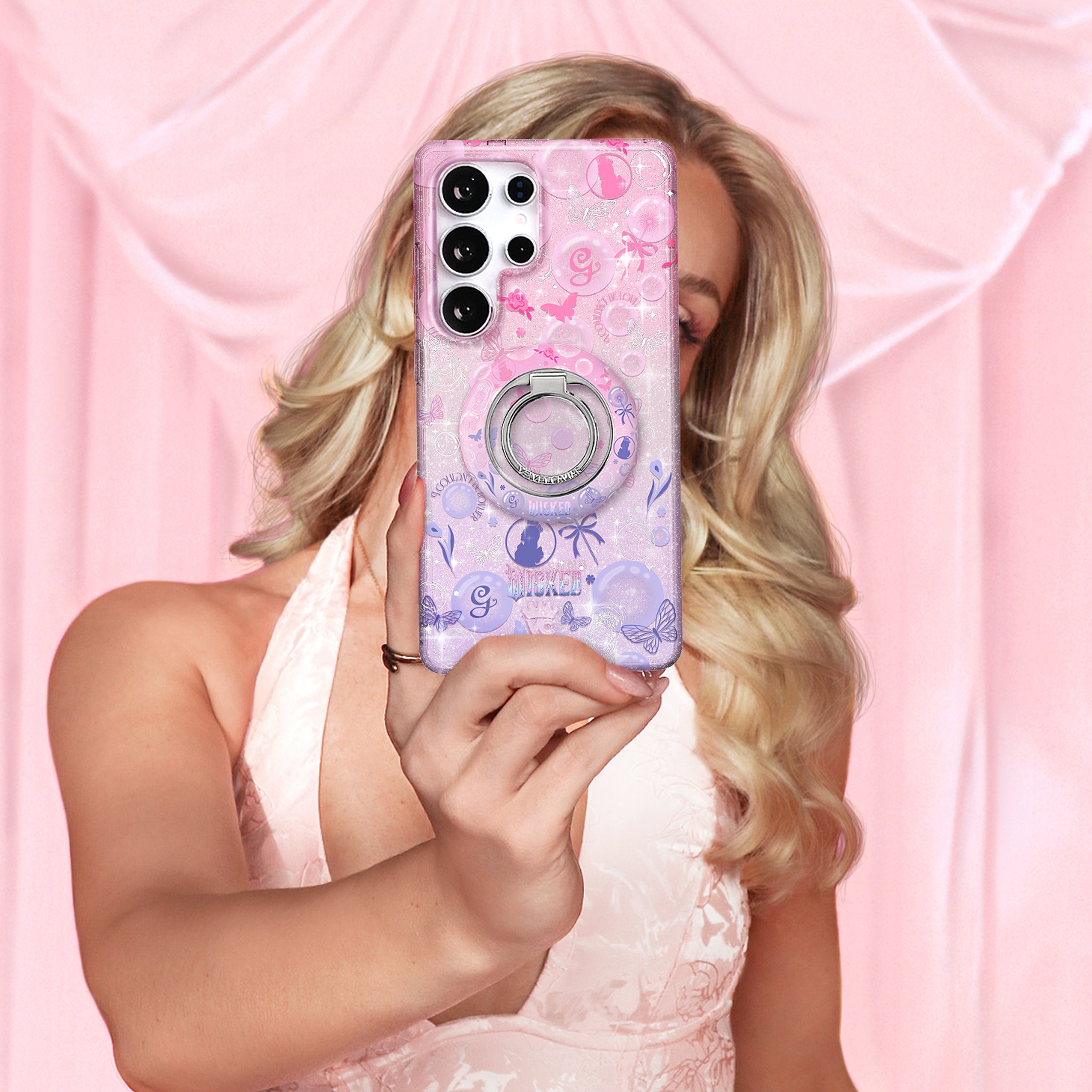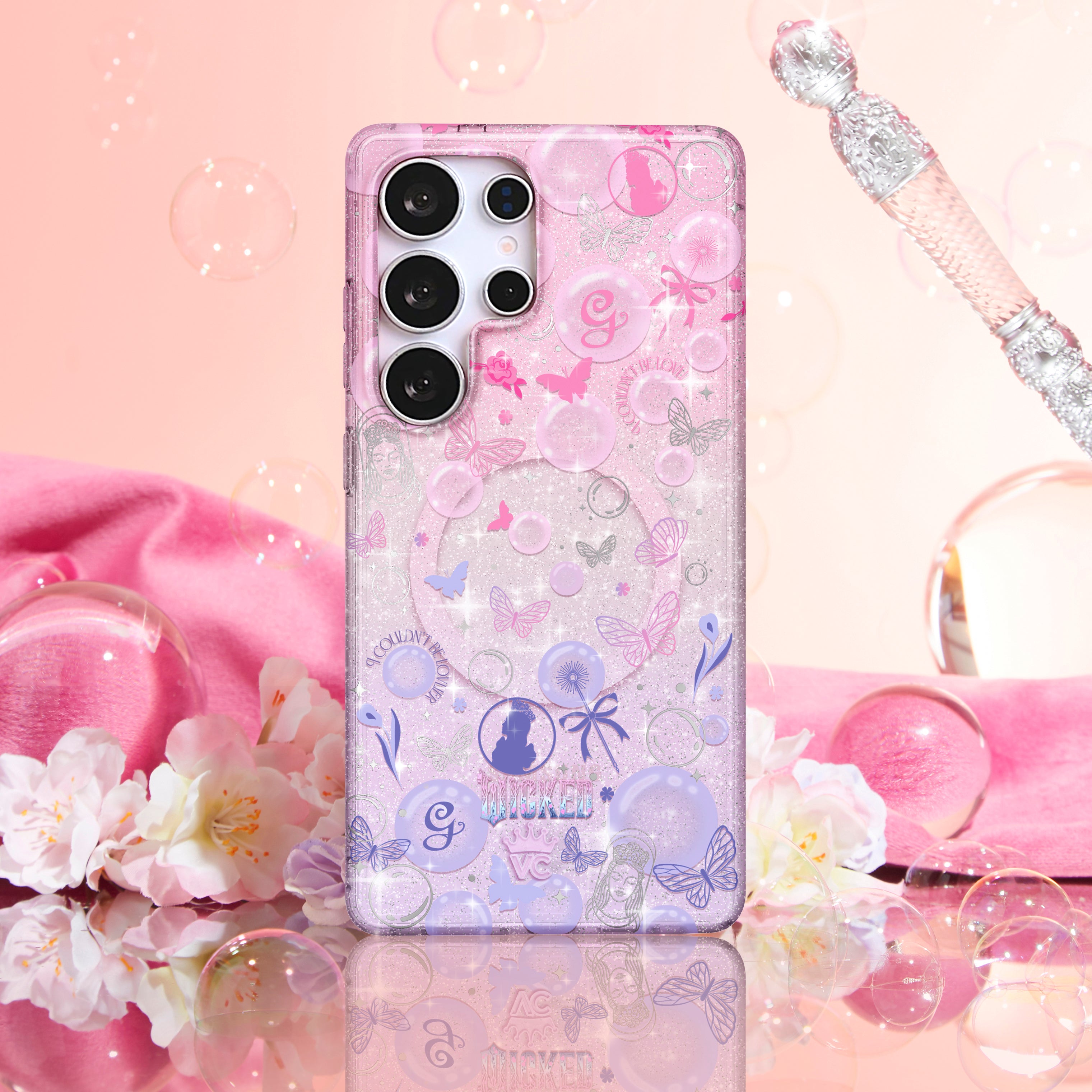 WICKED x Velvet Caviar! This glittering protective case features Glinda all over with pink and purple floating bubbles on a subtle pink to purple ombre clear base with stunning silver glitter.