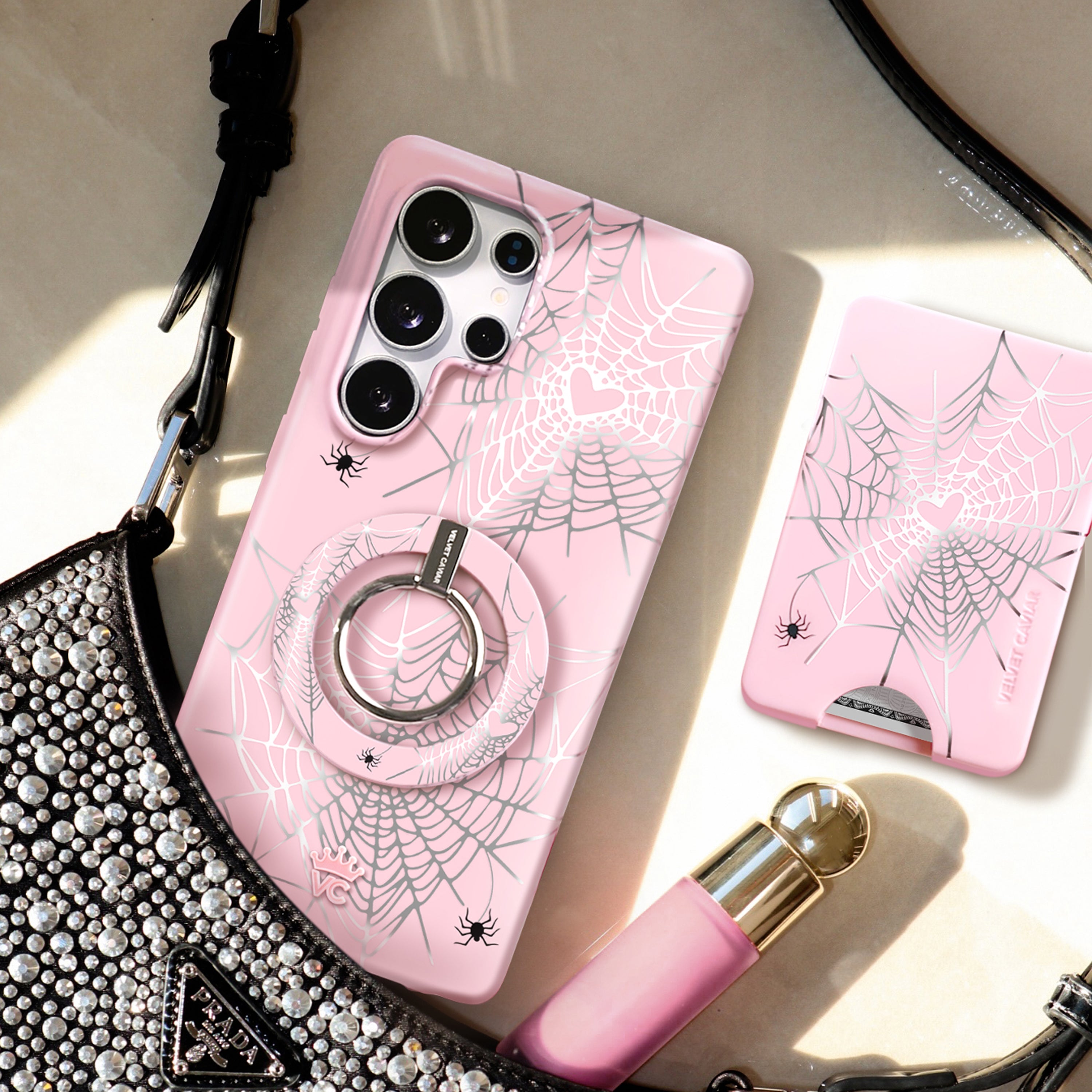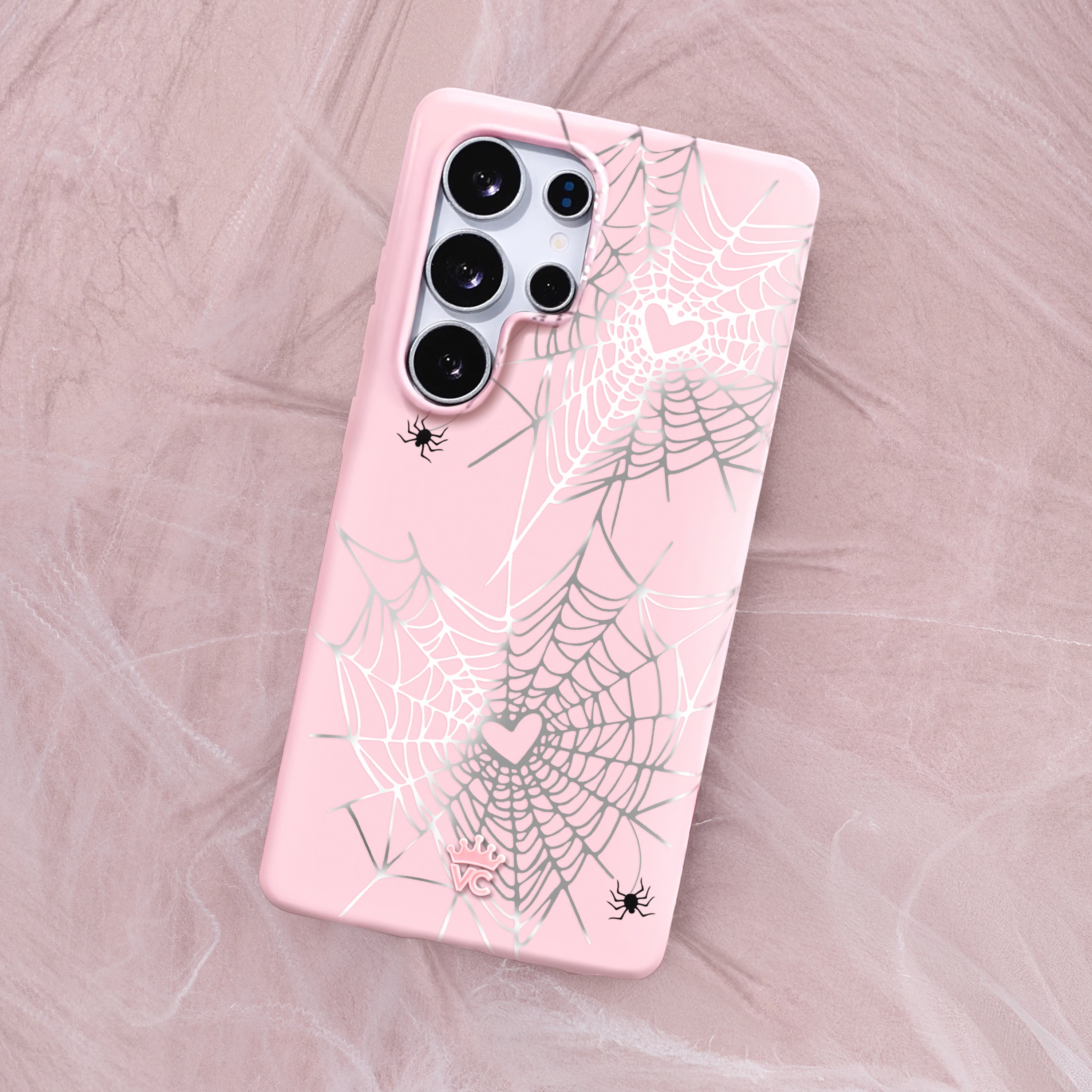 Happy Halloween! This protective case features silver chrome spider webs and small black spiders on an peachy pink base.