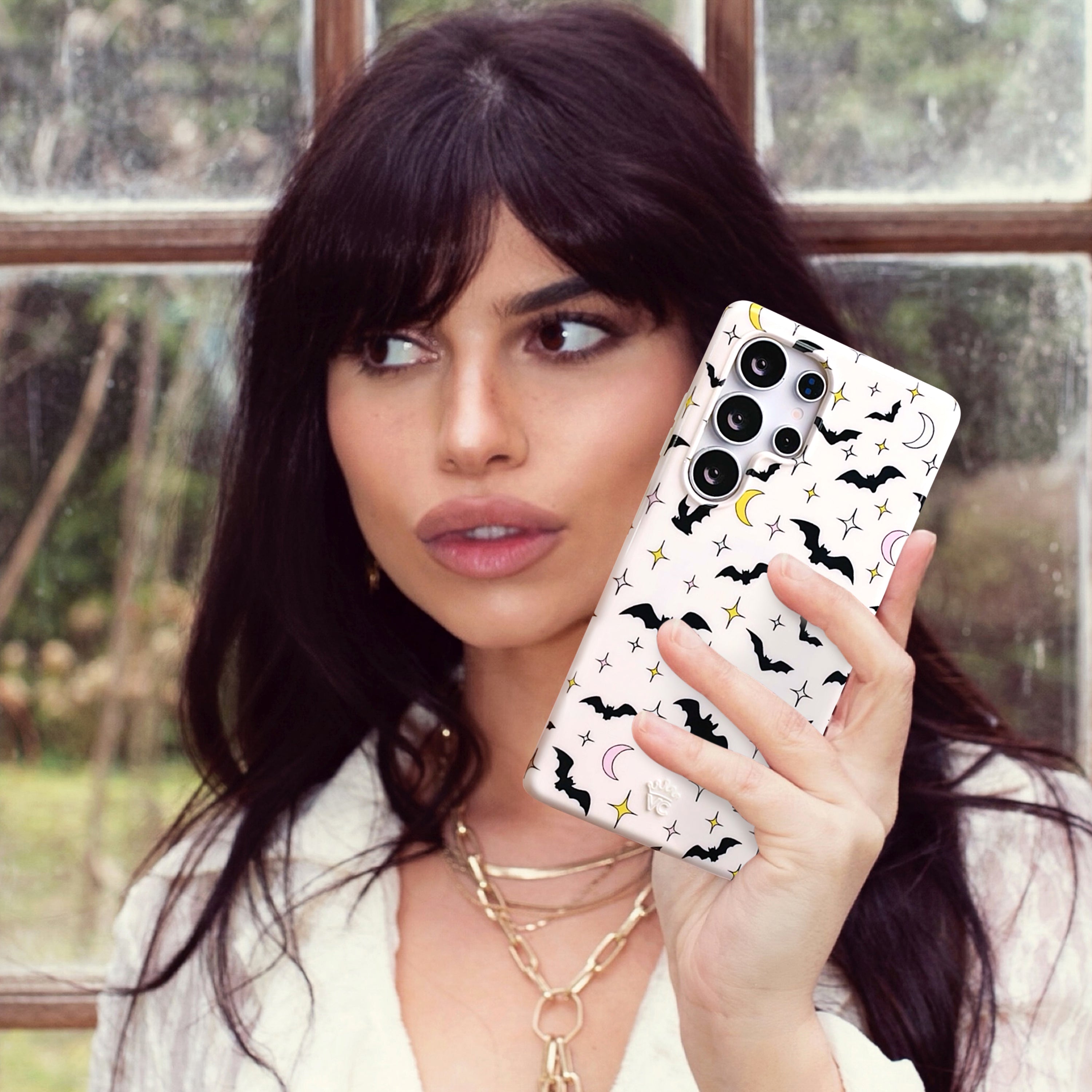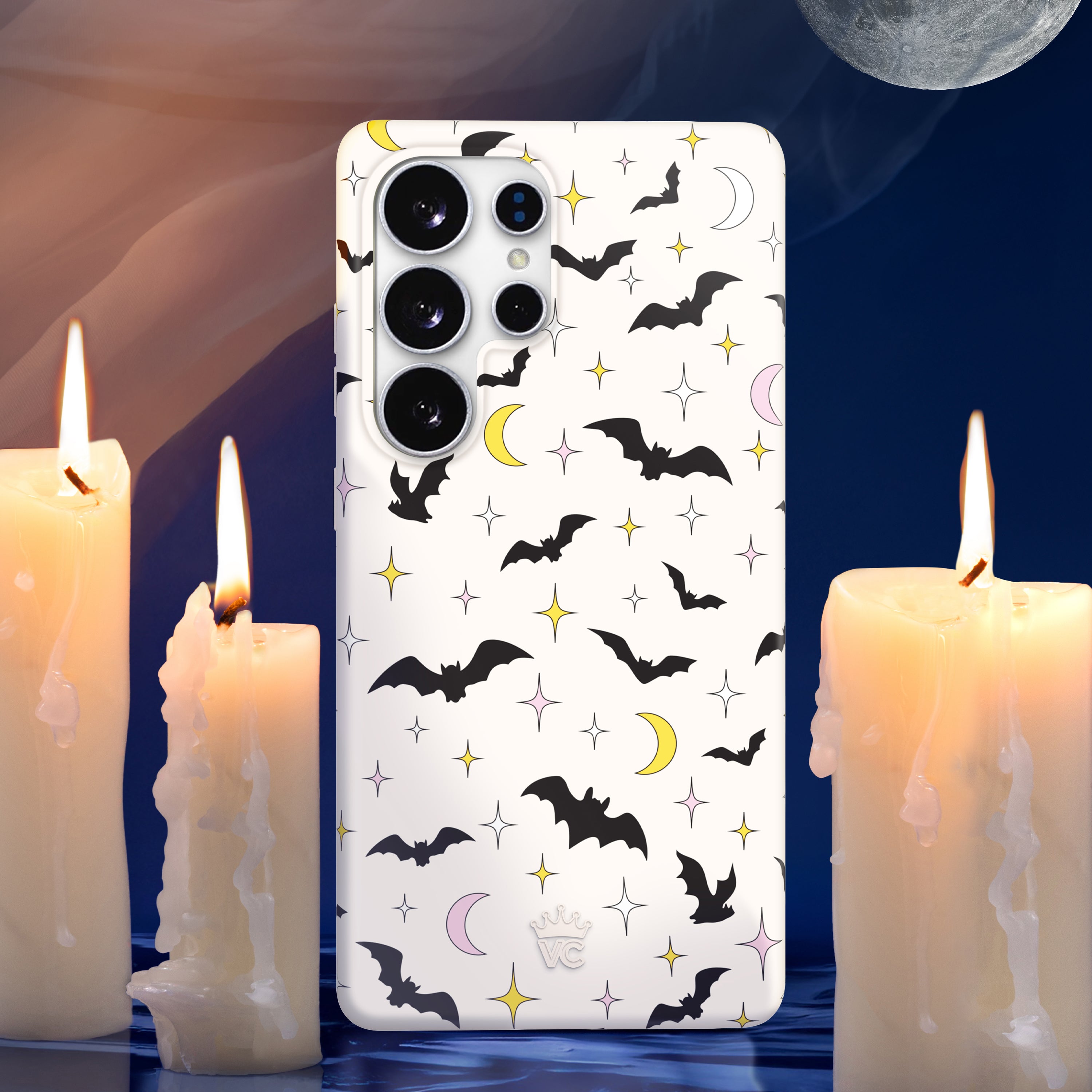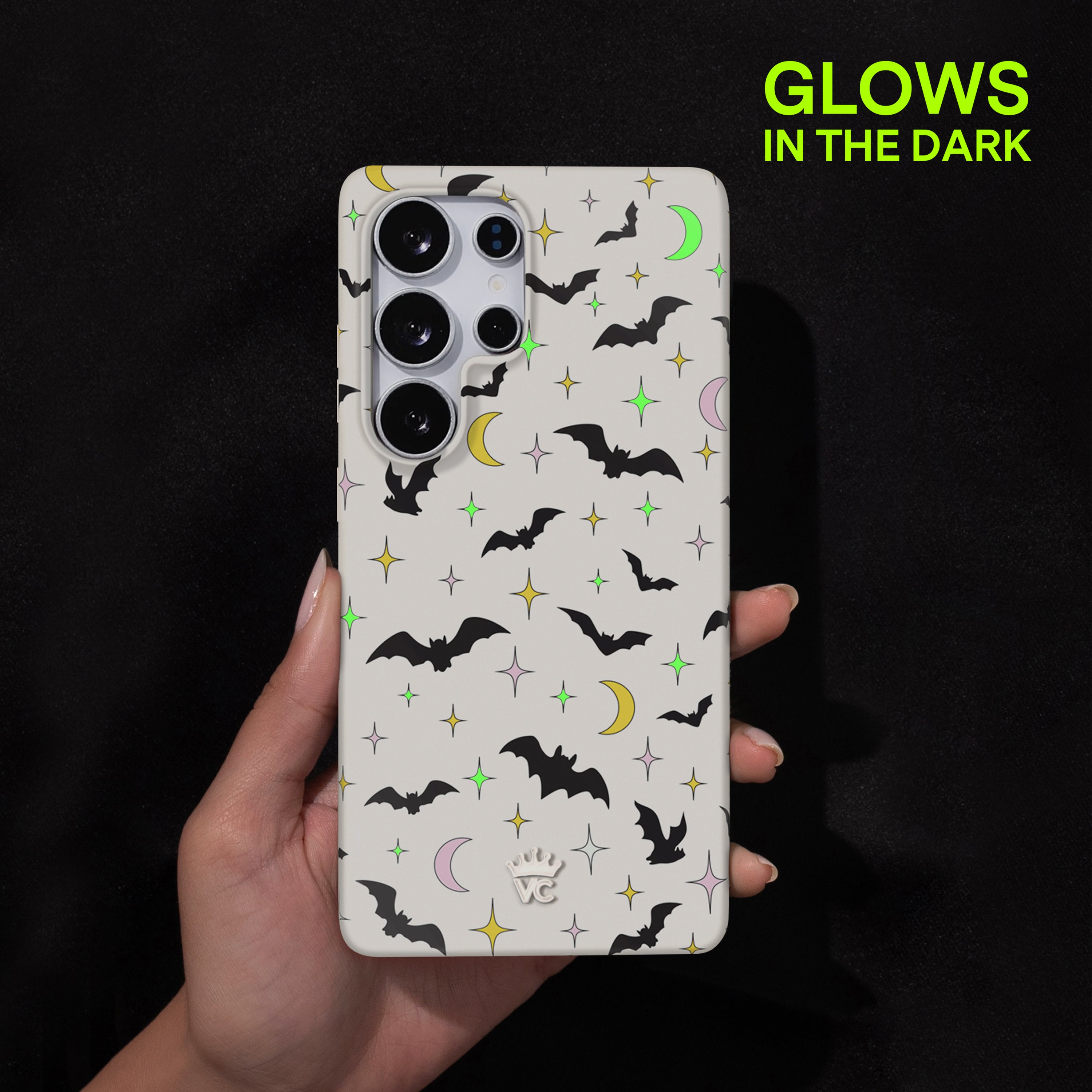Happy Halloween! This glow in the dark protective case features celestial stars, crescent moons, and spooky bats on an off-white base.